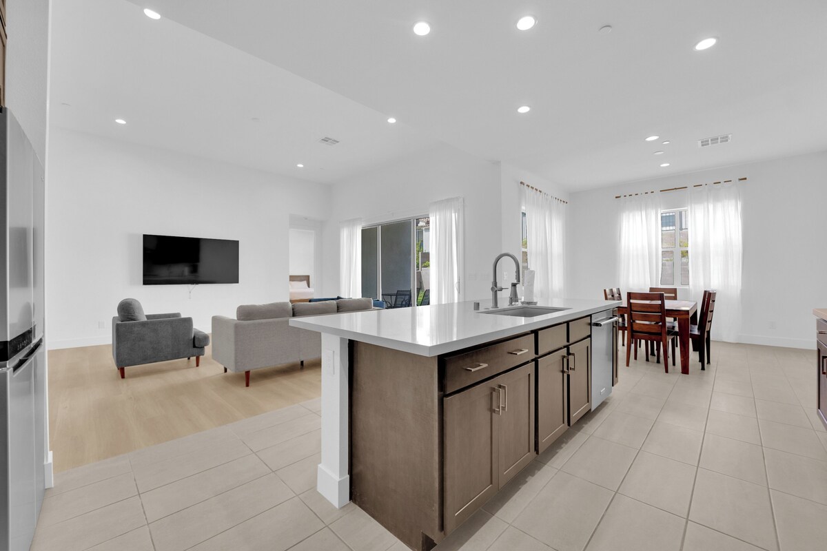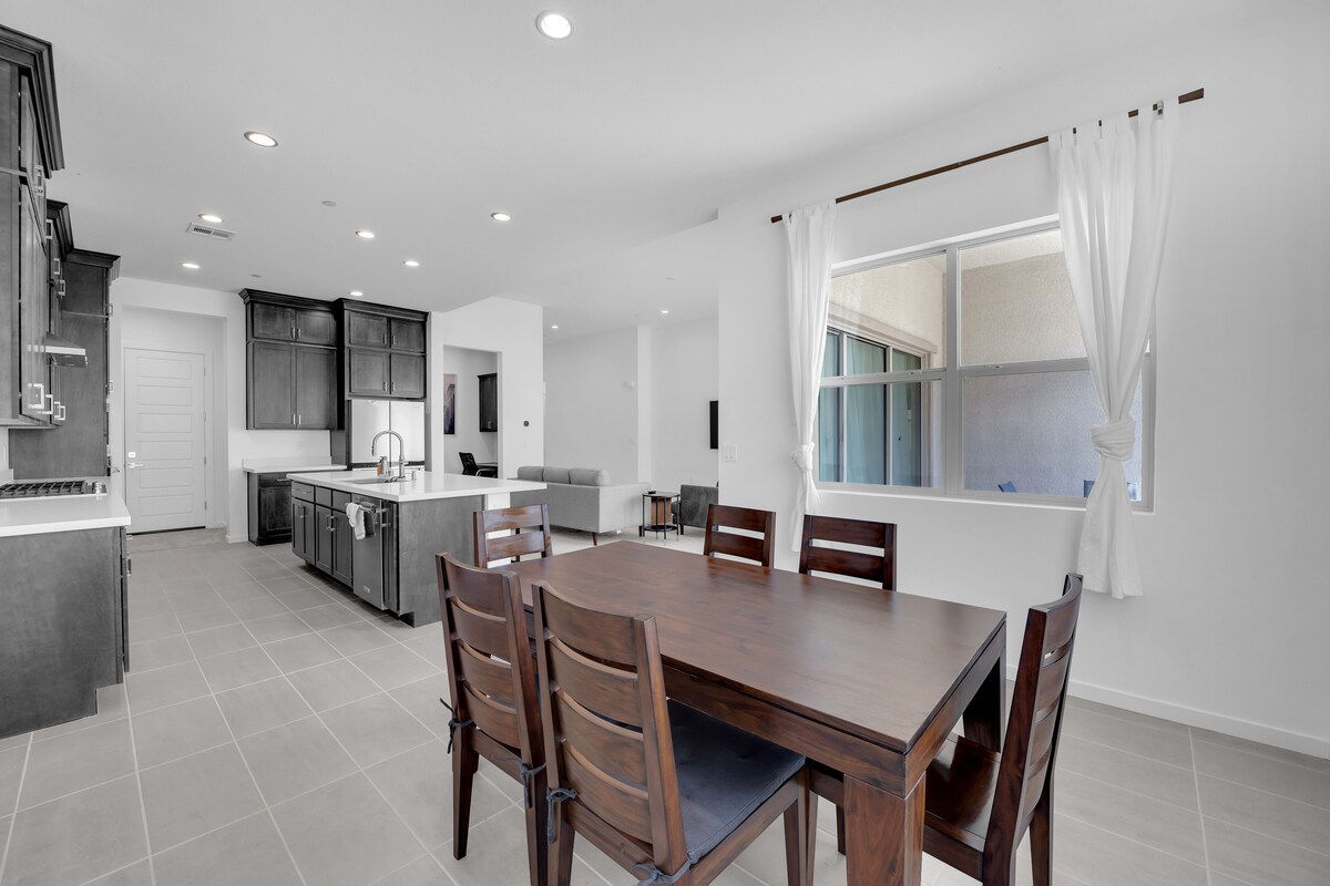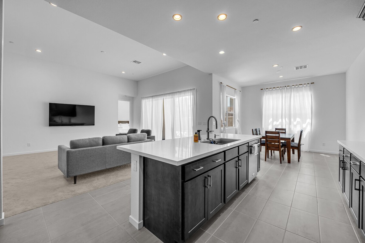 Welcome to Our Brand-New Modern Retreat in Summerlin Nestled in a gated community in the heart of Summerlin, this single-story home is the perfect getaway. With 12-foot ceilings and an open-concept design, the space exudes modern elegance and comfort. Conveniently located just minutes from the stunning Red Rock Canyon, this stylish retreat offers the best of Las Vegas living. Step inside to find: Spacious Living Area: Contemporary furnishings, chic decor, and an abundance of natural light create a relaxing and inviting atmosphere. Entertainment: Smart TVs in all three bedrooms and the living room to keep everyone entertained. Work-Friendly Amenities: A dedicated workstation in the master bedroom, an additional workstation in Bedroom 1, and a third workstation in the living room ensure ample space for productivity. High-Speed Wi-Fi: Stay connected seamlessly throughout your stay. Bedrooms: Cozy and well-appointed spaces to ensure a restful stay. Outside, the beautiful backyard is perfect for unwinding, with plenty of space to relax or play. Plus, the home is pet-friendly, making it ideal for travelers with furry companions. Whether you’re here for work, a family getaway, or to explore the outdoors, this thoughtfully designed retreat will make your stay unforgettable. Our prices include all fees. No hidden fees.