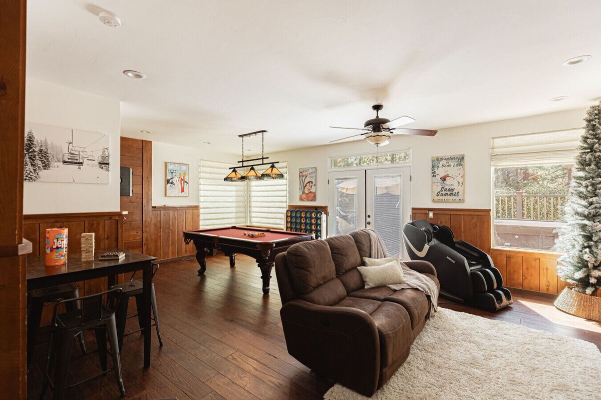Rustic Upscale Two-Story Big Bear Lake Retreat in the heart of Big Bear Lake you can walk to the Lake from the cabin. Close to everything including boating, wake boarding, snow tubing, Alpine Mountain Slides, skiing, snowboarding, Village shops, restaurants with 4 Bedrooms and 3.5 baths this is perfect family and friends retreat to getaway from the city life and enjoy clean air, tree-lined views and a beautiful lake and starry skies and play one of many games. Knoll Lake Cabin is a large Rustic cabin that sleeps up to 10 with theater seating and games including pool table, and is a short walk to Big Bear Lake with large dual decks and a private large gated backyard. Master Bedroom is located upstairs with a private deck and ensuite bathroom with shower (no bath) with a king bed and a Smart TV Bedroom 2 has a King bed with a Smart T.V Bedroom 3 has a full size bed with a Smart TV Bedroom 4 has a set of queen bunk beds and a Smart TV Pet Friendly- We accept up to 2 dogs. ($85 per dog) Close to all - the Lake, Village, the slopes, and more this is in an upscale area of Big Bear Lake within walking distance of the Lake. Close to all - the Lake, Village, the slopes, and more this is in an upscale area of Big Bear Lake within walking distance of the Lake. ou will be within a short walk to the Lake, Alpine slides, the Village and the slopes it’s truly an amazing stay at Knoll Lake cabin whether in the fall, summers on the Lake or in the large private backyard and front yard building snowmen or hitting the slopes this the perfect central location in an amazing upscale neighborhood. ****We cannot grant access to the cabin until the rental agreement is signed with the Good Neighbor Brochure - please note no code will be sent earlier than 4pm and only with the signed agreement per the City of Big Bear Lake**** Parking: The City of Big Bear Lake limits Parking to a maximum of 4 vehicles for the house. No Street Parking is allowed in any residential neighborhood. All trash must be taken off-site per Big Bear Lake rules that will be emailed to you or it is $25 per bag left behind. All occupants must be disclosed as Big Bear Lake is strict on occupancy and vehicles you cannot exceed either or it is subject to immediate eviction without refund and $200 per person over 10 person occupancy. No music per Big Bear is allowed on the property line and Spa hours are prohibited between the hours of 10pm-8am per our permit and City rules. Village distance: 8 minutes away from the home. Slope distances: Snow Summit is 10 minutes away from the home. Bear Mountain Ski Resort is 14 minutes away from the home. We have high chairs and pack n plays available at our office for rent for a fee of $25 per day for each or as a packaged deal, please notify us in advance if you would like to rent these during your stay. To comply with our city permit, there is a $35 charge for dish cleaning in case they are not washed before your check-out. If there is trash in the property, there will be an additional charge of $25 per bag. Any guest that violates county or city rules as outlined in our `things to know` and `house rules` sections will be subject to paying a $350 call code attendance fee by our 24:7 call compliance staff in addition to any fines levied by the city, whether it results in a violation or not. Please remember these rules are mandated and imposed solely by the CITY and our PERMIT/ORDINANCE which requires property management companies to notify all guests that the CITY requires you to sign a rental agreement and the Good Neighbor Brochure to obtain the code to the property as well as provide a copy in the rental agreement app a copy of Governmental ID that matches the name on the reservation. Please notate these and all rules regarding spa hours, trash removal, noise and dishes being washed are due to our permit and not our rules so please keep this in mind before booking as some guests rate us based on rules we must abide by to rent. We appreciate that they are unique rules please do not review us based on the reviews we need to follow, we appreciate it. The code cannot be sent until this agreement is filled out. (1) Maximum vehicles and guest occupancy permitted is described in the listing. Any violation is subject to eviction and/or cancellation of your stay. If you need additional parking, please contact us directly. (2) Big Bear Lake does not allow street parking; they will tow any vehicles parked on the street and any towing fees or fines issued are the sole responsibility of the vehicle owner. (3) Excessive noise or loud music heard at the property line is prohibited by the CITY for the consideration of the local residents. The CITY enforces quiet hours from 10:00 PM – 7:00 AM and will send out code enforcement officers to issue fines/and or evict guests for any violations reported. There will be a $300 administrative fine per Code Call for our team to show up as we are required to attend such code call within 30 minus, plus $100 per hour of our time spent for the violation. This is IN ADDITION to any fines issued by Code Enforcement which start at $500 to $5000 per violation. (4) Dishes - All dishes must be cleaned before leaving and the house must be left in the same condition that you found it in. Any dirty dishes left in the kitchen are subject to a $45 fee- our housekeepers will unload dishes or put them away but do not wash dishes or dump trash per the law this includes leaving dishes with food on them or left in the home. It also attracts vermin. Please note this is part of our permit and not included in cleaning the home after guests leave. (5) Trash - All trash must be removed offsite to the free trash sites. Any bags or trash left behind in the bathroom, kitchen (including leaving behind items in the fridge, or outside is subject to a $25 per bag for removal this is not our rule - this is the law and we must abide by it as there is no trash service due to wild animals. Please do not review us b