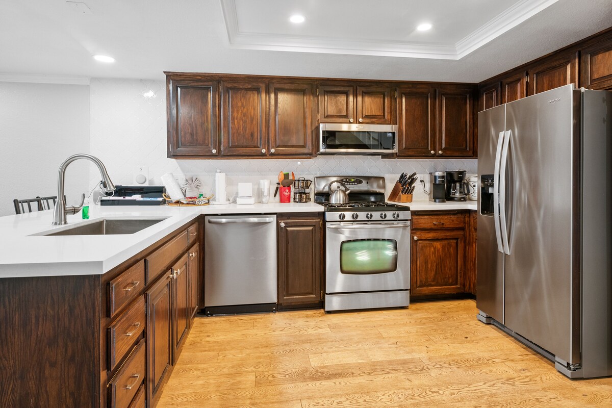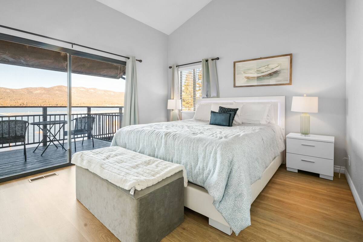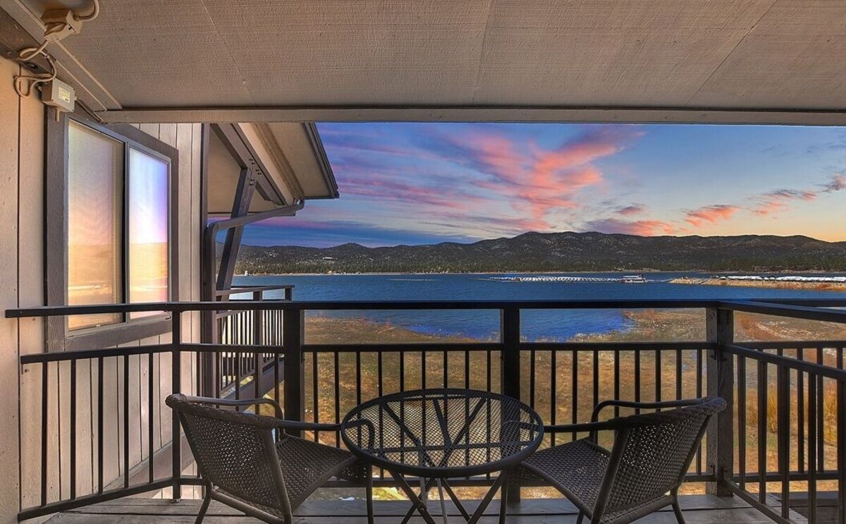 The Lake is up, and the views are spectacular from this recently renovated lakefront condo. This lovely tri-level condo is perfect for enjoying the 4th of July fireworks. Ideal for both families and groups, the condo stands just off the shores of the lake and has a plethora of balconies that offer sweeping views of the water and mountains beyond. Modern laminate flooring throughout, custom ceramic tile in the bathrooms, central heating, and AC in both bedrooms. Located just steps from the Village shops and restaurants. LIVING SPACE - Spacious 1400+ sq ft home with living room, TV, dining table, bar seating, a beautiful gas fireplace, and plenty of comfortable living room seating. ROOMS & BEDS - 2 bedroom, 2 bath. Third level master bedroom has a king bed, smart TV, bath, and balcony. Third level second bedroom has a queen/twin bunk bed and smart TV. Living room has a sleeper sofa. Extra blankets and pillows are available. KITCHEN - Corian kitchen counters, stainless steel appliances, stove with oven, refrigerator with water dispenser and ice maker, microwave, toaster, Keurig, coffee maker, dishes, pots/pans, and more. AMENITIES - Seasonal community pool and spa. Smart TVs, Apple TV, streaming apps along with fast WiFi. Board games and card games. Relax near the gas fireplace and watch your favorite movie in the evening. Laundry area with stackable washer/dryer. OUTDOORS - Make your way out the glass sliding doors to the upper deck area for a beautiful sunrise or sunset view, you can also enjoy sipping a cocktail at the outdoor dining table while you grill up some amazing food on the propane barbecue. Community pool and hot tub. Lakehouse Retreat offers a private dock. PARKING - 2 car community parking The lake levels vary throughout the year and cannot be guaranteed at the time of your stay. Close to National Forest hiking trails Lake - Lakefront Village - close walk Snow Summit - 2 miles Bear Mountain - 3.7 miles Other things to note: Big Bear Lake local ordinance 99.300 limits maximum occupancy to 7 people (6 adults max). Children, toddlers, and infants do count as a person. Occupancy is permitted per City Ordinance - over occupancy could result in a fine or non-refundable eviction. Pool key deposit $50 Pet fee $75 per pet (dogs only) Check in: 4 pm Check out: 11 am Our prices include all fees. No hidden fees.