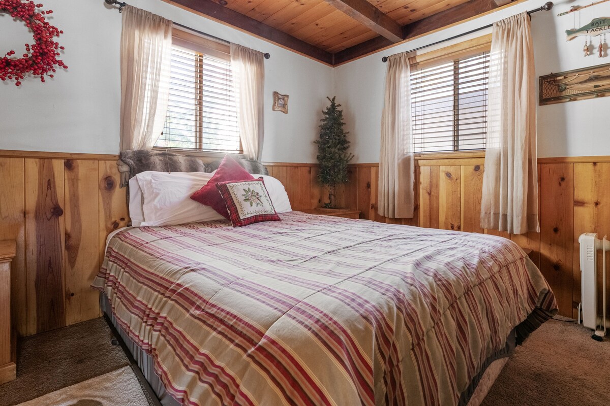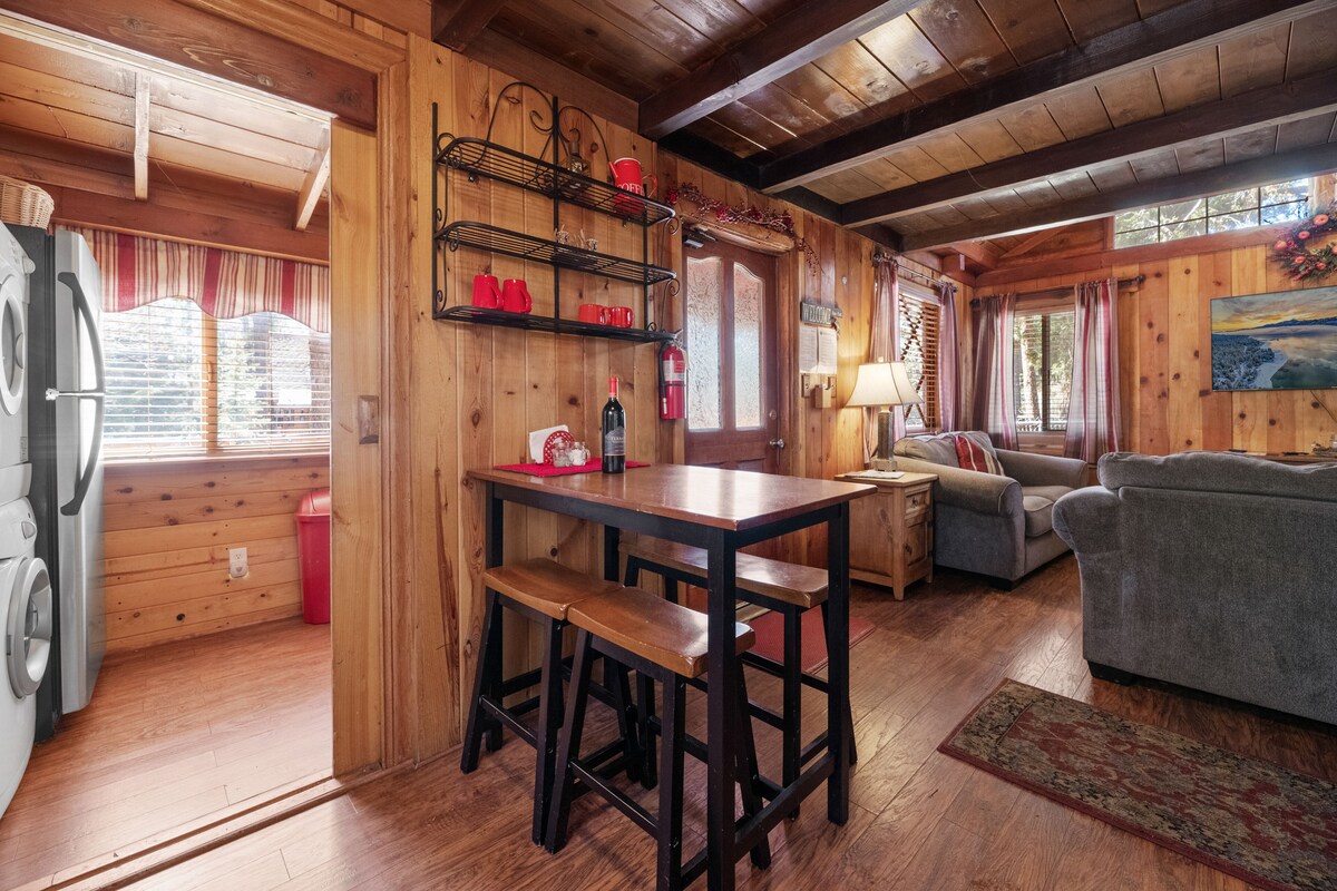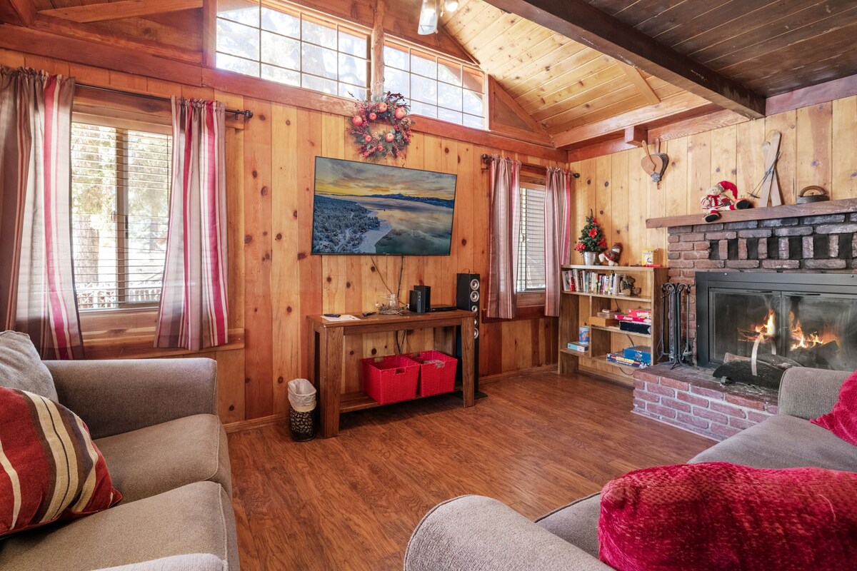 Nestled in the highly sought-after Moonridge area, just minutes away from ski slopes, the lake, the zoo, dining gems, and the newly developed Moonridge Corridor, this cozy 1950s cabin is a true gem waiting to be discovered. Step into the enchanting ambiance of this vintage cabin, where every detail exudes the charm of a classic mountain retreat. Begin your day on the spacious front porch, sipping your morning coffee and breathing in the crisp mountain air. In the evenings, let the porch become your haven for unwinding after a day filled with outdoor adventures. Your ideal mountain getaway awaits at Little Bear Hug! LIVING SPACE - Cozy 500+ sq ft home with living room, TV, dining table, a beautiful wood burning fireplace, and plenty of comfortable living room seating. The open living room welcomes you with knotty pine walls that radiate warmth, anchored by a rustic wood-burning brick fireplace that promises cozy evenings. ROOMS & BEDS - 1 bedroom, 1 bath. Bedroom has a queen bed and ceiling fan. The living room has a sleeper sofa. Extra blankets and pillows are available. KITCHEN - Equipped for culinary adventures, adding practicality to the cabin's rustic charm with stove/oven, refrigerator, microwave, blender, toaster, coffee maker, dishes, pots/pans, and more. AMENITIES - Smart TV, streaming apps along with fast WiFi, board games, and card games. Relax near the cozy wood burning fireplace. OUTDOORS - Enjoy the mountain views and relaxed atmosphere from the deck with a cup of coffee in your hand. PARKING - 1 car driveway Close to National Forest hiking trails Bear Mountain - 1.4 miles Snow Summit - 1.8 miles Lake - 1.9 miles Village - 2.9 miles Other things to note: Big Bear Lake local ordinance 99.300 limits maximum occupancy to 2 people. Children, toddlers, and infants do count as a person. Occupancy is permitted per City Ordinance - over occupancy could result in a fine or non-refundable eviction. Pet fee $75 per pet (dogs only) Check in: 4 pm Check out: 11 am Our prices include all fees. No hidden fees.