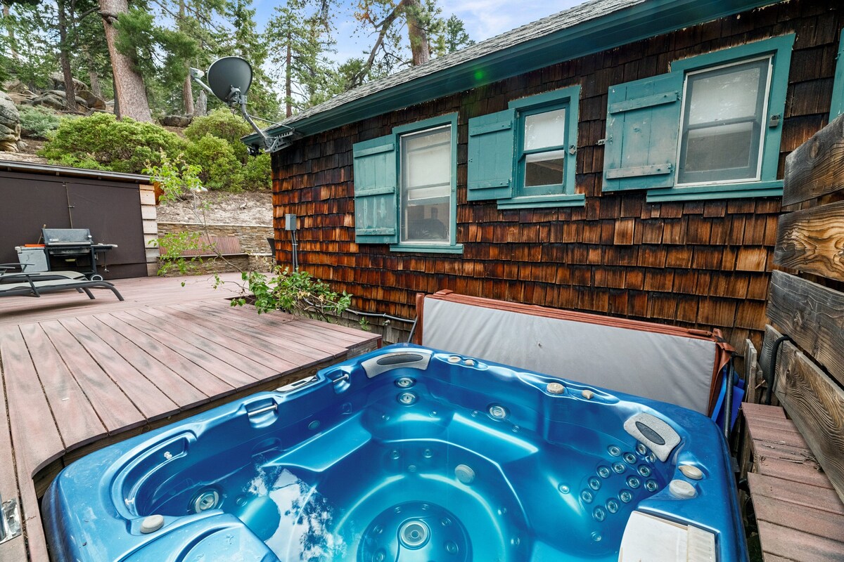 Nestled against the natural rock formations of Boulder Bay and mere steps from Big Bear Lake, this unique Big Bear cabin offers a picturesque setting. Close to National Forest hiking trails, including Castle Rock, Boulder Bay Park, and The Lake. LIVING SPACE - Cozy 700+ sq ft home with living room, TV, ceiling fan, dining table, a beautiful wood burning fireplace, and plenty of comfortable living room seating. ROOMS & BEDS - 1 bedroom, 1 bath. Bedroom has a queen bed. Living room has a sleeper sofa. Extra blankets and pillows are available. KITCHEN - Beautiful custom counter tops, custom cabinets, stove with oven, refrigerator, dishwasher, microwave with convection bake function, Air Fryer, blender, toaster, coffee maker, dishes, pots, and pans. The kitchen also features a breakfast bar for additional seating. AMENITIES - Smart TV, streaming apps along with fast WiFi, board games, and card games. Cuddle up next to the cozy wood burning fireplace on those chilly Big Bear nights. OUTDOORS - Large enclosed back deck with hot tub and outdoor kitchen area with built in natural gas barbecue. PARKING - 1 car driveway. During Winter Months, guests will need chains/cables to get to the home or a 4-wheel drive vehicle, as it is partially unpaved. Lake - close walk Oktoberfest - 1.9 miles Village - 2.4 miles Snow Summit - 4.3 miles Bear Mountain - 6 miles Other things to note: Big Bear Lake local ordinance 99.300 limits maximum occupancy to 4 people. Children, toddlers, and infants do count as a person. Occupancy is permitted per City Ordinance - over occupancy could result in a fine or non-refundable eviction. Security Deposit: $250 Pet fee $75 per pet (dogs only) Check in: 4 pm Check out: 11 am Our prices include all fees. No hidden fees.
