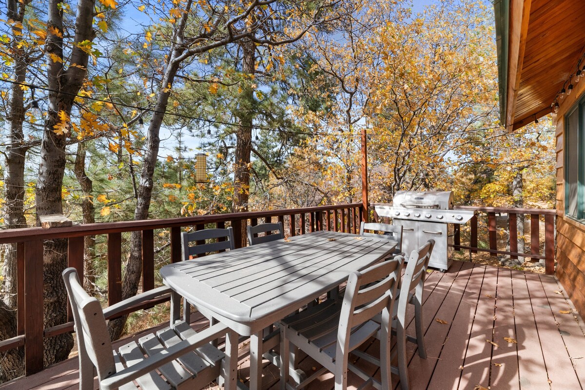 OUTDOORS - Spacious back deck with gas barbecue and patio table with chairs and Adirondack chairs.