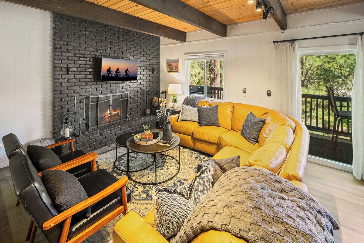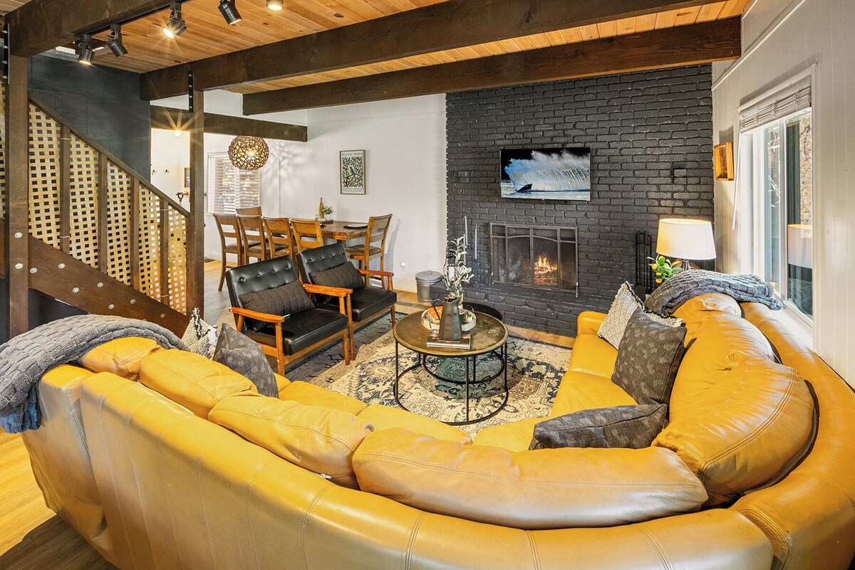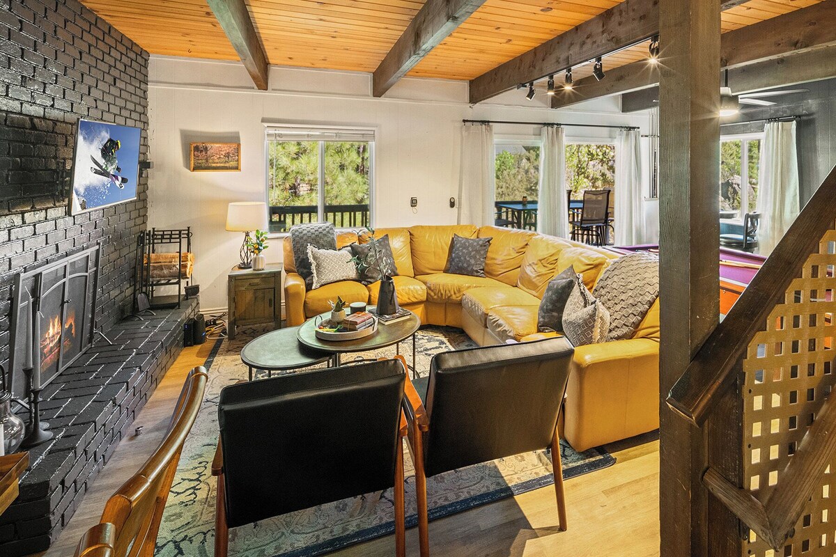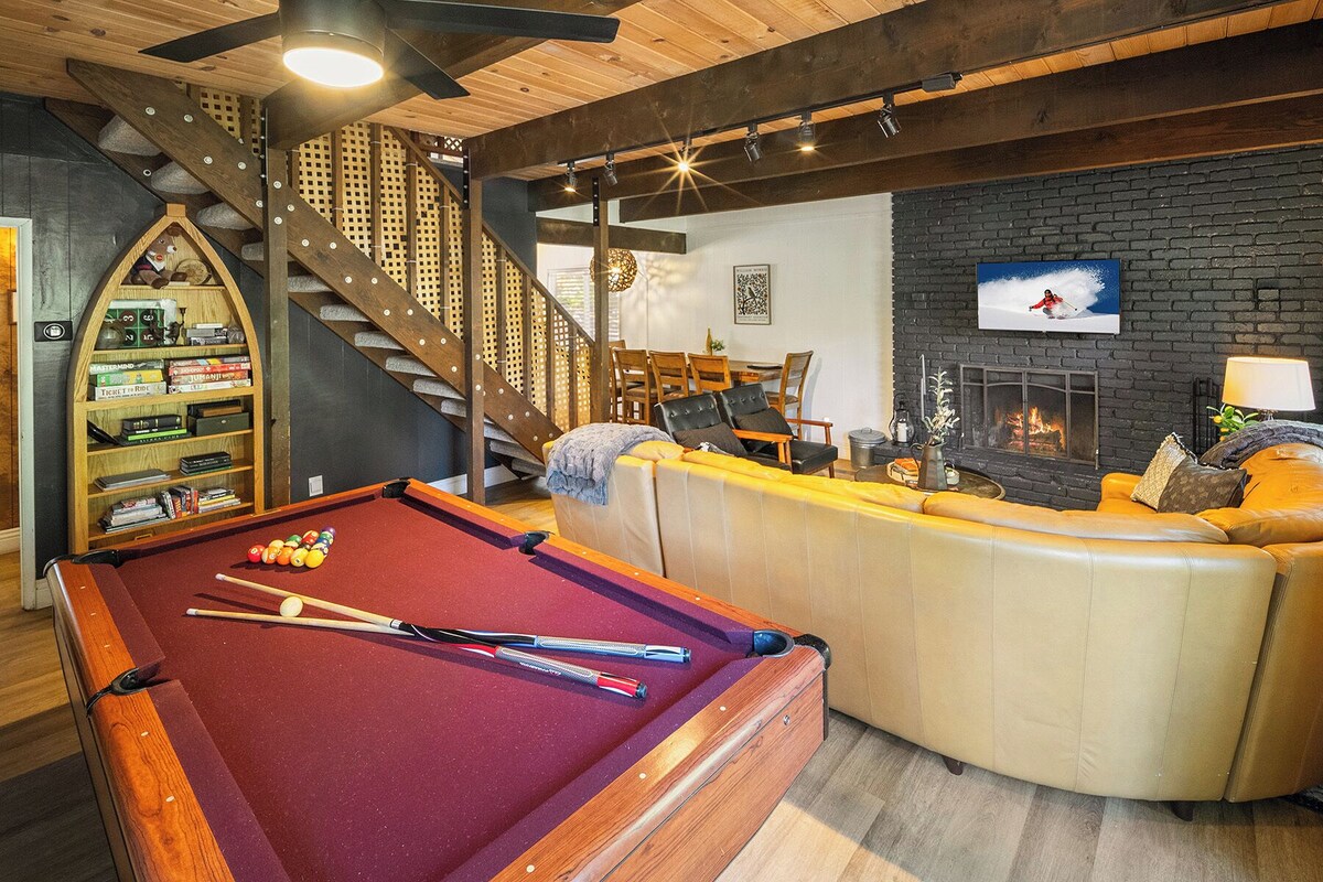 Step back in time with this stylish 3-bedroom, 2-bath gambrel-style cabin located in the most desirable and family friendly area of Big Bear Lake. Just 10 minutes from the Village and ski slopes. Close to hiking trails. Designed with unique charm and special touches. The three bedrooms are styled to be the coziest and most comfortable spaces, each equipped with its own television and private balcony to enjoy. This home offers a fun and cozy stay for up to 5 guests. We are dog and cat friendly! The space Inside, you’ll find a spacious living room with retro furnishings, a pool table for endless entertainment, and ceiling fans in every room. The fully equipped kitchen and dining area make it easy to enjoy meals at home. Each of the three bedrooms features either a king or queen bed, and plenty of charm. Outside, relax on the fenced-in yard, grill dinner on the propane BBQ, or take in the views of trees and boulders from your private patios and balconies. Things to know: -Sleeps up to 5 guests comfortably (2 queens + 1 king). -2 bathrooms. -Pet-friendly (dogs & cats welcome!). -2-car parking available (call Liv for rules). -Must climb stairs. -Heating available (no AC; please keep heat at 55 when not home). Whether you’re here for skiing, hiking, or simply enjoying a retro mountain getaway, this home blends vintage style with Big Bear charm for an unforgettable stay. Our prices include all fees. No hidden fees.