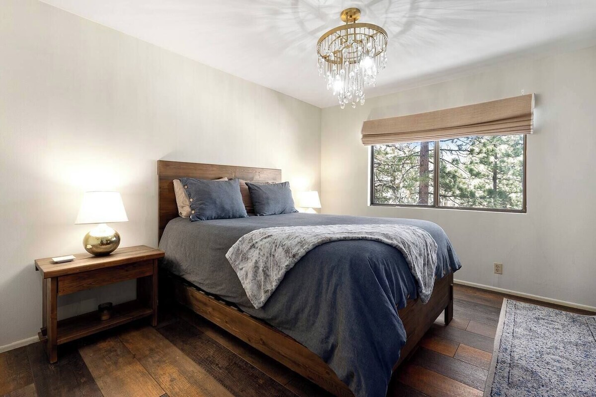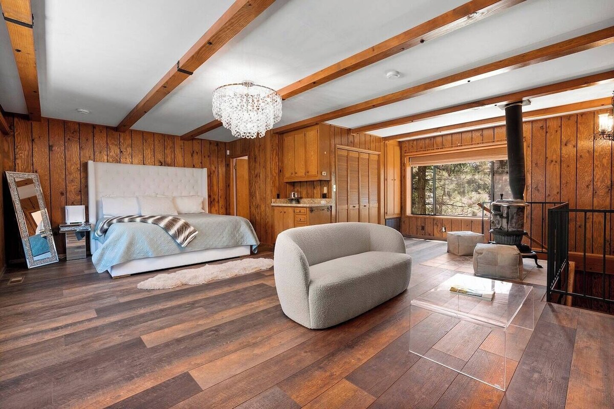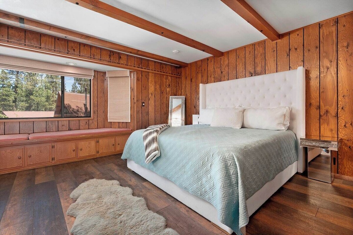 Enter our cabin, you're greeted with a glamorous chandelier. Adventures begin in our welcoming Big Bear retreat! Main house has 2 bedrooms, 2 baths, across the deck is a separate (1 bedroom /1 bath/couch). Spiral staircase ascends to 2nd level, open floorplan - living, dining, kitchen, granite counters, bay window, wood burning fireplace. Huge deck adorned by tall pines, Adirondack chairs, firepit, BBQ, hot tub downstairs. Prestigious Fox Farm cabins, see Snow Summit from hot tub & deck. We are always available for any questions or needs in the Big Bear Lake area - don't hesitate to call or text for help. Located in prestigious Fox Farm, your unique cabin is located less than 10 minutes to everything Big Bear has to offer, for all 4-seasons, year-round! To name a few: The Lake, fishing, hiking trails, mountain biking, kayaking, stand-up-paddle-boarding, ski and snow boarding, The Village, Alpine Zoo, Discovery Center, museum, and golf course. Free, off-street, driveway parking for 3 cars only. City of Big Bear Lake does not allow street parking. Vehicles parked on the street blocking neighbors or snowplows, may be cited and/or towed at vehicle owner's expense. Winter precautions are always in place - you must carry chains from November 1 - April 1. Snow creates limited and \ driveway parking - a four-wheel drive vehicle with higher clearance is preferred. Regular vehicles may be challenged by winter icy road or driveway conditions, that is why chains are required. Caltrans and CHP will enforce chain requirements. Enjoy complimentary coffee k-cups and sit around firepit, enjoying mountain fresh air, listening to the tall, whispering pines. Enter through feng shui red door to our Glam Woodsy cabin, chandelier foyer! Main house, floor one: 2 bedrooms: 1) queen bed, and 2) two-sets of twin bunk beds; both bedrooms have remote controlled blinds and cozy, warm feels. Full bathroom, sitting area, and laundry room. Spiral staircase takes you to main house, floor two: living area, sitting area by wood burning fireplace, dining table, counter-top seating, kitchen, and small workstation perfect for laptop. Plenty of games, books and puzzles, WIFI, flat screen TV. Outside main house, floor two: huge deck, Adirondack chairs, firepit, BBQ, and stairs leading down to backyard. Still on second floor, across deck is the property jewel: separate suite, king bed, chandelier, couch sitting area, separate wood burning heater, En-suite bathroom, bay window with remote controlled blinds, WIFI, flat screen TV. Hot tub is on ground floor, where you have peek-a-boo views of Snow Summit. Complete fenced in yard, picnic table, long driveway, accenting our flag lot acreage. Instacart offers deliveries direct to cabin from stores and restaurants. City maximum occupancy 9, City maximum cars 3. Situated about 100 miles east of Los Angeles, Big Bear Lake is nestled in the San Bernardino National Forest. 3 ways to Big Bear: HIGHWAY 330/18 from San Bernardino through Running Springs (front way) shortest and most direct route. HIGHWAY 38 from Redlands (back way) best route when leaving the valley on weekends and holidays. HIGHWAY 18 from Lucerne Valley (desert way) best in snowy weather. This idyllic alpine town is perfect for outdoor enthusiasts and families who are looking for an adventure or simply an escape from city life - year-round, all four seasons! City elevation sits at 6,759 feet. Come relax and enjoy everything Big Bear has to offer. Popular destinations from our cabin: 1.6 miles to Snow Summit Resort 2.1 miles to Bear Mountain Resort 1.1 miles to Big Bear Alpine Zoo 2.7 miles to The Village 0.9 miles to Vons 1.0 miles to the Lake 3.3 miles to Alpine Magic Mountain Slide 2.0 miles to Convention Center (Farmers market, Oktoberfest) 2.0 miles to Big Bear Snow Play and Speedway (Go-Cart Racing) Big Bear has a FREE TROLLEY, operated by Big Bear Mountain Transit ADDITIONAL CHARGES WILL APPLY County or City taxes apply to all reservations. City of Big Bear Lake's 10% occupancy tax and City's 3% tourism tax is applied to each reservation. Guest agrees to pay for any damages to the property, grounds, furnishings, household items, or hot tub caused by Guest during its occupancy. This will include payment of any additional cleaning charges incurred due to Guest’s occupancy. SMOKING NO smoking or vaping IN the cabin of any kind whatsoever. You may carefully smoke or vape outside, but remember you are in the mountains, so please remove all cigarette butts and never flick a butt into the wild. If it is discovered you have smoked inside, or if the cabin smells of any kind of smoke, a $500 fee will be charged for odor removal services. All smoke conditions will be reported to you and any rental platform with photos. PET (DOG) We MAY approve 1 or 2, adult, small-to-medium dog(s). $75 pet fee is charged, per pet, for entire stay. Believe it or not, some dogs are too big and just won’t be a fit for the cabin. Sorry, no puppies, no cats, birds, rabbits, monkeys or other. City rule – dogs may never be left alone in cabin. Any dog must be registered to reservation, at time of reservation. Dog(s) are not allowed on furniture or beds. Guest must bring dog-rags to wipe off paws each time dog returns to cabin from outside, minimizing dirt, mud, and snow. Use of our cabin towels for dog cleaning is strictly prohibited. Damage to any cabin towel will result in a charge of $40 per towel. If you have been approved for a dog. Please be a diligent dog owner, remember we are allowing your pet in our cabin. Pick up all potty breaks immediately, dispose of accordingly. At no time may a dog release any potty break inside the cabin. Use broom and dustpan OFTEN to minimize shedding and dog hair, certainly no dog hair should be left on any bed or furniture, because we do not allow dogs on them. In addition, no dog hair should be left on floor or rugs. If any extra cleaning is required to remove found dog hair, or potty breaks left on property