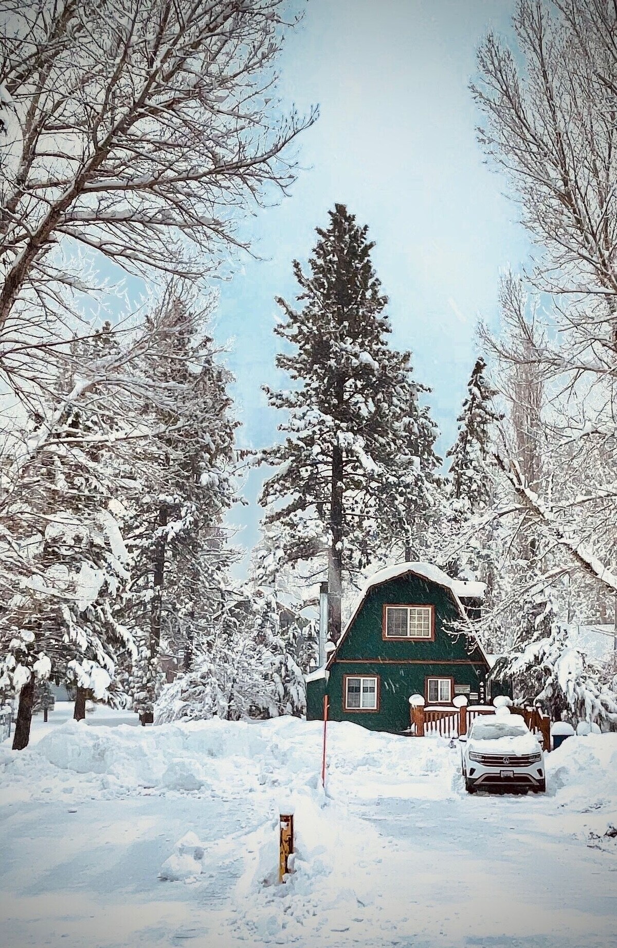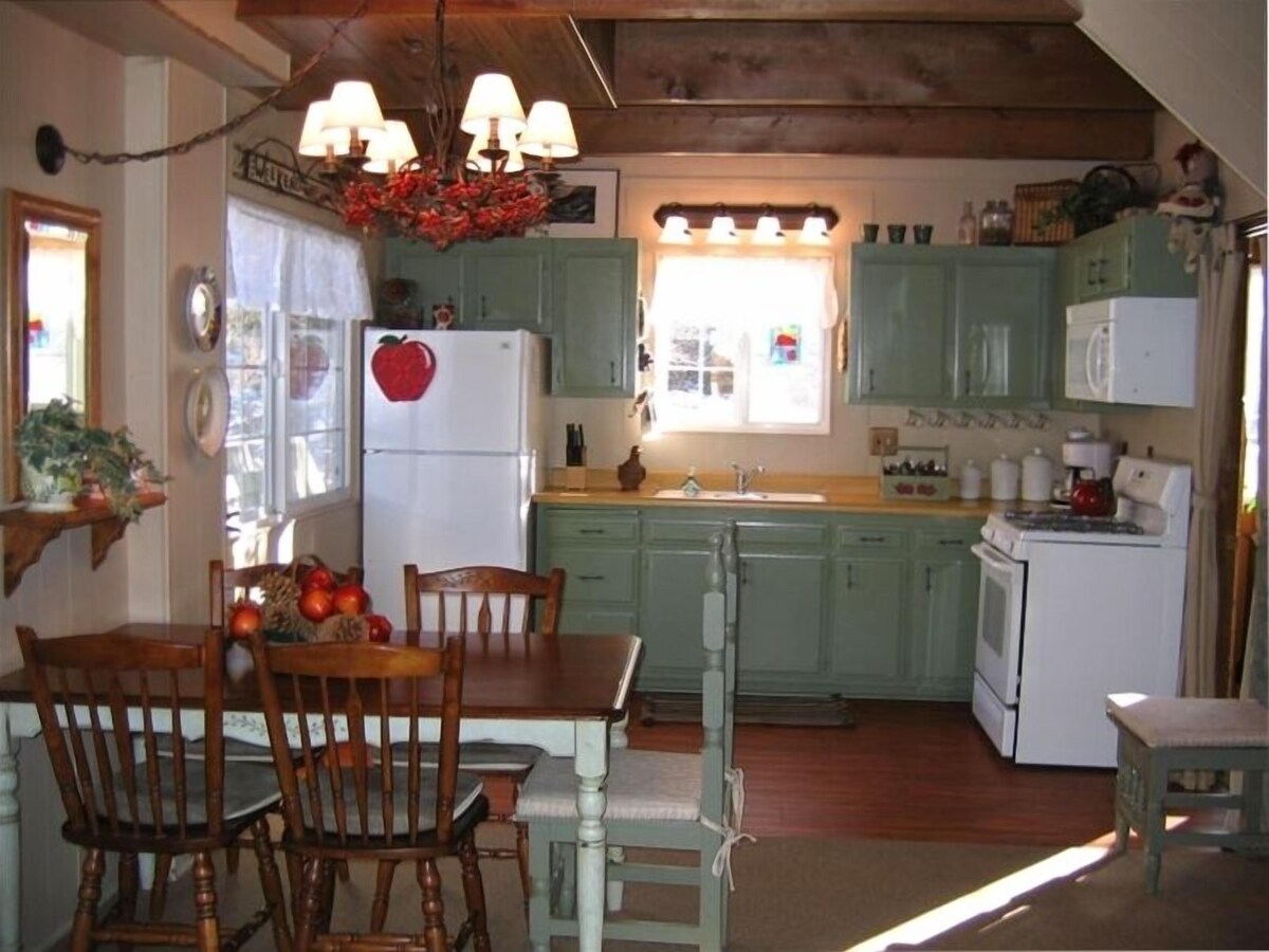 LIMITED: Guests Over 30 can Bring a maximum of 5 people, including kids, to enjoy our Retro & Rustic 3 bedroom cabin w/ gated deck, new Hot Springs Prodigy Ozone Mineral Hot tub (Chlorine free), picnic table, and Gas BBQ outside. Inside enjoy a rock fireplace, full kitchen, free wifi, and movie channels inside. The cabin is less than a mile to the ski lifts (summer- mountain biking & hiking; winter- snowboarding & skiing), zoo, golf course. Near recreational Big Bear Lake for fishing, boating, & jet skiing April-Oct, There are plenty of restaurants, rentals, shopping centers, and a movie theater just down the road. Convenient fun with a quiet place to rest your head and relax. Winter is a great time for your family or ski party to discover the Apple Jacks Cabin. Its bright green exterior is a vivid contrast to the snow that covers the wide open spaces that separate Apple Jacks from neighboring cabins. Handsome, rugged log railings circle the Trex deck, and a six-foot wood screen provides additional privacy for the large spa on the back deck. Half-log trim around all the doors and windows complete this picture-perfect cabin. There is lots of space for parking in the front along with a parking spot that is flat with the road making it easy for cars to get in and out when it is snowing. Set back far from Deer Canyon Road, Apple Jacks will make you feel like you have stepped back 20 years to a more serene Big Bear before it was discovered by Southern California as the perfect alternative to Aspen or Vale. Imagine walking to the ski lifts at Bear Mountain Resort without having to rise at dawn to find a parking space in the resort’s main parking lot. No longer will you have to be herded like cattle in those open flat-bed trucks from distant auxiliary lots. You can also walk to the nearby Moonridge Animal Park to visit the inhabitants of the surrounding San Bernardino National Forest. Step inside its original diamond-paned front door and you will be in the spacious Apple Jacks great room. It features T&G wood ceilings, supported by large, rugged beams. You’ll also find a large, flat-screen television, with access to numerous cable channels. Two sets of French doors take up one wall of the great room and lead out to the large back deck with its spa, wood picnic table and BBQ. To the right of the great room is the dining area and the fully-equipped kitchen. Let Mom relax in front of the large, flat-screen TV with a glass of wine while Dad and the older kids prepare dinner. You can even keep one eye on the young ones, who will want to head outdoors whenever they can. The front deck and the vacant lot next door are right outside the kitchen windows. When it's time for the rest of your family or group to bunk down after an active day, Apple Jacks can officially sleep five adults and three children in its two bedrooms and converted den. The master bedroom has a king-size bed, with a balcony overlooking the deck and spa. There’s also a TV, DVD and CD player tucked behind the sliding doors of the closet. The second bedroom contains two full-size beds with 'picket-fence' headboards that will delight the kids. Downstairs, a former den has been converted to a third sleeping area that holds another full bed. There's probably some guests who couldn't come up the mountain without a laptop, or have to do some real work to make the trip tax-deductible. Free wireless high-speed Internet access is available throughout the cabin. A special movie channel package has been added for the snow bunnies who prefer the indoors to the slopes. There's also unlimited US & Canada phone access. Three vehicles are authorized to be parked in the large, paved 2 areas in front of the cabin. The lake is stocked with pink trout, year 'round, that has a mild pleasant taste, like a tender salmon. I prefer it to salmon. Your family or best friends deserve the best for their ski 'n' snowboarding, or fishing getaway to Big Bear Lake with Apple Jacks -- all polished to perfection -- as your home base. Keywords: Big Bear Cabin, Large Parking Lot, Pet Friendly, Jacuzzi, Gas BBQ, Moonridge Cabin, for guests over 30 yrs old. Our prices include all fees. No hidden fees.