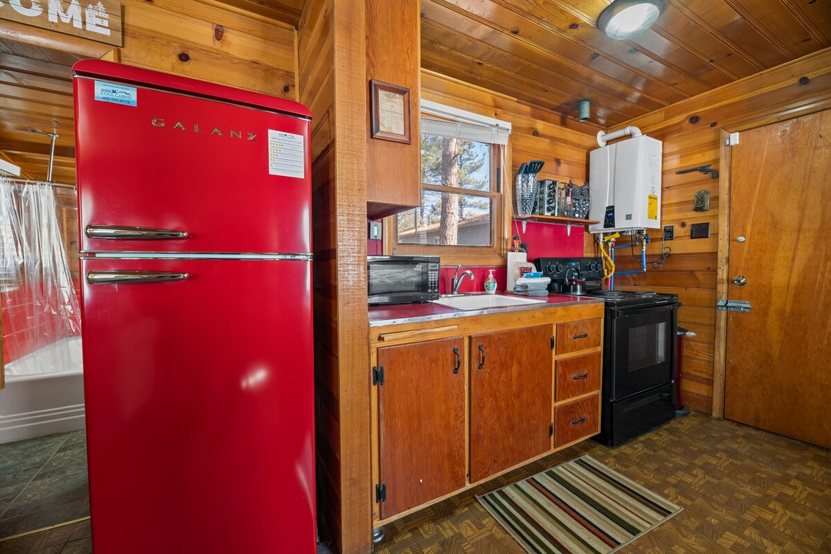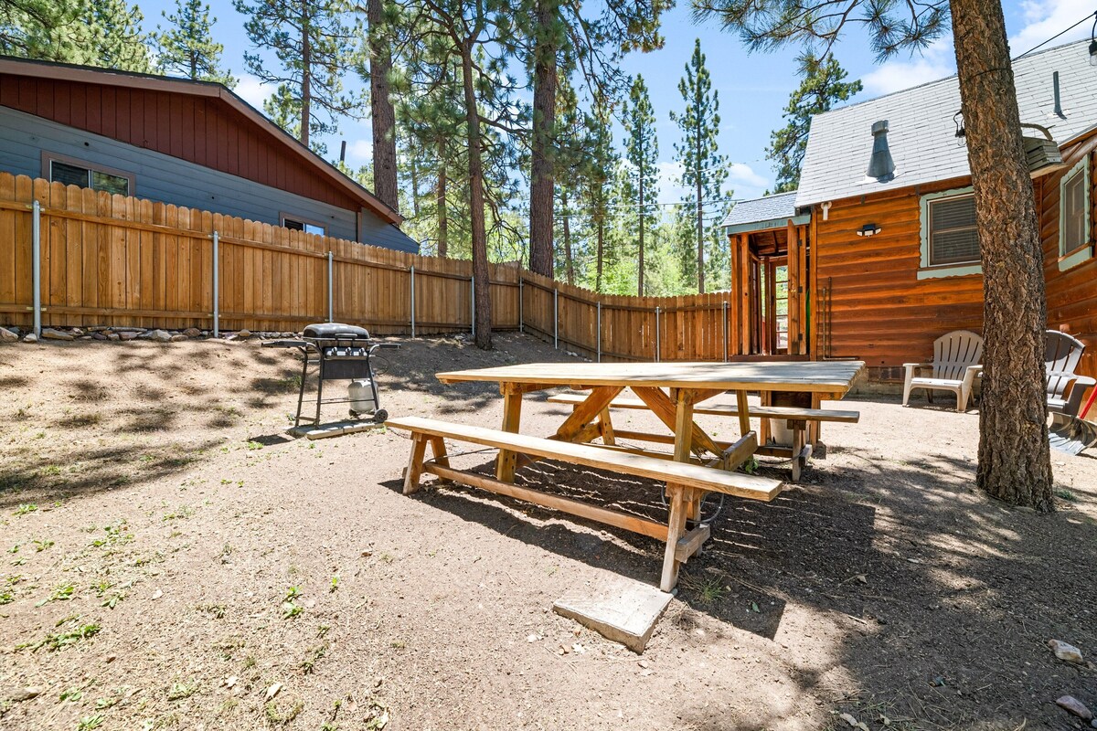 Just a short walk to the Village shops, restaurants, National Forest hiking trails, and the lake. Perfect for couples looking to be close to everything Big Bear has to offer. LIVING SPACE - Cozy 400+ sq ft home with living room, a ceiling fan, dining table, a TV, a beautiful wood burning fireplace stove, and comfortable living room seating. ROOMS & BEDS - Studio bedroom with a queen bed, 1 bath. Extra blankets and pillows are available. KITCHEN - Stove with oven, refrigerator, microwave, blender, toaster, coffee maker, dishes, pots/pans, spices, and more. AMENITIES - Cable TV, fast WiFi, board games, and card games. Relax near the cozy wood burning fireplace stove. OUTDOORS - Enjoy the large fully fenced backyard with a picnic table and gas barbecue! PARKING - 1 car driveway Close to National Forest hiking trails Village - close walk Lake - close walk Snow Summit - 3.1 miles Bear Mountain - 4.9 miles Oktoberfest - 5 miles Other things to note: Big Bear Lake local ordinance 99.300 limits maximum occupancy to 2 people. Children, toddlers, and infants do count as a person. Occupancy is permitted per City Ordinance - over occupancy could result in a fine or non-refundable eviction. Pet fee $75 per pet (dogs only) Check in: 4 pm Check out: 11 am Our prices include all fees. No hidden fees.
