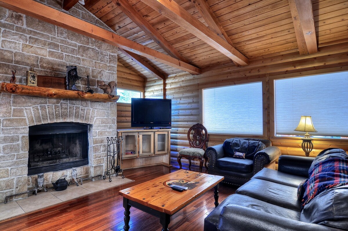 Stay at the slopes at Bear Mountain! This newly furnished cabin will sleep up to 9 comfortably and is a 2 minute walk to the slopes at Bear Mountain. There is a new pool table and a 7 person spa waiting for you to enjoy after a day on the slopes. If you enjoy hiking, the national forest is only 3 lots away where you can hike to spots with incredible views of the lake! The Big Bear zoo and golf course are also within walking distance. There is something for everyone in this cabin which has a large flat screen television in the great room for you to enjoy. Film buffs will get a special thrill with this cabin. The indie film, \ was filmed on location in Big Bear, and many of the interiors were filmed in this cabin. View all the details in our blog entry at this link. Here's the link to the movie trailer. Call us to book your stay with our very own movie star! This cabin has new hardwood floors and beautiful new carpeting in all 4 bedrooms. Up stairs there are 2 master suites with California King full log beds and LCD televisions on the wall. Downstairs there are 2 more bedrooms for the rest of the family. The kitchen is fully equipped with a barbeque on the back deck. The backyard has an a viewing deck and a fenced in dog run if you decide to bring your canine friends. The village is just a short drive away where you can have a great dining and shopping experience. This cabin will give you the space, location, and amenities you are looking for to make the most of your vacation. Primary renter must be at least 25 years of age. Master bedroom 1 - 1 king, 1 set of bunk beds Master bedroom 2 - 1 king Bedroom 3 - 1 queen, 1 set of bunk beds Bedroom 4 - 1 queen VRR-2022-1065 Our prices include all fees. No hidden fees.