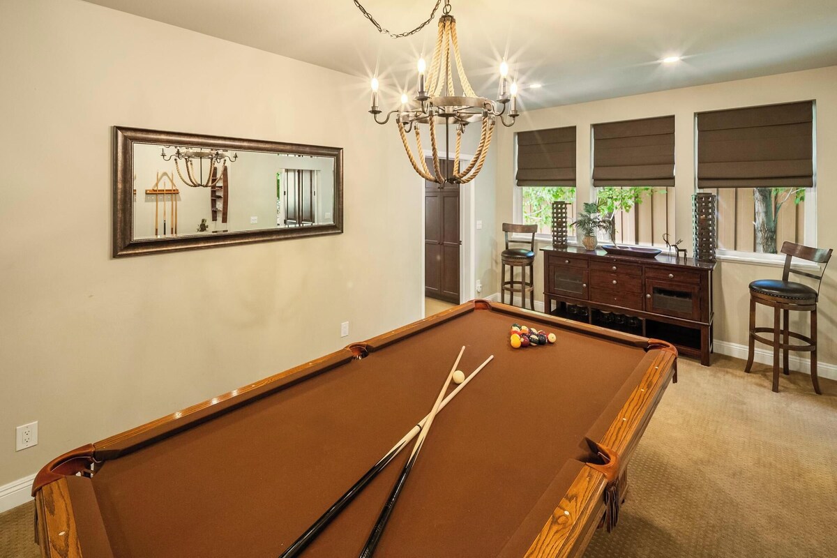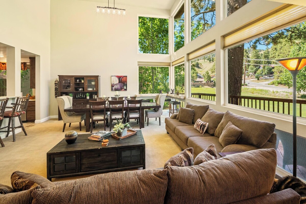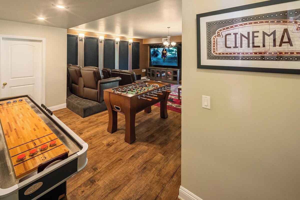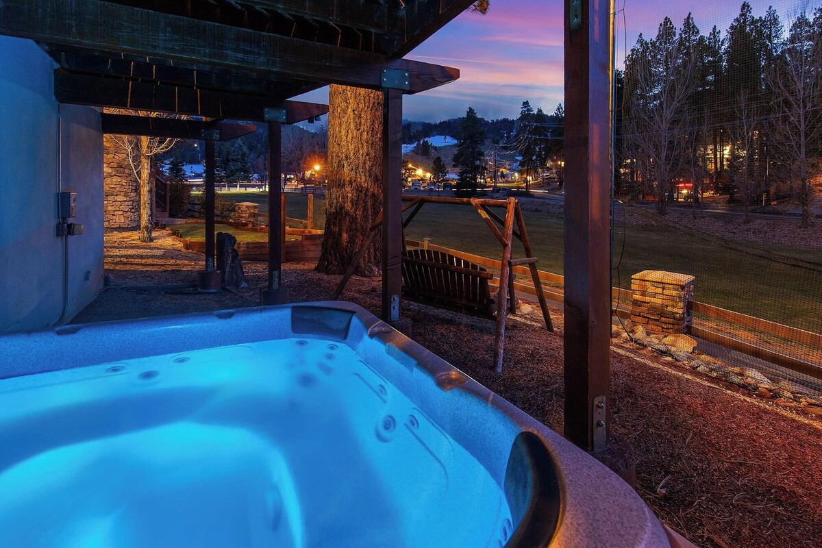 ★★Wolf Creek Luxury Estate is on the 9th Fairway where you can reconnect with family and friends at this stunning 7-bedroom mountain escape and just steps from Bear Mountain Ski Resort. With over 5,700 square feet of elegant living space, a private theater room, game tables galore, a Universal Tesla Charger (60 amp) for your EV, and serene golf course views, Wolf Creek Estate is the perfect setting for year-round adventure and relaxation in Big Bear.★★ ★★ HIGHLIGHTS ★★ ✓ 7 spacious bedrooms including 4 private ensuites ✓ 5,711 sq ft of luxury living space with high vaulted ceilings ✓ Located directly on the 9th Fairway of the golf course ✓ Sweeping view of Bear Mountain Resort + Mountains ✓ Walk to Bear Mountain Ski Resort — no driving needed! ✓ Private HOT TUB with golf course and slope views ✓ Two expansive decks + patio with BBQ + outdoor seating + bocce ball area ✓ Universal Tesla Charger (60 amp) — charge your EV on-site ✓ PET FRIENDLY ✓ Pool/Ping Pong table+ shuffleboard + foosball + arcade games ✓ Private theater room with 86\ re gathering around the fireplace, challenging friends to a game, or enjoying movie night, there’s something for everyone. ✓ Bright open-concept living area with oversized view windows ✓ Two gas fireplaces for post-slope relaxation ✓ Game Table fun with: ✓ Ping Pong/Pool Table ✓ Shuffleboard table ✓ Retro Sit Down Arcade game ✓ Foosball ✓ Private theater room with 86" TV and 6 theater-style seats ✓ Multiple lounges perfect for conversation or quiet reading ★★ KITCHEN & DINING ★★ Create and share memorable meals together. The fully equipped kitchen and open dining area make it easy to cook and connect, whether it’s pancakes in the morning or a holiday dinner. ✓ Chef-ready kitchen with full suite of modern appliances ✓ Keurig & standard drip coffee makers ✓ Microwave, blender, crockpot, and dishwasher ✓ Breakfast bar for casual meals or extra prep space ✓ Dining room with seating for the whole group and scenic views ★★ LUXURY BEDROOMS and BATHROOMS ★★ Sleep in comfort and wake to mountain views. Wolf Creek Luxury Estate offers seven well-appointed bedrooms designed for both privacy and togetherness, including two luxurious ensuite rooms. ✓ Master Suite 1(Main Level) – Queen bed w/ En-Suite Full Bathroom Armoire w/ Smart TV, Mirror closet doors ✓ Master Suite 2(Upper Level) – King bed w/ En-Suite Bathroom w/ Jacuzzi Tub + Walk-In Shower, Smart TV + Fireplace +Ceiling Fan + Walk-In Closet, Slider to Private Balcony w/ Golf Course and Mountain Views ✓ Master Suite 3(Upstairs East Wing)- King Bed w/ En-Suite Full Bathroom, Smart TV, Recliner Chair + Ottoman, Mirror Closet Doors, Forest Views ✓ Master Suite 4(Upstairs East Wing)- Twin over Full Bunkbed + Roll-Away Twin(In Closet) w/ En-Suite Bathroom w/Walk-in Shower, Smart TV, Recliner Chair, Mirror Closet Doors, Slider to Private Deck. ✓Bedroom 5(Upper Level): King Bed, Smart TV, Mirror Closet Doors, Window Views ✓ Bedroom 6(Upper Level): Queen Bed, Smart TV, Mirror Closet Doors, Private Deck Access ✓Bedroom 7(Upper Level): 3 Twin Beds + Plush Sofa, Window Views ✓ Half Bathroom on the Main Level ✓ Full bathroom on the Upper Level ★★ OUTDOOR SPACE ★★ Soak in mountain air and fairway views from multiple outdoor living areas. Whether you’re BBQing with friends, soaking in the hot tub, or sipping coffee on the deck, the outdoors is yours to enjoy. ✓ Two elevated decks with views of the 9th Fairway and ski slopes ✓ Patio with private HOT TUB, outdoor dining, and propane BBQ ✓ Bocce Ball area(Balls located in patio area) ✓ Peaceful cul-de-sac location for added privacy ✓ Gated property with a large driveway and garage for parking ★★ LOCATION, LOCATION! ★★ Adventure is right outside your door. Whether you ,