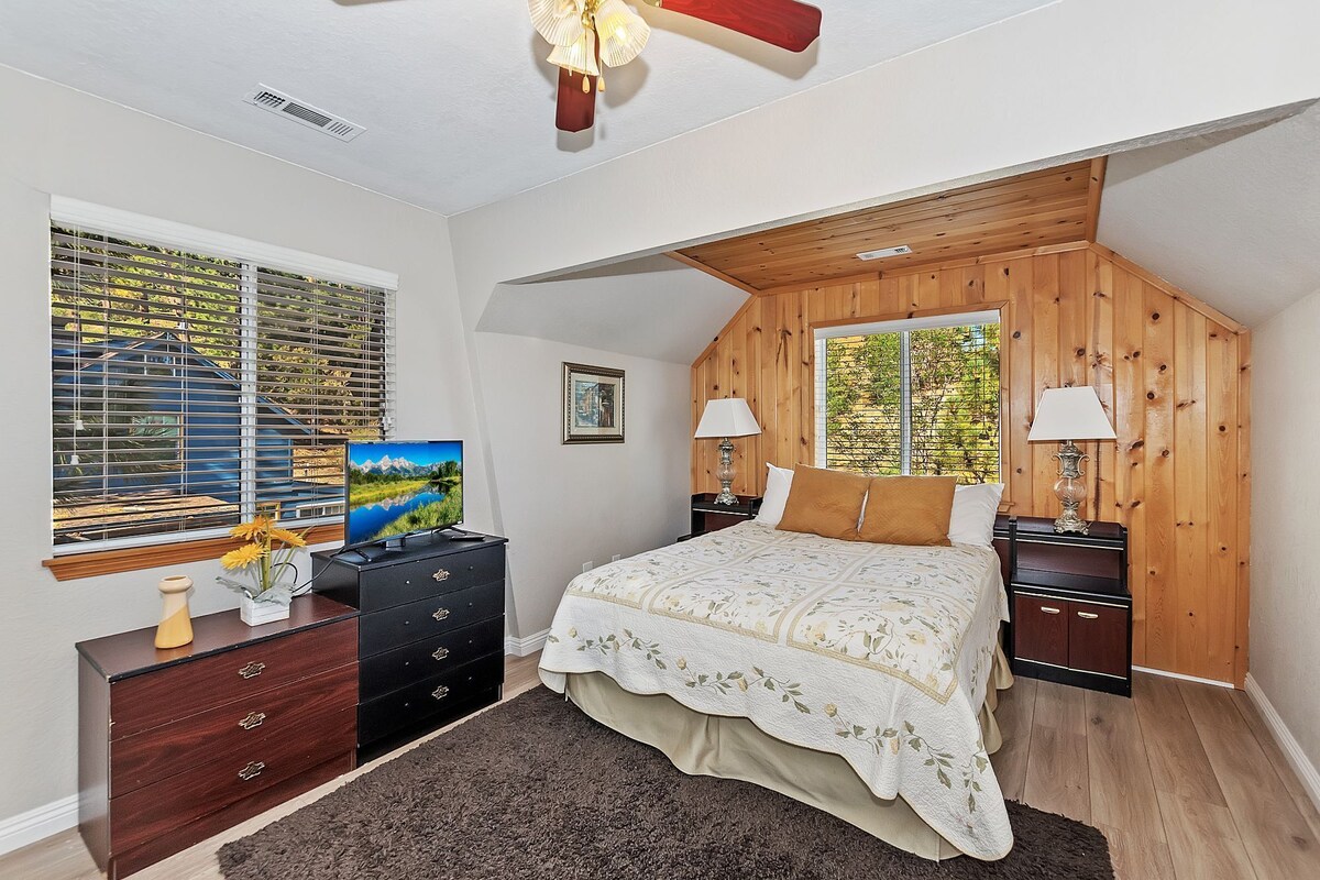 Welcome to Village Views, a stunning three-bedroom, two-bathroom vacation rental nestled in the heart of Big Bear Lake. Framed by tall trees and surrounded by nature’s bounty, this cabin offers serene views and a cozy atmosphere, perfect for your mountain getaway. Enjoy the matchless beauty of Big Bear Lake while being just a short walk away from the village and lake. ★★ Cabin Highlights ★★ • Location: Walk to the village and lake, close to marinas, Fisher Cove, and Boulder Bay. • Bedrooms: 3 comfortable bedrooms accommodating up to 8 adults. • Bathrooms: 2 full bathrooms, including one with a jetted tub. • Kitchen: Fully equipped with major appliances, including a microwave oven, dishwasher, blender, toaster, and coffee maker. • Entertainment: Large Smart TV, DVD player, free WiFi, wood fireplace. • Comfort: Central heating, leather recliner, large sectional sofa. • Outdoor Space: Deck with grill, porch swing, seating, and a glass table for six. • Parking: Ample parking space available. ★★ Bedrooms ★★ • Master Bedroom: King-size bed, Smart TV, private bath with jetted tub. • Second Bedroom: Queen-size bed and full-size bed, perfect for siblings or close friends. • Third Bedroom: Queen-size bed. ★★ Bathrooms ★★ • Bathroom 1: Full bath with shower. • Bathroom 2: Private bath in the master bedroom with jetted tub. ★★ Kitchen & Dining ★★ • Kitchen: Fully equipped with major appliances for all your cooking needs. • Dining Area: Comely table and matching chairs for six. • Outdoor Dining: Deck with grill, seating, and a glass table for six. ★★ Living Room ★★ • Spacious Living Area: Large sectional sofa, extra-large Smart TV, DVD player, leather recliner, wood fireplace. • Windows: Bright windows offering beautiful views and natural light. ★★ Outdoor Space ★★ • Deck: Grill, porch swing, extra seating, and a glass table for six. • Enclosed Yard: Private washer and dryer for your convenience. ★★ Activities & Attractions ★★ • Summer Activities: Magic Mountain (alpine slides, water tubing, mini-golf, go-karts). • Water Recreation: Marinas to the south for fishing, jet skiing, and boating. • Winter Activities: Bear Mountain (under 4 miles) and Snow Summit (2 miles) for skiing, snowboarding, and tubing. • Nearby Attractions: The Alpine Zoo and Oktoberfest (less than 5 miles away). Book Village Views today and experience the perfect blend of rustic charm and modern conveniences in a beautiful natural setting. Feel free to reach out with any questions or special requests. We look forward to hosting you! 2025-0933 Important: Dear Traveler, you will be charged with USD 200 in case you include a Pet in your reservation as a Refundable Damage Deposit for Pets. Our prices include all fees. No hidden fees.
