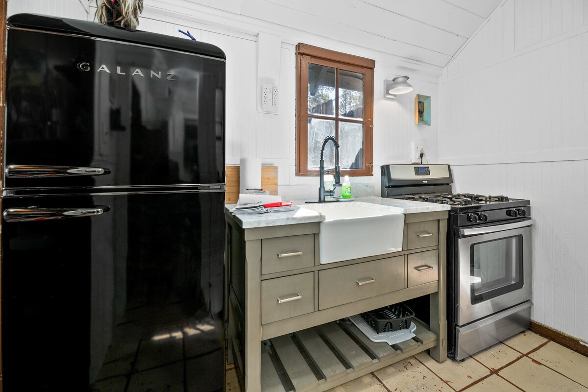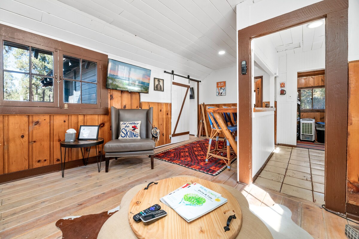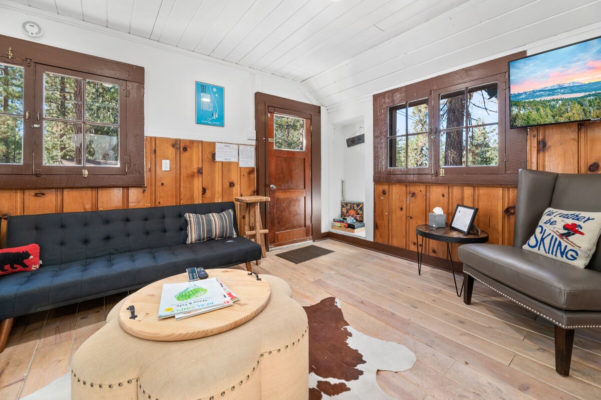 Located in the heart of Big Bear. Just a short walk to the Village and lake. Close to National Forest hiking trails. Modern aesthetics meet vintage charm in this quaint cabin perfect for couples! LIVING SPACE - Cozy 500+ sq ft home with living room, dining table, bar seating, a TV, a beautiful gas fireplace, and plenty of comfortable living room seating. ROOMS & BEDS - 1 bedroom, 1 bath. Bedroom has a queen bed. Living room has a futon. Extra blankets and pillows are available. KITCHEN - Stove with oven, refrigerator, dishwasher, microwave, blender, toaster, coffee maker, dishes, pots/pans, spices, and more. AMENITIES - Smart TV, Firestick with streaming apps along with fast WiFi, board games, and card games. Relax near the cozy gas fireplace. OUTDOORS - Enjoy the large fully fenced backyard with patio furniture. PARKING - 2 car driveway Close to National Forest hiking trails Lake - close walk Village - close walk Snow Summit - 1.6 miles Bear Mountain - 1.7 miles Oktoberfest - 3.4 miles Other things to note: Big Bear Lake local ordinance 99.300 limits maximum occupancy to 3 people. Children, toddlers, and infants do count as a person. Occupancy is permitted per City Ordinance - over occupancy could result in a fine or non-refundable eviction. Pet fee $75 per pet (dogs only) Check in: 4 pm Check out: 11 am Our prices include all fees. No hidden fees.