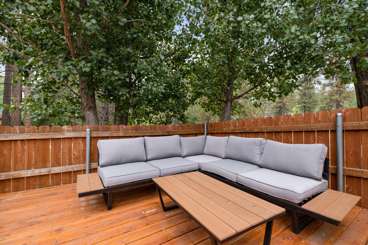 Come and relax in this quiet cabin perfect for your family getaway or a romantic couple's trip! Just a short walk to the marina, park, local market, and restaurants. Close to National Forest hiking trails. The tank-less water heater provides hot water on demand so you can enjoy an extra-long hot shower on those cool mornings! LIVING SPACE - Cozy 900 sq ft home with living room, ceiling fans, dining table, bar seating, a TV, a beautiful wood burning fireplace, and plenty of comfortable living room seating. ROOMS & BEDS - 2 bedroom, 1 bath. First bedroom has a queen bed and TV. Second bedroom has two twin beds. Living room has a sleeper sofa. Extra blankets and pillows are available. KITCHEN - Granite countertops, stove with oven, double door refrigerator, microwave, blender, toaster, coffee maker, rice cooker, dishes, pots/pans, spices, and more. AMENITIES - Smart TVs, Roku, streaming apps along with fast WiFi, board games and card games. Relax near the cozy wood burning fireplace. Pac 'n Play available for the littles. OUTDOORS - Hot tub, corn hole, outdoor furniture, and charcoal barbecue. Enjoy the private, covered patio with a large, fully fenced yard. PARKING - 2 car driveway Close to National Forest hiking trails Lake - close walk Village - 2.3 miles Snow Summit - 4.2 miles Bear Mountain - 5.9 miles Oktoberfest - 6 miles Other things to note: Big Bear Lake local ordinance 99.300 limits maximum occupancy to 5 people. Children, toddlers, and infants do count as a person. Occupancy is permitted per City Ordinance - over occupancy could result in a fine or non-refundable eviction. Pet fee $75 per pet (dogs only) Check in: 4 pm Check out: 11 am Our prices include all fees. No hidden fees.