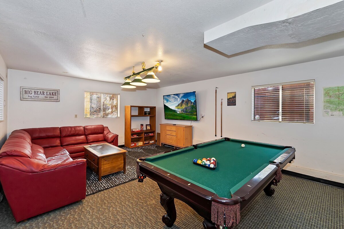 ★★Castle Rock Cabin is a charming and cozy mountain getaway located just west of Big Bear Village and a short drive to both Snow Summit and Bear Mountain ski resorts. This rustic-style home offers the perfect blend of comfort, convenience, and entertainment with a spacious layout, multiple sleeping areas, a fun-filled game garage, and a relaxing backyard with a private hot tub. Whether you're coming for outdoor adventure or a quiet retreat, Castle Rock Cabin is your perfect home base in Big Bear.★★ ★★ HIGHLIGHTS ★★ ✓ 2 Bedrooms + Loft Bedroom w/ Twin Trundle + 2 Full Bathrooms ✓ Rustic Mountain Style Cabin in a Quiet Neighborhood near the Village ✓ Open Concept Living Room w/ Wood-Burning Fireplace & Large Flatscreen TV ✓ 2nd Living Room w/ Couch ✓ Fully Stocked Kitchen w/ Modern Appliances + Dining Area ✓ Converted Game Garage w/ Pool Table, Foosball, Lounge Area & Flatscreen TV ✓ Fully Fenced Back Yard w/ Deck, HOT TUB, and Propane BBQ Grill ✓ Split Type Ductless Air Conditioning System on Upper Level ✓ Washer & Dryer Available ✓ Linens and Towels Provided ★★ COZY CABIN LIVING ★★ Step into the welcoming family room where wood beam ceilings and mountain charm create a space perfect for relaxing with loved ones. Curl up by the wood-burning fireplace after a day on the slopes, or enjoy a movie night on the large flatscreen TV. ✓ Open Concept Living Room w/ Plush Seating & Wood-Burning Fireplace ✓ Large Flatscreen TV w/ HDMI Compatibility & Streaming Options ✓ 2nd Living Room Area with plush couch ✓ Wall Heating Units Throughout Cabin ✓ Sliding Access to Backyard from Kitchen Side Door ★★ FULLY STOCKED KITCHEN ★★ The kitchen is fully equipped with everything you need for your Big Bear stay, whether you're cooking breakfast before a hike or dinner after a day at the lake. The open-concept design keeps the chef connected to the living room conversation. ✓ Modern Appliances: Gas Range/Oven, Fridge/Freezer, Microwave, Dishwasher ✓ Standard Coffee Maker, Tea Kettle, Cookware, Dishes & Utensils ✓ Dining Table w/ Seating for 4 ★★ PEACEFUL BEDROOMS AND BATHROOMS ★★ Each bedroom offers a peaceful mountain vibe with soft linens, ample storage, and cozy touches to make you feel right at home. ✓ Bedroom 1 (Main Level): King Bed, Closet, Flatscreen TV, Nearby Full Bathroom ✓ Bedroom 2 (Upper Level): Queen Bed, Closet, Flatscreen TV ✓ Bedroom 3/Loft Area (Upper Level): Twin Bed w/ Twin Trundle — Ideal for Kids or Extra Guests ✓ Split Type Ductless Air Conditioning System (Upper Level Only) ✓ Bathroom 1 (Main Level): Full Bath w/ Shower/Tub Combo ✓ Bathroom 2 (Upper Level): Full Bath w/ Shower/Tub Combo ✓ Laundry Room w/ Full Size Washer & Dryer ★★ GAME ROOM GARAGE ★★ The converted garage offers a second living space that’s all about fun and entertainment! Whether you’re in the mood for a family game night or watching a movie with your crew, this space is built for memory-making. ✓ Lounge Area w/ Leather Sectional Sofa ✓ Flatscreen TV & HDMI-Compatible(Great for Gaming Devices) ✓ Full-Size Pool Table ✓ Foosball Table ✓ Board Games ★★ OUTDOOR ENJOYMENT ★★ Step outside into your private fenced backyard to enjoy the fresh mountain air or wind down under the stars in the HOT TUB. Grill up something delicious on the propane BBQ or simply lounge on the deck with a warm cup of coffee. ✓ Fully Fenced Backyard w/ Deck + Outdoor Seating ✓ HOT TUB for Soaking After a Day of Adventure ✓ Propane BBQ Grill for Outdoor Cooking ★★ Whether you're hitting the nearby trails, exploring the Village, or staying in for cozy nights and game-filled fun, Castle Rock Cabin offers everything you need for a relaxing and memorable Big Bear getaway. Book now and enjoy all the comforts of home in a beautiful mountain setting! ★★ 2025-1848 Important: Dear Traveler, you will be charged with USD 200 in case you include a Pet in your reservation as a Refundable Damage Deposit for Pets. Our prices include all fees. No hidden fees.