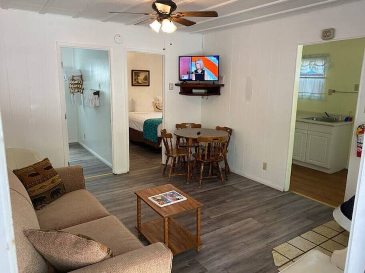 Take it easy at this unique and tranquil getaway. Located in a quiet alpine setting, Timber Have Lodge is located in Big Bear Lake, Ca. The rustically inspired log cottage suites have been the ideal family getaway for decades! (See trip advisor reviews) (#4) Is a boutique family cabin features a stone fireplace, fully equipped kitchen, living room, flat screen TV with Roku, heating and AC. The bedroom has a King bed and living room has a queen pullout sofa. Our prices include all fees. No hidden fees.