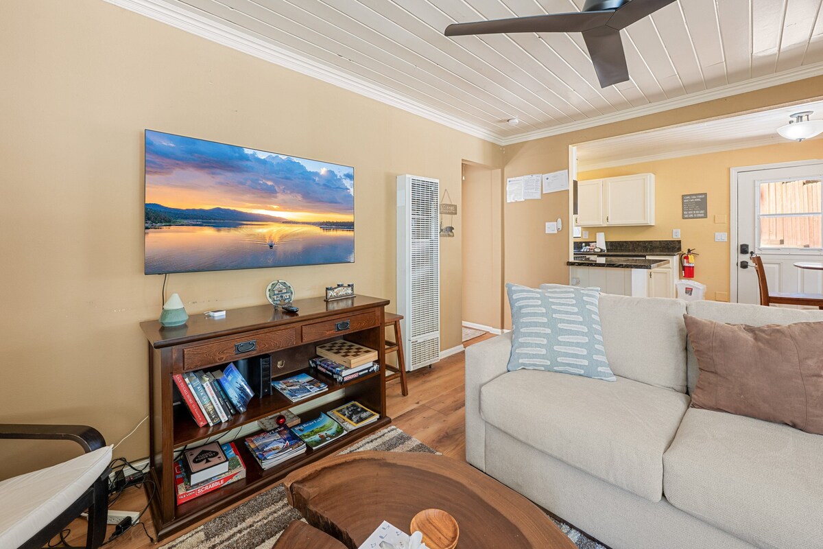 Magical Boulder Bay cottage within a picturesque setting. Come and enjoy this property with lots of outdoor space for year-round enjoyment. Located in the desirable area of town, close to all that Big Bear has to offer! Just a short drive to the Village, restaurants, shopping, and ski slopes. Enjoy a quick stroll to the lake and the beautiful Boulder Bay Park from this fantastic location. Close to National Forest hiking trails. LIVING SPACE - Cozy 800+ sq ft home with living room, dining table, TV, ceiling fan, cozy brick gas fireplace, and plenty of comfortable living room seating. ROOMS & BEDS - 2 bedroom, 2 bath. Master bedroom has a king bed, fireplace, ceiling fan, and private bath. Second bedroom has a queen bed. Extra blankets and pillows are available. KITCHEN - Granite countertops, stainless steel appliances, stove/oven, refrigerator, dishwasher, microwave, blender, toaster, coffee maker, dishes, pots/pans, spices, and more. AMENITIES - Smart TV with cable and streaming apps along with fast WiFi, board games, and card games. Keep yourself warm by the cozy fireplace. Laundry area with side-by-side washer/dryer. OUTDOORS - Large fully fenced back yard with covered patio, plenty of patio furniture, and gas barbecue. PARKING - 2 car driveway Close to National Forest hiking trails Lake - close walk Village - 2 miles Snow Summit - 3.9 miles Bear Mountain - 5.7 miles Oktoberfest - 5.8 miles Other things to note: Big Bear Lake local ordinance 99.300 limits maximum occupancy to 4 people. Children, toddlers, and infants do count as a person. Occupancy is permitted per City Ordinance - over occupancy could result in a fine or non-refundable eviction. Pet fee $75 per pet (dogs only) Check in: 4 pm Check out: 11 am Our prices include all fees. No hidden fees.