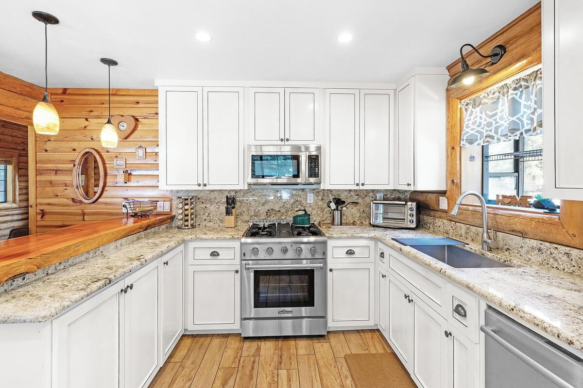 ★★ Bear Mountain Log Lodge is a stunning log-style chalet perfectly positioned between the 8th and 9th holes of Bear Mountain Golf Course! With 4 bedrooms, including two master suites, and 3 bathrooms this luxurious yet rustic retreat blends historical charm with modern comfort. Just a short stroll to Bear Mountain Ski Resort and the golf clubhouse, it’s the ideal getaway for families, friends, and golf lovers year-round. ★★ ★★ HIGHLIGHTS ★★ ✓ Walk to Bear Mountain Ski Resort + Prime Golf Course Location - Between the 8th & 9th Holes ✓ Gorgeous Log-Style Chalet w/ Soaring Vaulted Ceilings & Ceiling Fans ✓ Two Master Suites on Main Level w/ Tile Walk-In Showers ✓ Fully Stocked Kitchen w/ Stainless Steel Appliances + Solid Wood Bar Top Seating ✓ Flat Screen TVs + Wood Burning Fireplace ✓ PET FRIENDLY ✓ Fully Fenced Yard w/ Mature Trees, HOT TUB, & Private Deck ✓ Washer & Dryer Available ✓ Linens & Towels Provided ★★ RUSTIC ELEGANCE ★★ Step inside to be greeted by rich log-lined walls, vaulted ceilings, and a warm mountain ambiance. The open-concept living area offers plenty of seating to gather around the wood-burning fireplace or enjoy a movie on the flat-screen TV. With its charming craftsmanship and cozy layout, the living space is equally suited for entertaining or simply unwinding after a day of Big Bear adventures. ✓ Wood Burning Fireplace ✓ Flat Screen TV ✓ Vaulted Ceilings & Log-Style Architecture ✓ Comfortable Sofa Seating ★★ GOURMET KITCHEN ★★ Just off the living room, the kitchen is fully stocked for your culinary needs. Stainless steel appliances, a solid wood bar top with four barstools, and cottage-style cabinetry make it both functional and inviting. Large windows over the sink offer views of the 9th hole tee box, while the adjacent dining table is perfect for family meals or game night. ✓ Stainless Steel Appliances ✓ Solid Wood Bar Top w/ 4 Barstools ✓ Toaster Oven + Coffee Maker ✓ Beautiful Wood Grain Tile Flooring ✓ Dining Table w/ Seating for 6 ★★ PEACEFUL BEDROOMS & BATHROOMS ★★ This home features two spacious master suites on the main level, each with private bathrooms and charming details like a wood-burning fireplace and golf course views. Upstairs, you’ll find two additional bedrooms with comfortable bedding and a shared full bathroom, plus a fun two-person arcade game to keep everyone entertained. Main Level ✓ Master Suite 1: King Bed, Wood Burning Fireplace, Sitting Bench, Flat Screen TV, Private Deck, En-Suite Bathroom w/ Walk-In Tiled Shower (Half Glass Enclosure) ✓ Master Suite 2: Queen Bed, Floor-to-Ceiling Bookcase, Windows Overlooking Backyard & Golf Course, En-Suite Bathroom w/ Walk-In Tiled Shower ✓ Washer & Dryer in Hallway Upstairs Bedrooms ✓ Bedroom 3: Two Twin-over-Full Bunk Beds, Two-Person Sit-Down Arcade Game, Mirror Closet Doors ✓ Bedroom 4: Queen Bed w/ Golf Course Views + Mirror Closet Doors ✓ Upstairs Bathroom w/ Tub & Shower Combo ★★ OUTDOOR OASIS ★★ Step out onto the deck off the living room to enjoy morning coffee, evening drinks, or a peaceful soak in the HOT TUB under the stars. The fully fenced grassy yard is surrounded by mature trees and offers beautiful golf course and mountain views. Fire up the propane BBQ for an al fresco dinner or take a leisurely stroll to Bear Mountain to enjoy skiing, snowboarding, hiking, or summer golfing. ✓ HOT TUB + Propane BBQ ✓ Private Deck w/ Outdoor Seating ✓ PET FRIENDLY ✓ Fully Fenced Backyard w/ Mature Trees ✓ Golf Course & Mountain Views ★★ Bear Mountain Log Lodge is more than a cabin — it’s a year-round retreat in one of Big Bear’s most desirable locations. With its prime golf course setting, walk-to-ski access, and a perfect mix of rustic charm and upscale amenities, it’s the ideal spot to create unforgettable memories with family and friends! Book your stay today! ★★ 2024-2567 Important: Dear Traveler, you will be charged with USD 200 in case you include a Pet in your reservation as a Refundable Damage Deposit for Pets. Our prices include all fees. No hidden fees.
