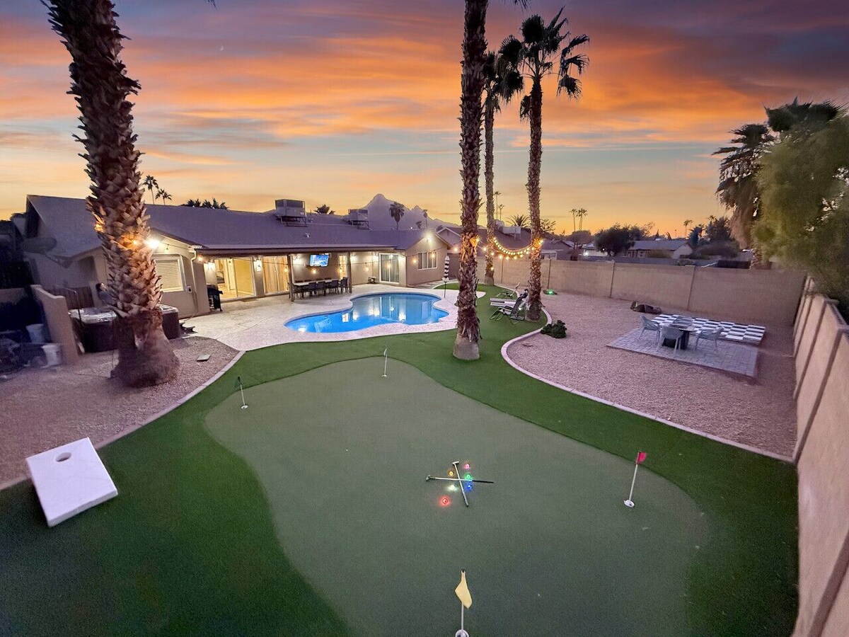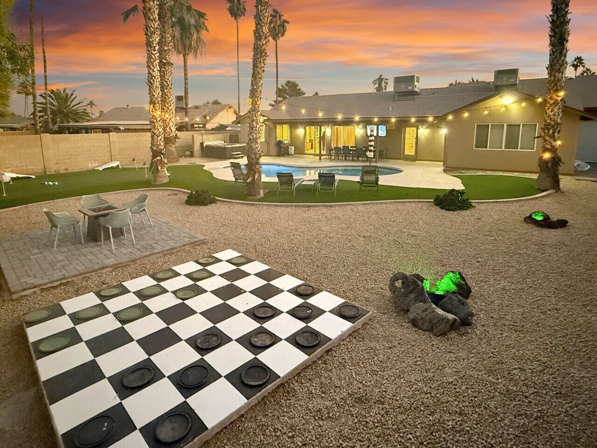 Escape to your private oasis in Phoenix, just 15 minutes from Kierland Commons and top golf courses. Perfect for family gatherings, golf trips, or celebrations, this luxurious home features six bedrooms, 3.5 bathrooms, and two kitchens. The stunning backyard offers a heated pool, spa, putting green, fire pit, and fun outdoor games. Whether you’re planning a family gathering, golf trip, bachelor/ette celebrations or a relaxing getaway, this home has everything you need for an exceptional stay! This large home features a big game room, theater seating, two kitchens, and has a backyard you will never want to leave! The backyard is highlighted by the large heated pool, hot tub, putting green, life-size checkers, cornhole, and fire pit to relax around at the end of the fun filled day! The open floor plan is ideal for entertaining and accommodates 16+ guests in utmost comfort and is perfect for couples, solo adventurers, business travelers, families, and big groups. You’ll be close to everything, but you may not want to leave this quiet retreat. Amenities: Outdoor Amenities: • Heated Pool (+$125/night - please request at least one week before arrival) • Spa (Heated and ready for you at no additional fee) o Giant Checkers o Putting Green o Fire Pit o BBQ Grill o Cornhole Indoor Amenities: o Theatre Room / Game Room o Two Kitchens o Ping Pong o Darts Bedroom Layout: • Bedroom 1: King Bed, Ensuite Bathroom • Bedroom 2: King Bed • Bedroom 3: King Bed • Bedroom 4: Two Sets of Full-Over-Full Bunk Beds, Ensuite Bathroom • Bedroom 5: Twin-Over-Twin Trundle Bed, Private Entrance • Bedroom 6 (Game Room Conversion): Twin-Over-Twin Trundle Bed • Extra Sleeping: Queen-Sized Air Mattress and Pak n Play Bathrooms: 3.5 Here are a few additional services our guests usually take advantage of along with the rates. Please submit any requests at least 1 week prior to check-in. 1. Early Check-In - $200 (when available) 2. Late Check-Out - $200 (when available) 3. Daily Housekeeping - $175 for two hours. *Includes bathrooms, beds (sheet and towel change upon advance request), kitchen, and common living spaces. Please submit any special requests in advance. 4. Pet Cleaning and Deodorizing (dogs only) - $125 per pet for the duration of your stay. In-home Concierge Services: **Please contact us at least 1 week prior to your stay for any special occasions (birthdays, anniversaries, Bachelor(ette) stays, etc) 1. Grocery Delivery 2. Private Chef 3. Electronics/Consumer Goods 4. Private In-Home Massage 5. Baby Equipment Rental Neighborhood: Enjoy the trendy Phoenix neighborhood, where being fantastic neighbors is a priority. Quiet hours from 10pm-7am ensure a peaceful stay for all. Easily accessible via Ubers or Lyfts, explore Phoenix or Scottsdale with assistance from the concierge team or venture out independently using the provided digital guidebooks. Other Things to Note: This fully furnished home comes stocked with essentials for your trip, though plan accordingly for additional consumables. House rules ensure a pleasant stay for all guests. House Rules and Notes: • No parties or events allowed on the property • Renting person must be 25 years of age or older and stay throughout the reservation • No smoking • Check-in: 4 PM (strict), Check-out: 10 AM (strict) • Early check-in and late check-out available for a fee, if possible • Pets allowed with exceptions and fees apply Due To A New City Ordinance: • All reservations undergo verification • Full name required on reservation • IDs requested for verification after booking • Credit card fraud is reported and prosecuted Our guests have full access to this home during their stay. We only ask that you refrain from removing or tampering with pool equipment to ensure no damage and the pool will remain clean during your stay. The home is keyless entry for a smooth check-in both afternoon and night! We're dedicated to ensuring your stay is seamless and enjoyable. Whether you require our assistance frequently or prefer minimal interaction, we're here to accommodate your needs. If you encounter any issues during your stay, please reach out to us via your preferred messaging channel during our business hours from 7 am to 7 pm. We'll make every effort to respond promptly, typically within an hour. In case of emergencies requiring immediate attention, don't hesitate to contact our business line right away. Otherwise, we'll respect your privacy and allow you to fully enjoy your time in our home. The Neighborhood: Our neighbors are our friends! We love that we can share our home with our guests and ask that everyone abide by the quiet hours from 10 pm-7 am so that we can continue to serve our guests without disrupting our great neighborhood. Other Things to Note: This home is fully furnished and stocked with a starter amount of essentials to get you going on your trip! Please plan accordingly to purchase enough additional consumables to last for the remainder of your stay. Lastly, we use a platform called \ via Truvi as part of our guest screening process. Your application must match the primary guest’s name on the reservation, and your identity check must be completed within 48 hours of receiving your booking confirmation as per state and city law. Your booking is NOT confirmed until these requirements have been fulfilled. We appreciate your cooperation with this. TPT #: 21405841 STR #: 2O25-OO3519 Our prices include all fees. No hidden fees.