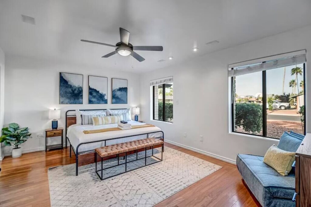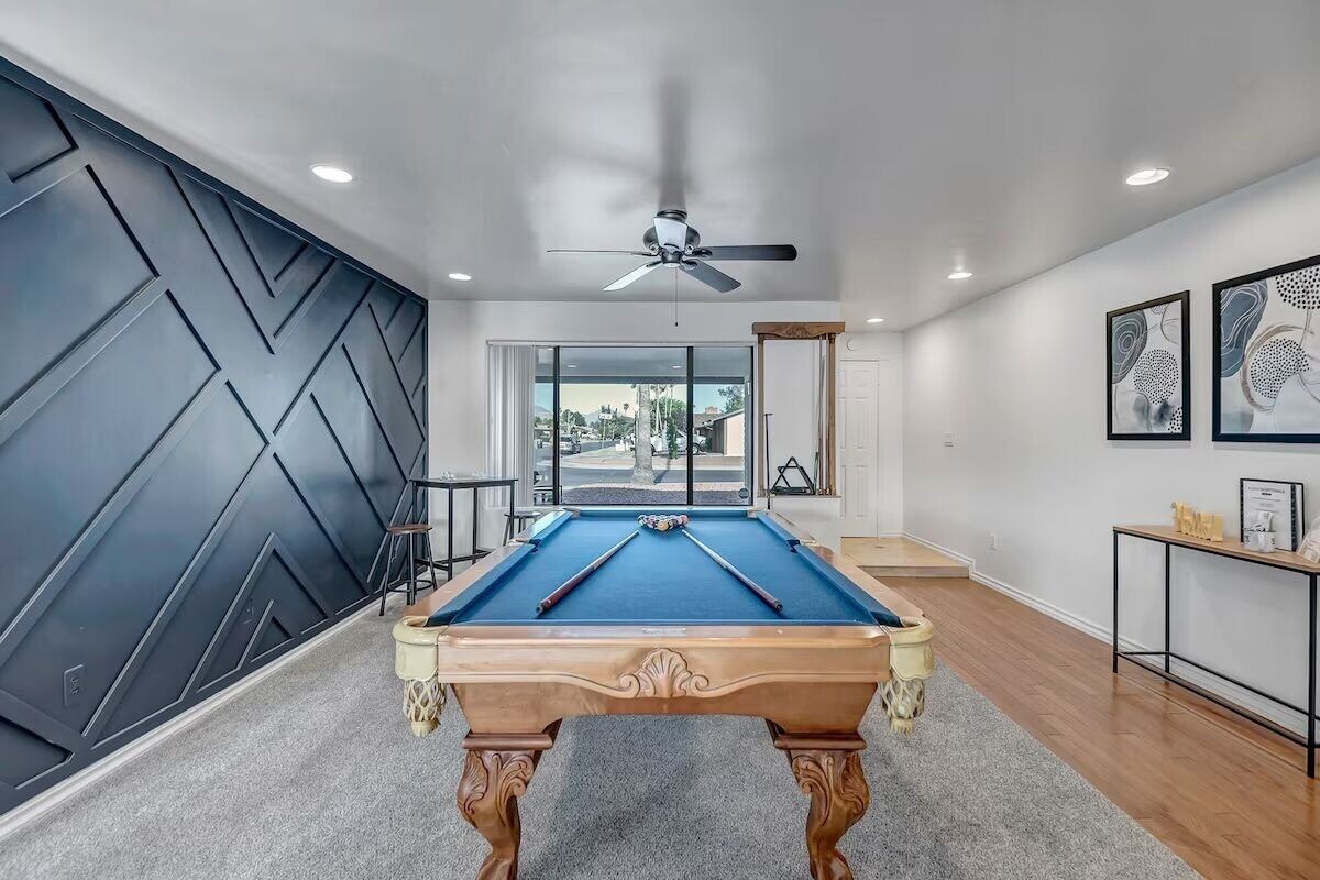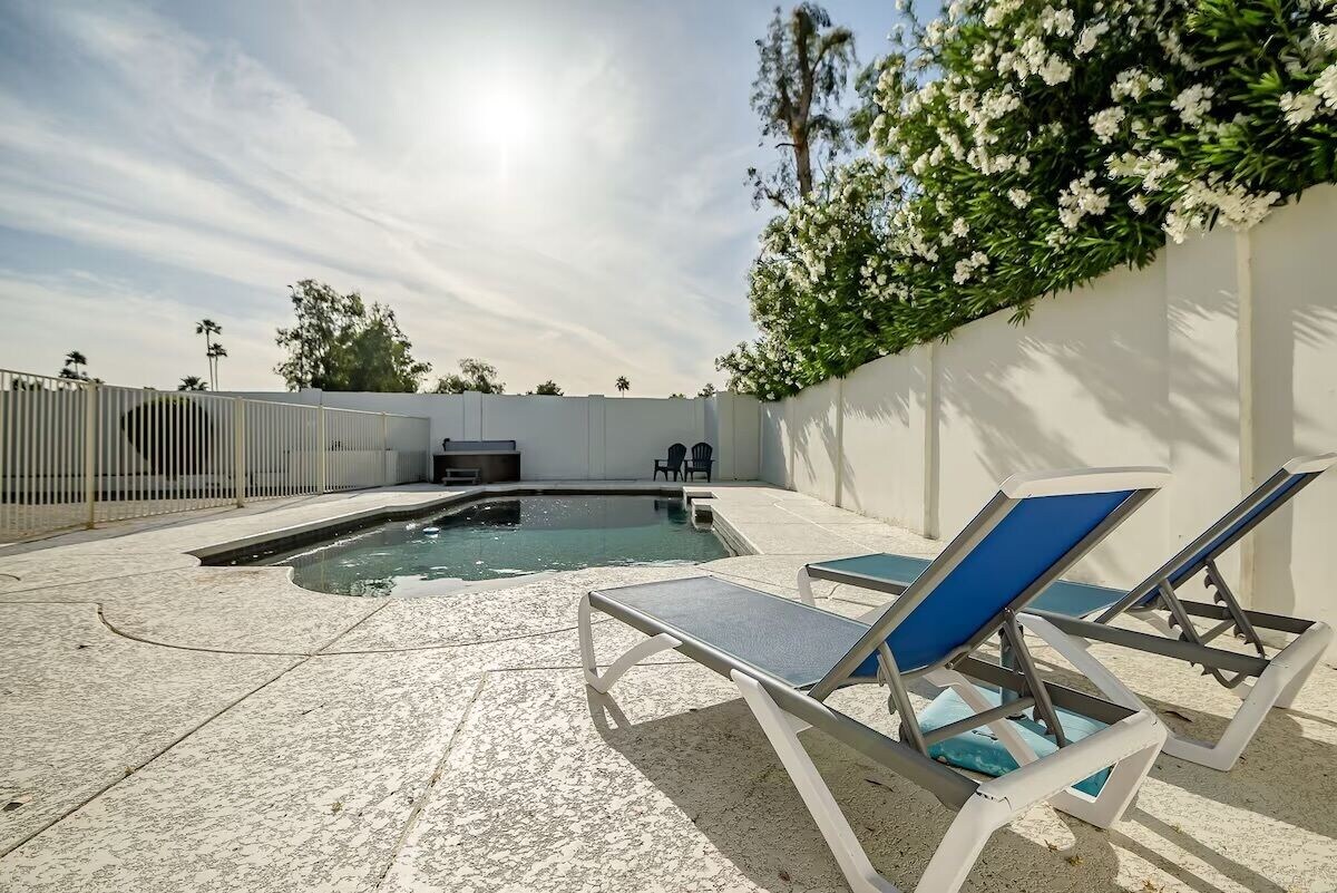 Welcome to Scottsdale Casa De Azul, your ideal getaway accommodation centrally located in the Scottsdale and Paradise Valley area. Here, you'll find yourself in close proximity to an array of attractions and activities, ensuring a memorable stay. Indulge in the culinary delights of award-winning restaurants, experience world-class golfing at nearby courses, and embark on adventures like hiking Camelback Mountain. Enjoy the private pool and jacuzzi during your stay and putting green. his property's central location also grants easy access to shopping and entertainment hubs like Desert Ridge Marketplace and Kierland Commons, making it a perfect choice for those seeking both relaxation and excitement in the heart of Arizona's stunning landscapes. Discover the best of Scottsdale and Paradise Valley from the comfort of Casa De Azul—book your stay now and elevate your Arizona getaway. This newly renovated single-story home offers a spacious 2,049 square feet with four bedrooms and three and a half bathrooms to accommodate up to 12 guests. After stepping through the front door, you will find yourself in the main open floor plan living area holding the living room, kitchen and dining room. Living Room: This room offers comfortable furnishing including a queen-size sleeper sofa, accent chairs, a 65” Smart TV, decorative fireplace (not operational). There’s an adjacent game/pool table area that offers a pool table, high-top game bar and plenty of board games! Kitchen: The kitchen is fully equipped with modern cooking appliances that is suitable for preparing any meal, from cooking a simple breakfast, quick snack or a full 3-course gourmet dinner. Spacious granite countertops provide plenty of space to cook whatever you desire. The kitchen comes with cookware and a variety of Organic Breakfast foods! Such as: ☞ Pancakes, Cereal, Coffee and Tea. ~Refrigerator & Stove ~Microwave ~Dishwasher ~Kurieg Coffee Maker ~Toaster ~Dinnerware ~Blender ~DINING ROOM~ The Dining Table with seating for 4 and also 4 additional bar stools for the bistro table when you have extra guest to visit.. ~LIVING ROOM~ Once you are ready to Rest and Relax, make your way to the living room to sit and relax with a comfy queen size sleeper sofa to watch your movies on the smart TV for the movie nights. ~Comfortable Sofa With Pillows ~Smart Tv 65 inch ~Book Selections ~Board Games ~Reading Lamps Bedrooms/Bathrooms: Master Suite — King bed, 20” Smart TV; the ensuite bathroom offers double sinks and a large walk-in shower. Bedroom 2 — Queen size bed Bedroom 3 — Queen size bed Bedroom 4/bunk room — Two twin-over-twin bunk beds, 30” Smart TV Premium Linens, Sheets, Pillows Walk-in Closets with Shelves and Hangers Night Stands with Reading Lights and Phone Charger Adapter Smart TVs ~2.5 Full Bathroom with shower/tub combo ~Vanity with mirror ~Toliet ~Hair dryer ~Essential toiletries Outdoor spaces: The backyard spaces offer a private pool (not heated) and hot tub. You’ll also enjoy lots of seating options including a dining patio table. There’s also a propane BBQ grill. Have some fun at the putting green! Internet Access: High-speed Wi-Fi Internet Pool: Yes, Private (Not heated) Hot Tub: Yes, Private Laundry: Full-size washer and dryer Parking: Driveway parking for four vehicles Air conditioning: Yes, central Pets: One dog allowed with $150 non-refundable fee Security cameras: Yes, front entry camera. Cameras are active during reservations. Additional Amenities: There is a pack n play available for guest use in the twin bunk room closet. Distances: Kierland Commons — 3.3 miles Scottsdale Quarter — 3.7 miles TPC Scottsdale — 5.5 miles McCormick-Stillman Railroad Park – 9.6 miles OdySea Aquarium — 10.8 miles Scottsdale Waterfront & Fashion Square Mall – 11 miles Old Town Scottsdale – 12.1 miles Scottsdale Airport — 4.0 miles Arizona TPT License #21514800 Phoenix Permit #STR-2023-001141 Our prices include all fees. No hidden fees.