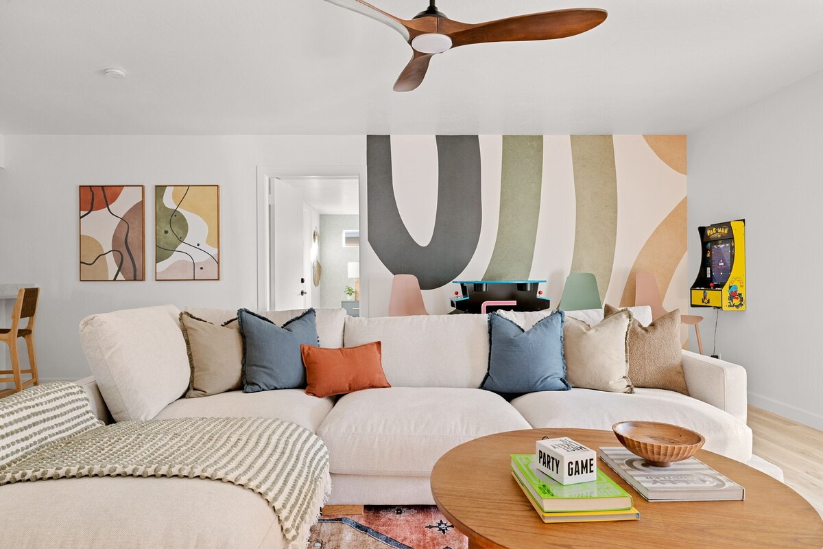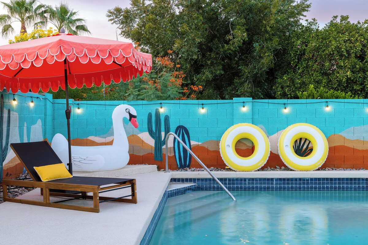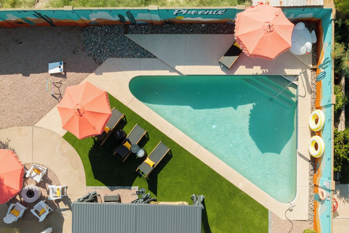-2 Private Suites – King Suite w/ Private Entrance + Thermostat -Heated Pool* + Hot Tub Included -Retro Arcade • Smart TVs • Board Games -Backyard Oasis – Fire Pit, Putting Green, Jenga -Prime Location – 15 min to Downtown, 25 to Scottsdale 5BR/3BA retreat made for families, groups, and celebrations. Relax by the firepit, soak in the hot tub, or challenge friends in the retro arcade—your Phoenix getaway starts here. - Two Private Suites – King Primary + Double Queen Suite (both w/ en-suite baths) - Heated Pool + Hot Tub – Swim year-round (pool heating fee applies) - Entertainment Everywhere – Retro arcade, Smart TVs, multi-sport game table, board games - Backyard Fun – Putting green, cornhole, ladder ball, giant Jenga, firepit + covered dining - Stylish Comfort – Plush bedding, curated décor, spacious gathering areas - Prime Location – 15 min to Downtown Phoenix, 25–30 min to Scottsdale OTHER THINGS TO NOTE - Pool Heating – $75/day (2-day minimum) or $300/week. Please request at least 24 hrs in advance. - Hot Tub – Always included at no extra charge. - Pets – Allowed with a one-time $150 fee per stay. THE SPACE: KITCHEN -Fully stocked with cookware, dishes, glasses & utensils -Coffee station with Keurig, drip coffee maker -Starter supplies: coffee, tea, sugar, creamer, cooking oils & basic spices -Double oven (w/ flex drawer for small meals) -Microwave + dishwasher -Large island with seating for 3 -Dining table seats 6 (expands to 8) LIVING ROOM -Spacious sectional sofa for group lounging -Smart TV with streaming apps -Retro arcade corner with multiple games -Board games for all ages -Ceiling fan for comfort BEDROOM 1 – KING SUITE -King bed with plush bedding & full-length mirror -Individual thermostat + large walk-in closet -Private entrance to backyard & pool area -Separate from other bedrooms (off the living room) for extra privacy -Ceiling fan for comfort -En-suite bathroom with walk-in shower -Smart TV with streaming apps BEDROOM 2 – DOUBLE QUEEN SUITE -Two queen beds with plush bedding -En-suite bathroom with shower + large vanity & makeup area -Ceiling fan for comfort -Smart TV with streaming apps -Desk + chair for remote work or study -Spacious closet BEDROOM 3 -Queen bed with plush bedding -Mountain mural feature wall -Smart TV with streaming apps -Ceiling fan for comfort -Closet storage -Full length mirror BEDROOM 4 – DOUBLE FULL ROOM -Two full beds -Smart TV + ceiling fan -Desk with chair (workstation) -Large botanical mural feature wall BEDROOM 5 – QUEEN ROOM -Queen bed with plush bedding -Smart TV + ceiling fan -Spacious closet SHARED BATHROOM -Single sink with large vanity + makeup mirror -New bathtub with modern tile -Stocked with shampoo, conditioner & body wash LAUNDRY ROOM -Washer & dryer -Starter detergent & dryer sheets provided -Convenient location right off the kitchen -Direct access to the garage OUTDOOR SPACE DINING & ENTERTAINMENT -Covered porch with dining table for 8 -Outdoor Smart TV -Foosball multi-sport game table -Oversized yard games: -Giant Jenga, -Connect 4, Dominoes, -Cornhole, -Ladder Ball -Two vibrant murals photo-worthy backdrop POOL & HOT TUB -Heated pool available (optional fee) -Hot tub under a pergola with adjustable louvers -Lounge area under pergola for shaded relaxation -5 pool loungers + multiple floats -Side tables that double as coolers for drinks EVENING VIBES -Fire pit with Adirondack chairs -String lights surrounding the property -3 large umbrellas for shade -Gas grill for group cookouts EXTRAS -Putting green for golf lovers -Small sitting area by the putting green for cocktails or conversation LOCATION HIGHLIGHTS -15 - 20 min to Downtown Phoenix -25–30 min to Old Town Scottsdale -25–35 min to several Phoenix-area Spring Training stadiums -Close to NASCAR, concerts & major events Upcoming Events (2025–2026) -Barrett-Jackson Car Auction – Jan 2026 -Waste Management Phoenix Open – Feb 2026 -Spring Training – Feb–Mar 2026 -Phoenix Marathon – Dec 2025 -NCAA Women’s Final Four – Apr 2026 -Reggae Rise Up AZ – Apr 2026 -Artlink First Fridays – monthly— FAQ (Frequently Asked Questions) Q: Is the pool heated year-round? A: Pool heating is available for $75/day (2-day minimum) or $300/week. Please request at least 24 hrs in advance. Q: Is the hot tub included? A: Yes! The hot tub is always available at no extra cost. Q: Do you allow pets? A: Yes, with a one-time $150 fee per stay. . Q: Is early check-in or late check-out possible? A: We try to accommodate when our cleaning schedule allows. Most times we can’t confirm until the day before, but if the home is ready, we’ll gladly accommodate at no extra charge. Q: How far are you from Spring Training stadiums? A: We’re centrally located — about 25–35 minutes from several Phoenix-area Spring Training venues. What Guests Are Saying - “Exactly as described — and even better in person. Everything was clean, comfortable, and the host was incredibly hospitable.” – Family Weekend Trip, July 2025 -“Perfect for our work trip — like we each had a mini hotel room but still got to stay together. So spacious and clean!” – Business Group, Apr 2025 -“The outdoor space was our favorite part — pool, hot tub, fire pit, and plenty of seating. We never felt cramped.” – Family Celebration, Jan 2025 -“One of my favorite rentals ever! Thoughtfully designed for large groups, with everything we needed. Highly recommend.” – Group Trip, Feb 2025 Our prices include all fees. No hidden fees.