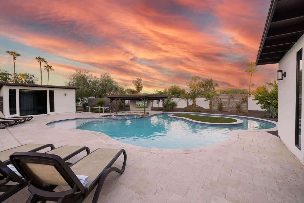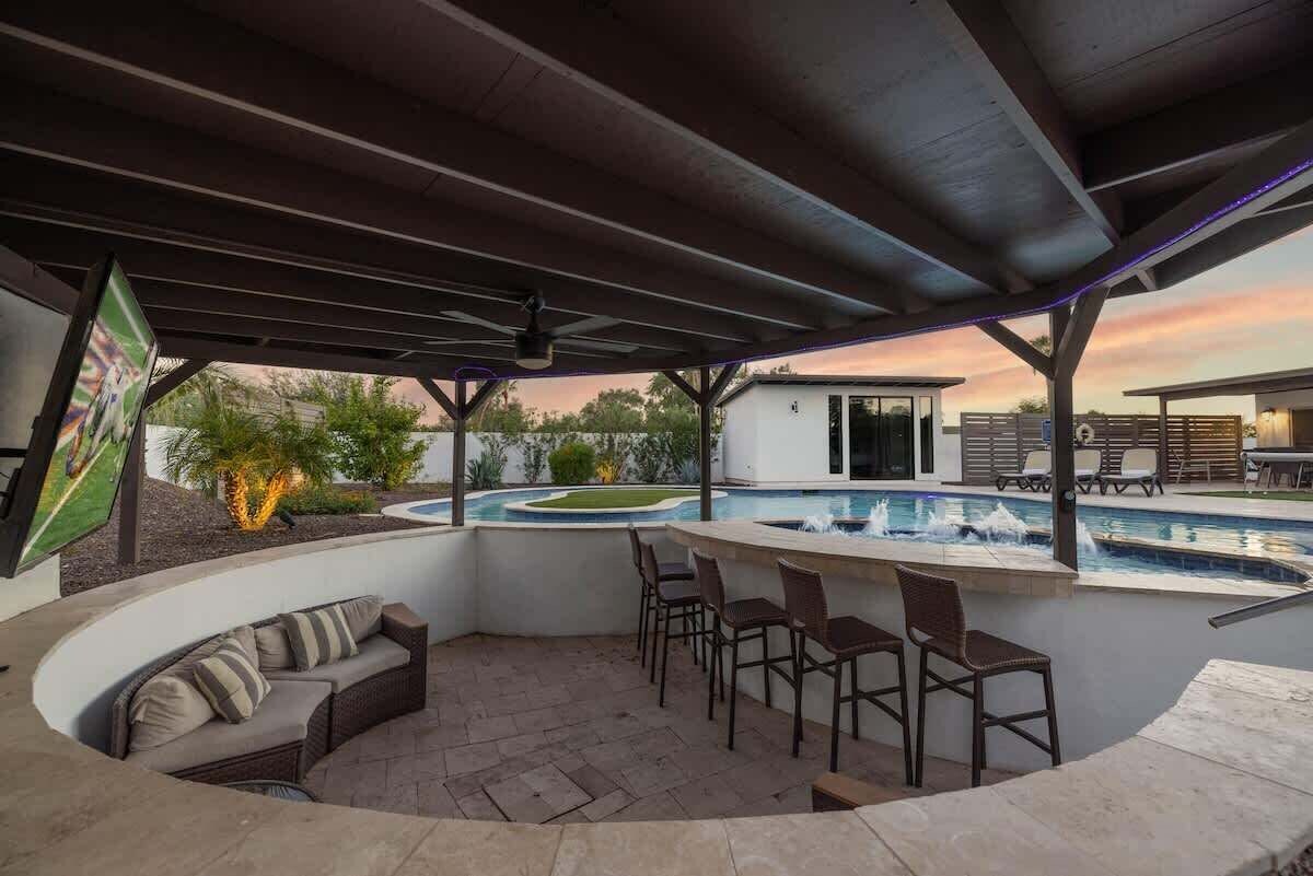Summary: Welcome to Luxe Resort Retreat, a luxurious vacation home nestled in the highly desired neighborhood of North Scottsdale, just a short 4-min drive away from the renowned Kierland Commons. The Space: Backyard: Step into your own private oasis in the backyard of Luxe Resort Retreat. Here, you'll find a true paradise with a lazy river pool featuring a swim-up bar, inviting you to relax and bask in the warm Scottsdale sun while enjoying your favorite tropical beverage. Unwind on the lounge chairs or catch up on your favorite shows on the backyard TV. For some friendly competition, challenge your friends to a game of pool on the indoor pool table or showcase your golf skills on the putting green. Living Area: The open-concept layout of the living area sets the stage for entertaining and relaxation. Sink into the plush sofas and enjoy quality time with your loved ones while admiring the tasteful decor and modern finishes. The spaciousness of the room allows for seamless flow into the dining area and kitchen, ensuring that conversations and laughter can be shared throughout the space. Kitchen: The fully equipped kitchen at Luxe Resort Retreat is a dream for culinary enthusiasts. Recently upgraded with top-of-the-line appliances, including a large refrigerator, double oven, and gas stove, it offers everything you need to whip up delicious meals. The beautiful marble countertops and a large kitchen island provide ample space for food preparation and comfortable seating for everyone to gather and enjoy meals together. Bedrooms: The bedrooms at Luxe Resort Retreat are a haven of comfort and style. Each of the 6 bedrooms is thoughtfully designed and tastefully decorated, offering spacious retreats for rest and rejuvenation. Comfortable beds adorned with soft linens invite you to indulge in a peaceful night's sleep. With the convenience of individual bathrooms for each bedroom, privacy is guaranteed, allowing everyone to enjoy their own personal space. Entertainment: Beyond the luxurious amenities of the home, Luxe Resort Retreat's location offers a wealth of entertainment options. Just a short 4-minute drive away is the renowned Kierland Commons, a vibrant shopping and dining destination. Explore a variety of upscale boutiques, indulge in culinary delights at world-class restaurants, or unwind with a refreshing drink at one of the trendy bars. Additionally, Scottsdale is known for its golf courses, hiking trails, and cultural attractions, ensuring that there is something for everyone to enjoy during their stay. From the moment you arrive at Luxe Resort Retreat, you will be enveloped in a world of luxury and tranquility. With its stunning design, top-of-the-line amenities, and convenient location near Kierland Commons, this vacation home is the perfect choice for a memorable stay in Scottsdale. Whether you spend your days lounging by the lazy river pool, exploring the vibrant local hotspots, or simply relishing in the comfort of the beautifully appointed interiors, Luxe Resort Retreat promises an exceptional experience that will create lasting memories. Bedroom Setup: Primary Bedroom: 1 King Bed and 2 Twins (Trundle Bed) with en-suite bathroom 2nd Bedroom: 1 King Bed with en-suite bathroom 3rd Bedroom: 2 Full Beds with en-suite bathroom 4th Bedroom: 2 Full Bed with en-suite bathroom 5th Bedroom (detached Studio Suite): 1 King Bed with en-suite bathroom 6th Bedroom (detached Studio Suite): 1 King Bed with en-suite bathroom Interested in Pool Heat!? Pool heat is typically requested between Oct-Apr when nightly temperatures get cooler. For this particular home, pool & spa heat is $150/night and only available for the full duration of your stay. Spa heat only is $100/night. Please note that we require 5 days notice from check-in if you want to add this amenity. TPT License Number:21345349-023 Per city ordinance we have noise aware systems to monitor noise levels and exterior monitors of the property. Any tampering of security and systems could result in fees and eviction. Occupancy/Family Size Properties must limit all short-term rental occupancy to have a maximum family size of six adults and their related dependent children. Management reserves the right to evaluate and consider every reservation made by locals, individuals under 25 years of age, and those booked the day before or the same day of check-in. As part of our standard procedure, we will require a fully refundable security deposit of $1000. The deposit will be refunded upon check-out, provided the renter is responsible for no damages or incidents. Other Things to Note: This magnificent 6BR, 6BATH home offers the perfect blend of opulence, comfort, and convenience, ensuring an unforgettable stay in the heart of Scottsdale. Guest access Guests have access to the entire property and outdoor space. Additional House Rules: - Booking guests must be at least 25 years old. - Same-day move-ins shall not be honored after 10 am Mountain Standard Time. - If you are a local person, you must be pre-approved to book this house. Please make an inquiry and we will approve or disapprove at our discretion. And is subject for a $1,000 Security Deposit which is fully refundable after the stay. - All guests with a confirmed criminal record shall be declined and asked to cancel the booking at their own expense. - The guest agrees to provide identity authentication. They will authenticate the name, address, phone number, photo ID verification, and selfie. If this is not provided within 48 hours of booking, House & Home has the right to cancel the booking without penalty. - All listed amenities are to be used at the guest’s own risk. The homeowner and H&H Vacations will not be held liable in any way for the risk, danger, injury, or damages caused to the other party. - Parties, events, or weddings are not allowed. - The City of Scottsdale requires no more than 6 non-related adults per home, not including children. Explore the Area: 4 mins: Kierland Commons