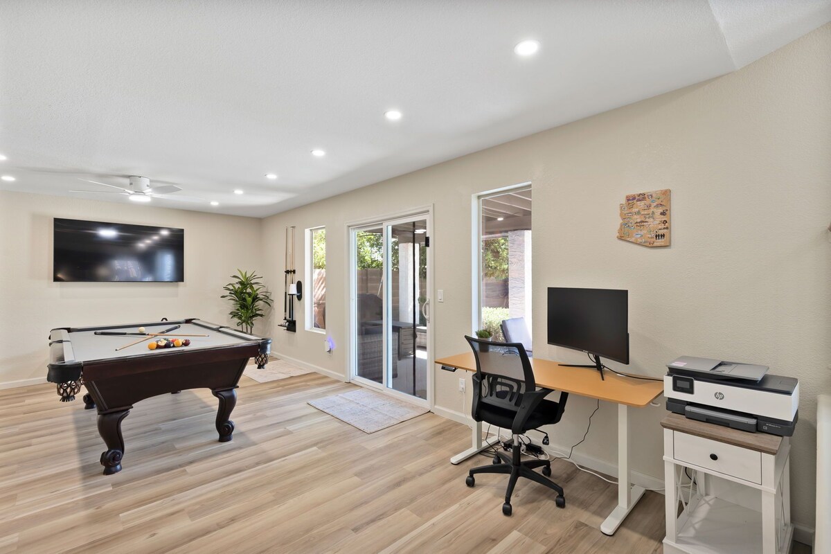Inside, enjoy a fully equipped kitchen, open living area, billiards, PS4, board games, and fast Wi-Fi for work or streaming. Outside, relax by the pool, fire pit, or BBQ on the private patio with loungers — your own slice of sunny Arizona.