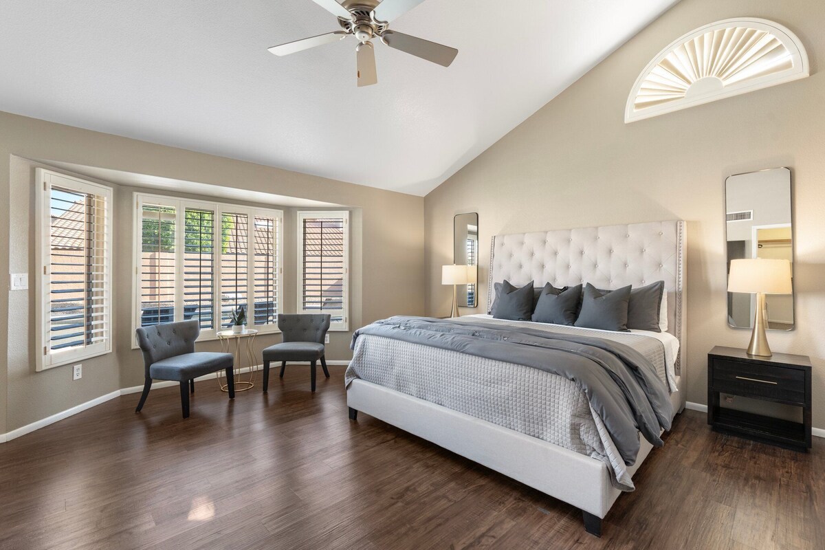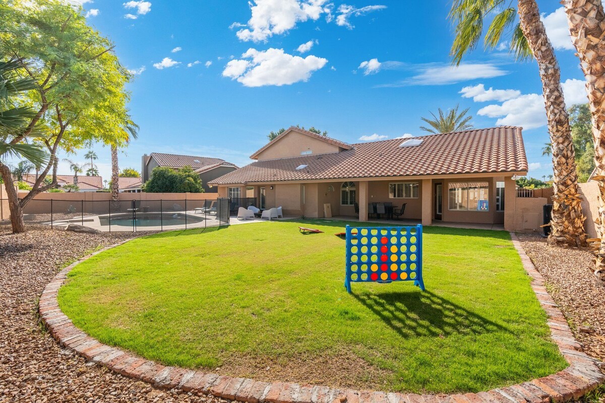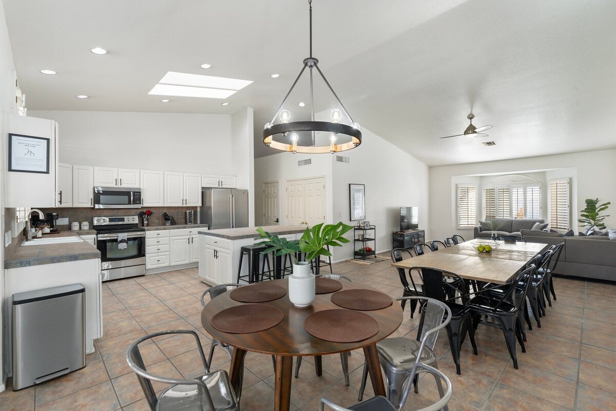 **CONTACT US FOR ADDITIONAL HOMES/SPECIAL MONTHLY RATES** Escape to our spacious 7-bedroom, 4-bathroom Scottsdale vacation rental! 3,530 sq. ft. of living space, this luxury retreat is designed for comfort and connection. Ideal for large families, friends, golf trips, or corporate retreats, the home offers something for everyone. Located a short drive from Old Town Scottsdale, Kierland Commons, Scottsdale Quarter, top golf courses, hiking trails, and world-class dining and nightlife, this property makes the perfect home base for your Arizona getaway. ------------------------------------------------------------------------- AMENITIES: • Free high-speed Wi-Fi • Keyless entry for hassle-free check-in and check-out • Games room with a pool table and flat- screen TV • Two master bedrooms with king-size beds, designer furniture, and flat-screen TVs • Fully stocked kitchen with high-end appliances, including a double ceramic farmhouse sink and Keurig coffee machine • Spacious family room with a comfortable sectional • Full laundry room with top-of-the-line washer and dryer • Generous backyard with a patio, built-in commercial-grade Turbo grill, firepit, and a large HEATED* pool and spa • RV gate and spacious driveway for multiple vehicles • Accessibility: No stairs needed to enter; double door entrance, bedrooms, and walk-in shower without stairs ------------------------------------------------------------------------- THE LAYOUT: Main Level (No stairs required) • Bedroom 1: King suite with ensuite (huge soaking jacuzzi & walk-in shower) • Bedroom 2: Queen bed • Bedroom 3: Queen bed • 1 full bathroom with tub/shower combo (no stairs required) Upper Level • Bedroom 4: King suite • Bedroom 5: 2 twin bunk beds • Bedroom 6: 2 double beds • Bedroom 7: Queen bed + twin bunk • Bathroom 2: Double vanity with separate enclosed tub/shower combo and toilet • Bathroom 3: Double vanity with stand-up shower ------------------------------------------------------------------------- Extra Services: • Heated Pool and Spa: $75/day for both, $50/day for pool, $50/day for spa (*temperature set to 83-85 degrees; advance notice required) • Concierge Services: Pre-stocked fridge, housekeeping, catered dinners, event decor, restaurant reservations, specialty packages (fees vary, contact us for details) ADDITIONAL INFO: • Weekly pool and landscaping services require access to the backyard • Discounts for extended stays (7 days or more) HOUSE RULES: • No smoking inside the home (penalty: $500/day) • Non-aggressive pet breeds allowed with a $50 fee per pet/per stay; no pets on beds, furniture, or in pool • No eating or drinking in the bedrooms • No moving of indoor/outdoor furniture • Registered guests only; no additional people without permission • NO parties; fines for unauthorized events • GOOD NEIGHBOR POLICY: Our neighborhood is a lovely, quiet residential area. Quiet hours (9 PM-8 AM) are strictly enforced per city ordinances. NO outdoor noise during this time, and music/noise inside the home cannot be loud enough to be heard outside. Daytime noise levels must be under 60 dBA. Outdoor music and/or excessive noise (e.g., yelling, noise amplification, musical instruments, animal barking) must be kept to a respectful minimum at all times. • NO parties. Evidence of a party or unauthorized event, including camera footage, excessive garbage, or other evidence, will result in a fine of $5000, legal action, and possible eviction without reimbursement, plus the cost of any extra cleaning or damages. GENERAL RULES: • Check-in: After 4 PM, Check-out: 11 AM • Late check-out penalty: $50; guests will be charged for any lost revenue due to late check-out • No drugs or firearms allowed • No illegal activity on the premises • Excess trash/recycling fees: DO NOT overfill bins. Extra pickup charges: $100-$199. • No street parking; ample parking on property (2-car garage, RV gate, LARGE driveway) BOOKING RULES: • Guests will receive door code and check-in instructions 24-48 hours prior to check-in. • Biweekly house cleaning required for stays longer than 28 days • This property cannot be used for purposes identified in City of Phoenix Ordinance Section 10-195(c). Your dates are not available? Looking to book for several groups? Check out our other properties: • Desert Oasis (5 bedroom/3 bath) • Luxury 6 bedroom/3 bath Our prices include all fees. No hidden fees.
