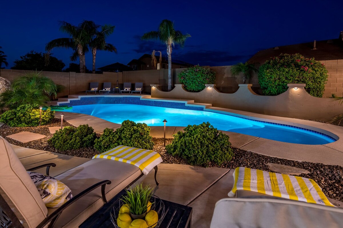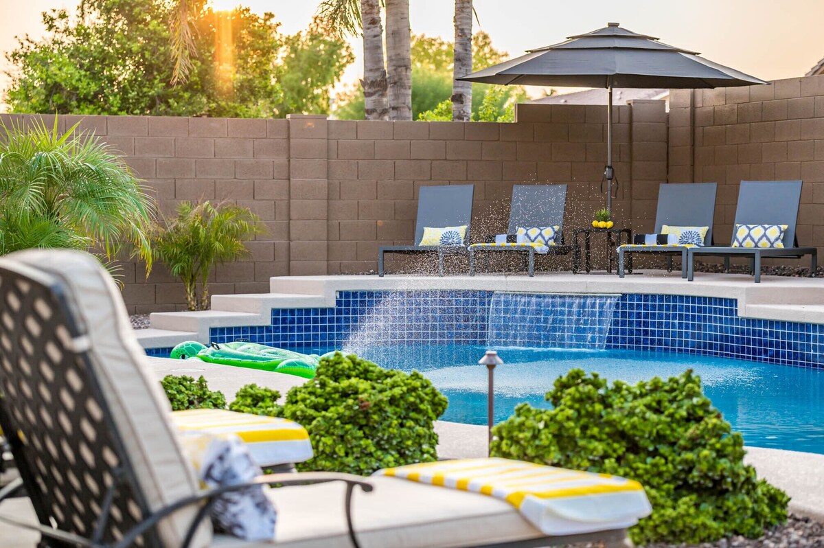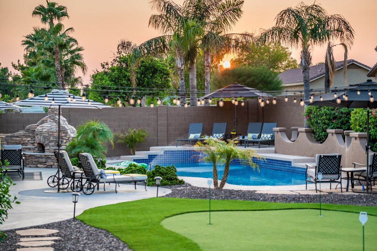 BEDS for all 20 people (Sleep Number bed in Master). Just 7 miles to PEORIA SPRING TRAINING; 15-20 to STATE FARM STADIUM; GILA RIVER ARENA, AK-CHIN PAVILION. You will feel like you are on a vacation retreat the second you drive up with palm trees lining the entry. As you enter, you can stop for a game of BILLIARDS, FOOSBALL, PING PONG, or some card games at the POKER TABLE or continue on through the open concept family room. You will see the beautiful backyard POOL as well as the GOLF PUTTING GREEN. Throw your suit on and go relax poolside where there are multiple lounging areas with more palm trees that add a nice ambiance. If you need more to do, we have multiple yard games as well as a PING PONG table. Later that evening you can enjoy the barbecue area and the outdoor fireplace. The evening lighting will set your mood for a memorable vacation. We have wonderful neighbors, so we ask that you have quiet time starting at 10pm and no parties are allowed. As you make your way in for bed, you can enjoy your favorite shows on any of the 9 flatscreen TVs throughout the house all with YouTube TV with over 100 channels. Beautiful furnishings/beds all throughout this 4300SF, 7 bedroom house with 11 beds. Perfect for multi-family gatherings and sports teams with enough beds to comfortably sleep 20 people including a large master bedroom as well as an ensuite. PRIME LOCATION ideal for Sporting Events & Family Fun- Just minutes away from: *. Victory Lanes Sports Complex *. Arizona Sports Complex *. PEORIA SPORTS COMPLEX (Spring Training San Diego Padres & Seattle Mariners) *. Six Flags Hurricane Harbor Water Park *. Thunderbird Conservation Park Hiking Trails *. The 500 Golf Club. *. STATE FARM ARENA (Cardinals Football) *. GILA RIVER Arena *. Westgate Entertainment District (8m SF of shopping/entertainment). *. Desert Diamond Casino, *. Top Golf *. Tanger Outlet Malls *. Scottsdale Quarter (20m) Check in 4pm; Check out 10am Pool Heating is available up to 82 degrees. Security Cameras on the front & side of the house. Pool does not have a fence. Keyless Entry will be given by host prior to arrival. Host is available to assist you with any of your needs. We aim to reach a 5 star level of service for every stay, so please let us know how we can make your stay the vacation you expected. This property cannot be used for purposes identified in the City of Phoenix Ordinance Section 10-195(c). The City of Phoenix short-term registration number for this property is 2021-1372 Our prices include all fees. No hidden fees.