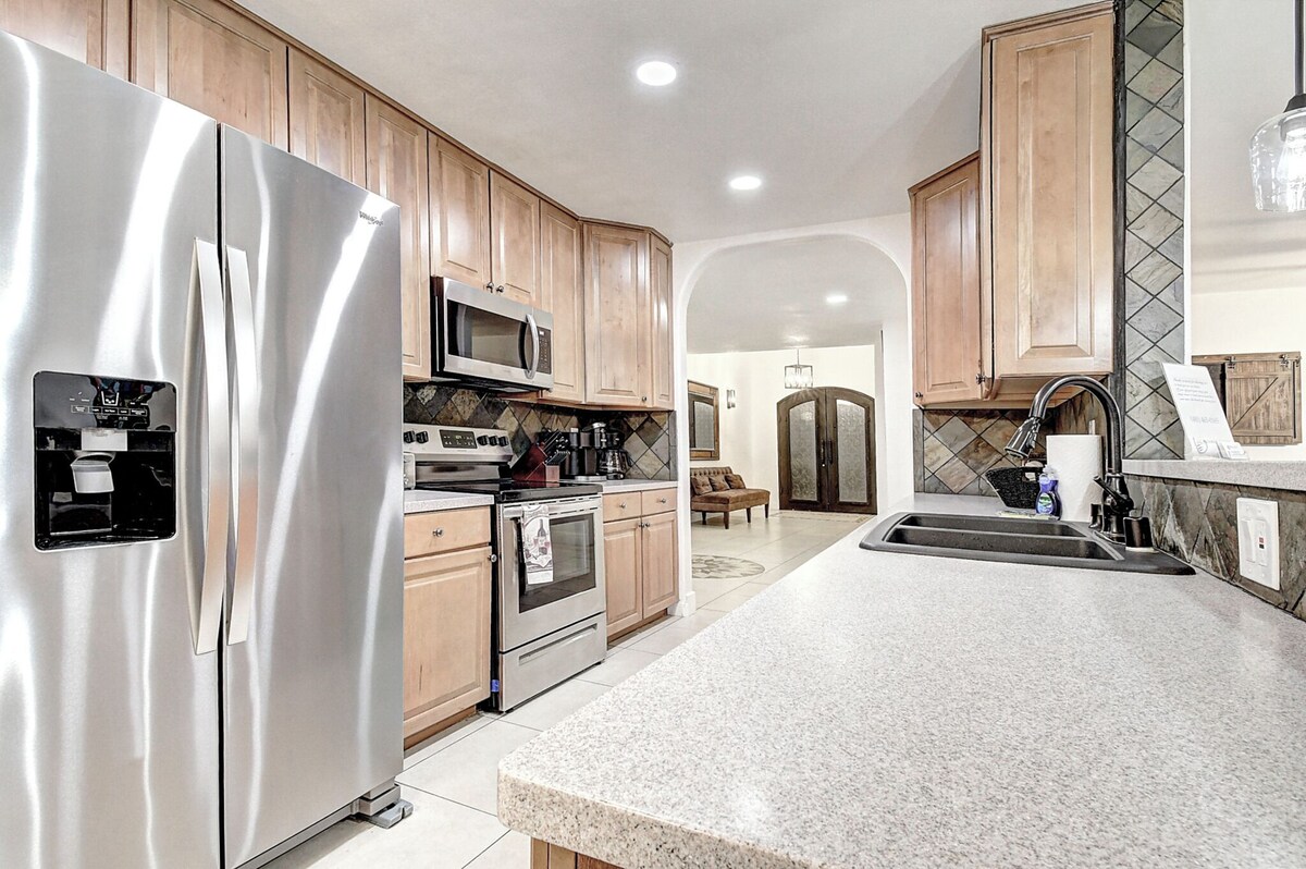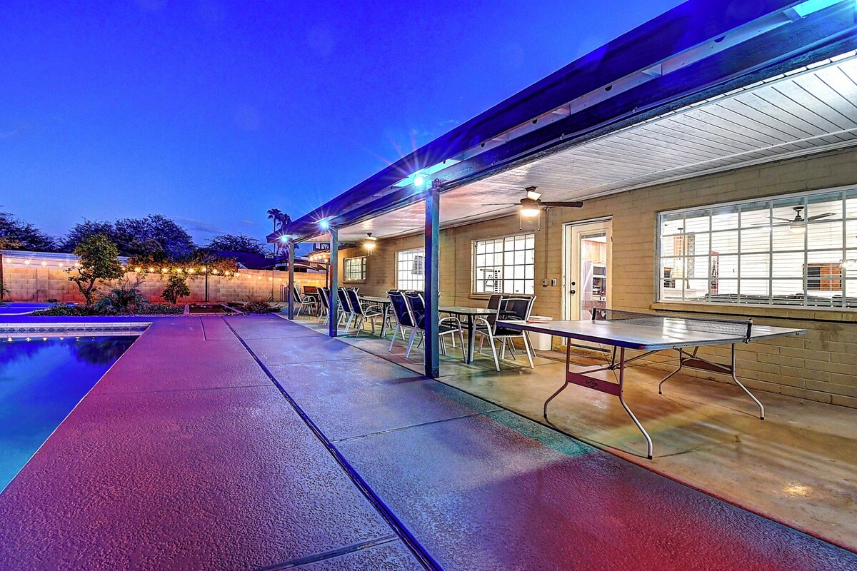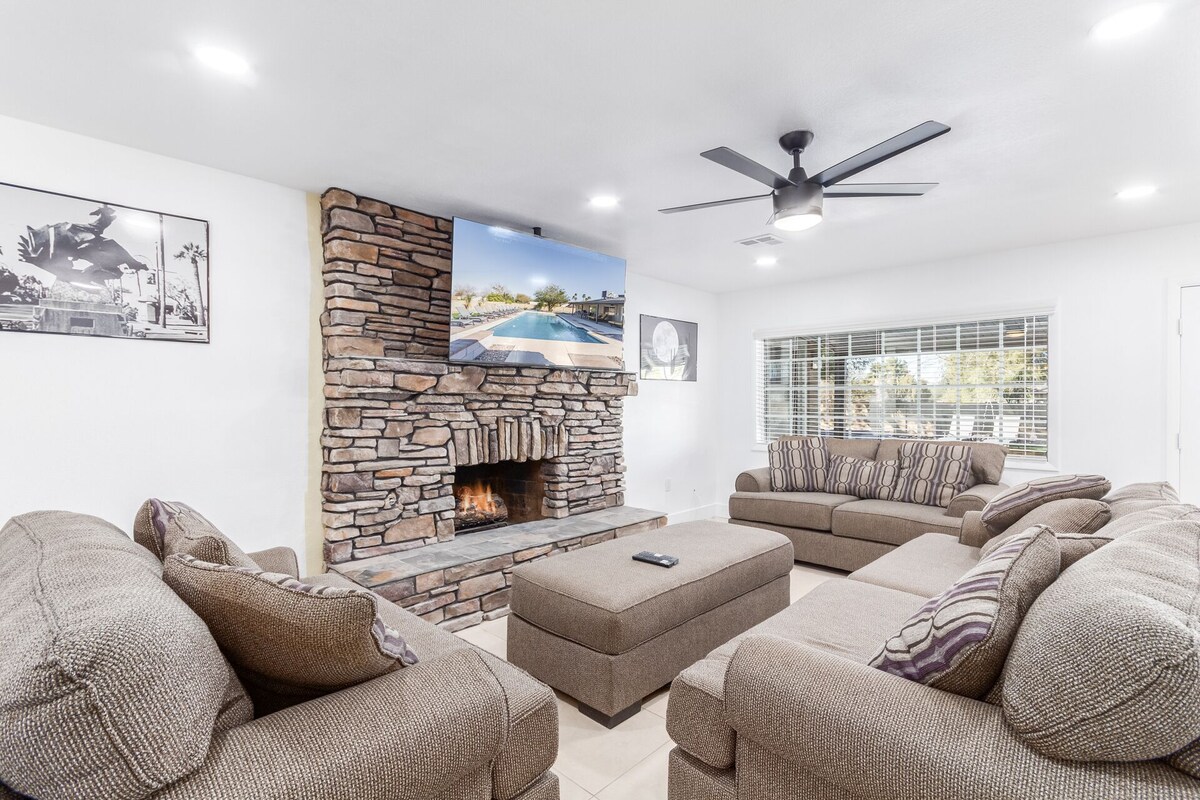 Shangri La Estate | Sleeps 36 | Resort-Style Pool, Spa, Courts, & More! Scottsdale luxury at its best! Welcome to Shangri La — a private multimillion-dollar estate perfect for group trips, golf retreats, family reunions, or bachelorette parties. Enjoy a massive private pool, hot tub, pickleball and basketball courts, putting green, billiards, and Vegas-style cabana — all on-site! * Smoking allowed outdoors only in Rock Cabana Located just minutes from Old Town Scottsdale, Waste Management Open, Barrett-Jackson, and more, this 9-bedroom estate has space, style, and endless entertainment. Sleeps 36 | 9 Bedrooms + Bonus Room West Wing Primary Suite 1: 1 King (private bath) Primary Suite 2: 2 Queens (private bath) Central Wing Bedroom 3: 2 Queens Bedroom 4: 1 King East Wing Bedroom 5: 2 Queens Bedroom 6: 2 Queens Bedroom 7: 1 King Bedroom 8: 4 Full Beds (Adult Bunks, private bath) Bonus Room (Optional) Bedroom 9: Garage conversion w/ 2 Fulls + Queen Sofa Sleeper + TV + Extra Fridge Highlights & Amenities HUGE Private Pool (Heat Optional: $200/day or $1,000/week) Therapeutic Spa (Optional: $150/stay) Pickleball & Basketball Courts Bocce Ball, Bean Bag Toss, Ping Pong, Putting Green Poolside “Vegas Rock Cabana” w/ 65\ ,