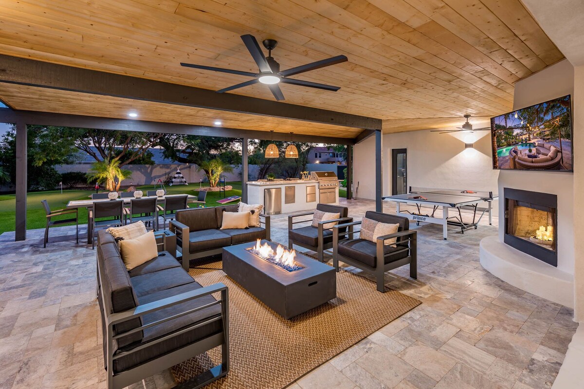 Amazing resort-style property located in a beautiful upscale neighborhood just 18 miles to stadium! Gorgeous property loaded with amenities. FREE Heated pool, huge PUTTING GREEN, massive covered patio, OUTDOOR KITCHEN, YARD GAMES, HORSESHOES, etc. POOL TABLE, POKER/GAME ROOM, PING PONG, BASKETBALL, big screen TVs throughout house. Nearly everything on this property is brand new thanks to a $500k renovation just completed. NEW finishes throughout, new appliances & all new furnishings. HIKING right out front door and still so CLOSE TO EVERYTHING - 5 minutes grocery stores, restaurants, shopping, golf, water park, and entertainment. Trail head connects to a beautiful city park with tons of amenities, including tennis, pickle ball, basketball, soccer fields, playground area, and more! PRIME LOCATION ideal for sporting events & family fun- Just minutes away from: * Nortera Shopping Center (700,000sf of retail/restauarants) (3 miles) *. The 500 Golf Club. (1 Mile) * Golf courses (many within 15 minutes) *. Victory Lanes Sports Complex (3 Miles) *. Arizona Sports Complex (3 Miles) *. Peoria Sports Complex (Spring Training San Diego Padres & Seattle Mariners - 9 miles) *. Six Flags Hurricane Harbor Water Park (2 Miles) *. Thunderbird Conservation Park Hiking Trails (2 Miles) *. STATE FARM ARENA (Cardinals Football) (18 Miles) *. GILA RIVER Arena (18 Miles) *. Westgate Entertainment District (18 miles) *. Desert Diamond Casino (17 Miles) *. Top Golf (18 Miles) *. Tanger Outlet Malls (18 Miles) *. Scottsdale Quarter (20 Miles) Check in 4pm; Check out 10am Pool Heating is FREE 82 degrees. Security Cameras on the front & side of the house. Pool does not have a fence. Pool Heating is set to 82 degrees. (if air temps drop below 40, heater may not be able to \ ) Keyless Entry will be given by host prior to arrival. Host is available to assist you with any of your needs. This property cannot be used for purposes identified in the City of Phoenix Ordinance Section 10-195(c). The City of Phoenix short-term registration number for this property is 2021-1372 Our prices include all fees. No hidden fees.