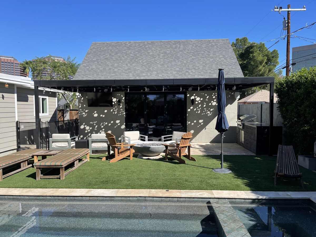 Beautifully remodeled Tudor located in historic Willo neighborhood. Originally one of Phoenix’s first suburbs planned in the 1920’s, is now part of the core of Central Phoenix and all the amenities. This stunning home includes a private guesthouse with kitchenette and full bathroom. Private pool, jacuzzi, gas fire pit and gas BBQ grill. 2 minute walk to St. Joseph’s Hospital, 5 minute walk to light rail, and just blocks away from downtown. Fantastic restaurants, museums, sporting events, and entertainment venues just down the street. The main house has 2 bedrooms downstairs, 2 bedrooms upstairs and 3 full bathrooms. The living room and dining room open to a newly remodeled bright kitchen and butler pantry. The kitchen is appointed with stainless steel appliances, modern stone counter tops and all the tools needed for meal prep and service. Beautiful wood floors and modern tile lead from one spacious room to another. A mud room side entry and separate laundry are located on the main floor. The ensuite spa bathroom off the master has a modern, glass walled walk in shower, soaking vessel tub and double sinks. The separate, private casita is located in the back of the main house. Full wall glass doors open to the outdoor patio, pool, jacuzzi and gas BBQ grill. There is a kitchenette with full size fridge, coffeemaker, counter space, cabinets and shelves and a dining table that seats four. A full bathroom is located on the lower lever with a modern walk in shower, sink and toilet. There is a comfortable queen size sofa sleeper downstairs and a large, private bedroom upstairs with a king size bed. Make this your home base while easily enjoying all the activities Phoenix has to offer.. Our prices include all fees. No hidden fees.