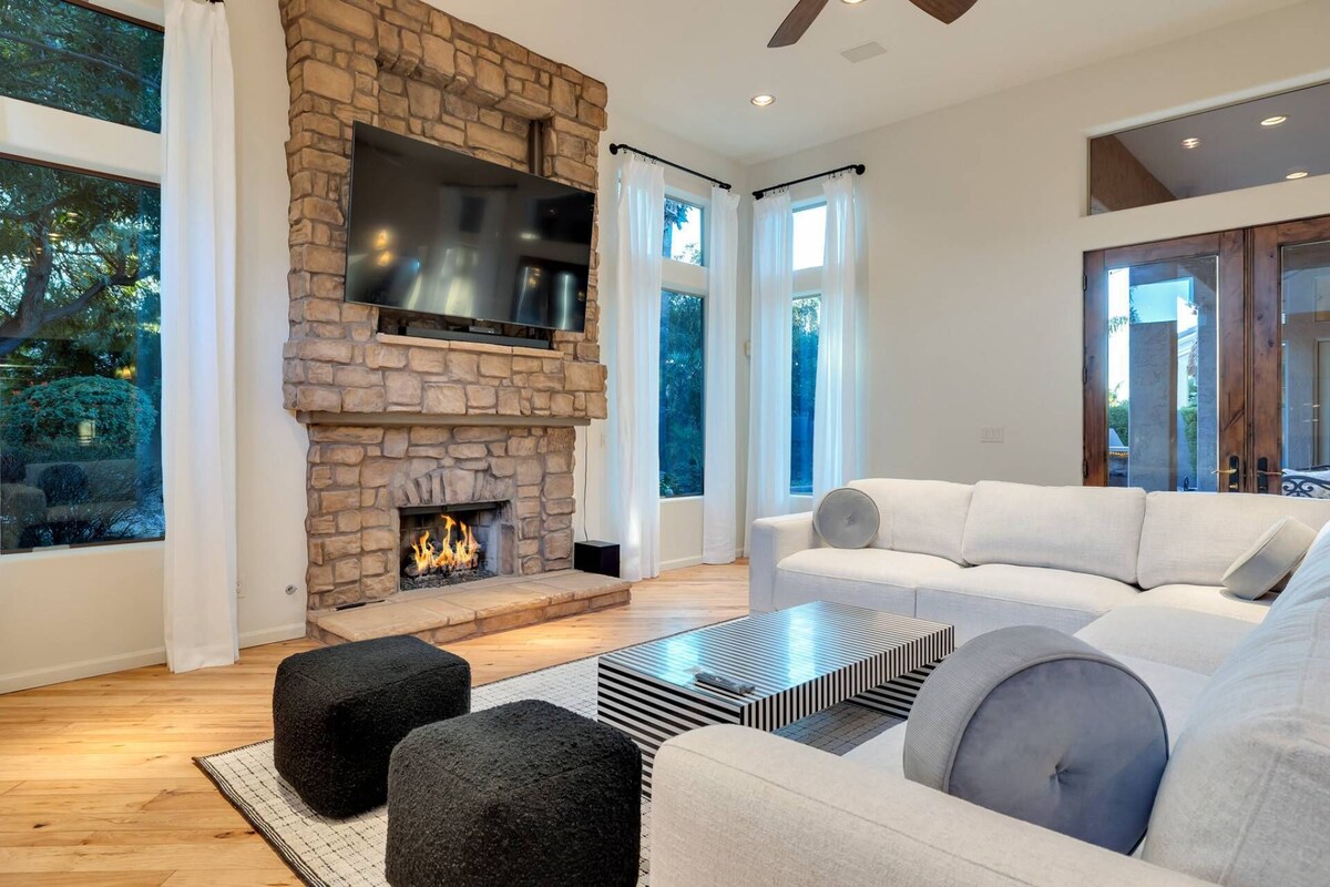 **Please read the description in its entirety. The calendar reflects real time and is always up to date Come experience the one of a kind beautifully decorated single story home that features 3 bedrooms, 2.5 bathrooms, den with desk and sleeper sofa plus 3 twin size roll away beds for additional sleeping. Just minutes to Scottsdale Quarter, Desert Ridge and Kierland Commons unique, upscale outdoor lifestyle center that artfully blends shopping, dining, and entertainment. Nearby you will find numerous golf courses including the TPC Scottsdale, family friendly entertainment, movie theaters, Spring Training Baseball, hiking and biking trails and so much more. It's also near the Mayo Clinic with easy access to major freeways and Scottsdale Road which makes getting to any part of the Valley a breeze! There's plenty to enjoy inside the home but the backyard and pool can really bring everyone together making memories that will last a lifetime! The backyard features a private heated Saltwater Pool with rock waterfall (There is a $85.00 per night pool heat fee that is automatically applied to each booking from October 1st through May 31st. Pool will not be heated any other month), lounge chairs, large, covered patio with outdoor seating, 45” smart TV w/ Youtube TV live, outdoor wood burning fireplace with seating area and a table for outdoor dining so you can fire up the built-in gas grill and get everyone together because happiness is BBQ, friends & family! It really doesn’t get any better than this. *Traveling with a dog? No problem your pup can catch some Arizona rays and sunbathe right along with you on the lounge chairs. If you are traveling with your dog let us know upon booking. Your reservations will require a $250 + tax non refundable pet fee in addition to the total on the checkout page so we will need to add this to your reservation after you book the home. KITCHEN -Keurig Coffee Maker -Dishes and Utensils -Dishwasher -Refrigerator -6 burner Gas stove -Double Ovens -Microwave DINING -Seating up to 8 plus 2 barstools Master Bedroom -King size bed -65” TV w/ Youtube TV Live -Dresser -Private bathroom -Double sinks -Walk in shower -Separate Garden Tub 1st Guest Bedroom -Queen size bed -65” Smart TV 2nd Guest Bedroom -King size bed -35” Smart TV Den -Full size sleeper sofa -42” Smart TV w/ Youtube TV Live Guest bathroom -Double Sinks -Walk in Shower 1/2 Bathroom w/ single sink GENERAL -Full size Washer and Dryer -YouTube TV Live -Iron & Iron mat -Blow Dryer -Internet/Wifi -3 roll away beds for additional sleeping arrangements -Parking: 2 car garage as well as additional parking in the driveway Walk in the door and feel right at home as you enter the living and dining room with beautiful views overlooking the backyard and pool. We know just how important it is to prepare your meals during your stay so you can enjoy the equipped kitchen that features a large island, refrigerator, microwave, 6 burner gas cooktop, double ovens, dishwasher, blender, toaster, kitchen utensils and a Keurig coffee maker. There is also a cute nook with a table and seating for 2 that overlooks the backyard. Just off the kitchen is the family room with a large sectional couch where you can relax and enjoy the gas fireplace while watching the 75” smart tv w/ Youtube TV live or snuggle up and read a book. The master bedroom features a King size bed, 65” smart tv w/ Youtube TV live, dresser and private master bathroom with double sinks, a large corner large walk-in shower with dual shower heads plus a separate garden tub. You also have direct access through the French doors to the backyard from the master bedroom. The first guest bedroom has a Queen size bed and a 27” TV w/ Youtube TV live. The second guest bedroom has a King size bed and 35” TV w/ Youtube TV live. The den features a sleeper sofa (full size), 42” smart TV w/ Youtube TV live and a small desk. Linens and towels provided. We also provide a few items to get you started of hand soap, dish soap, toilet paper, paper towels, trash liners, shampoo, and conditioner. *Dogs Okay *No Smoking allowed *For the safety of our home and guests, exterior property front is under 24/7 video surveillance. This property cannot be used for purposes identified in the City of Phoenix Ordinance Section 10-195(c). The City of Phoenix short-term registration number for this property is: 2023001412. The Owner, renter, and the guest may be liable for up to $2,000 to cover the costs of police response to the property pursuant to section 2-22 of the Phoenix City Code. Property TPT Tax ID: 2 1 4 7 9 6 1 4 Our professional cleaners use CDC-approved products to sanitize and disinfect each of our properties. Let us help create exciting memories and have more fun when you stay with us by providing FREE ADMISSION when you stay between OCTOBER 1ST THROUGH APRIL 30TH. Enjoy some of the area's top attractions per day including: Golf at Starfire Golf Club - (Closes for winter grass reseeding annually. Usually around end of September to middle of October) Medieval Times Pangaea land of the Dinosaurs Phoenix Zoo Scottsdale Segway Tours Free Fun! Guests will receive one complimentary admission per activity, per day. You can go to every activity, every day and one person will be free per day. Additional guests will pay full price. Admissions are noncumulative and nontransferable. Unused admissions expire daily. You may choose to go to the Phoenix Zoo in the morning then golf at lunch and then Medieval times that evening. **Please note this Free Fun package is for free admissions listed above and is only available on stays beginning October 1st through April 30th. Not valid on stays 28 nights or more. Our prices include all fees. No hidden fees.