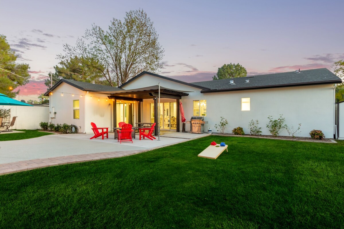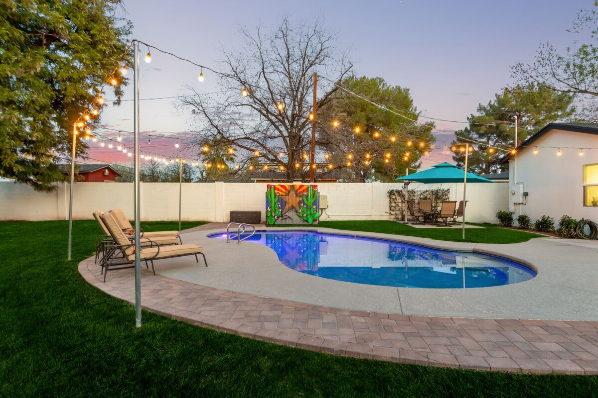 Welcome to the Whitton House! Kick back & relax with your family & friends in this 5-bed, 3.5-bath home with sleeping for 14 guests. Located minutes from Sky Harbor International Airport (PHX), Downtown Phoenix, The Wrigley Mansion, AZ Biltmore Golf & Resort, and a short drive from State Farm Stadium (home to the Arizona Cardinals), the TPC Scottsdale (home to the WM Phoenix Open), multiple Spring Training destinations, the Phoenix Zoo, world class golf, countless hiking trails, and 5-star dining. The newly-renovated home features an open-concept great room with a kitchen fully stocked with tools, a dining room table that seats 8, an oversized sofa with a huge TV to match, and a bar with a wine fridge. Just off the great room you will find a \ game room with a regulation-size pool table, another sofa, another full-size fridge, a huge TV, toys, children's books, and board games. Along the same hallway as the man cave are the powder room and laundry room with two full-sized washers and dryers. The massive Bedroom 1 has a king bed, sitting area, and an even more massive en suite bathroom with a shower, spa tub, toilet room, and walk-in closet. Bedrooms 2, 3, and 4 all have king beds and Bedroom 5 has queen bunk beds with railings, perfect for kids to share. These four bedrooms share two bathrooms, one with a full tub and one with a shower. Bedroom 1 has a large walk-in closet with lots of room for hanging clothes. Bedrooms 2 and 5 also have closets for hanging clothes. All of the bedrooms are equipped with a Smart TV in each room with streaming services, and the beds are made with organic cotton sheets. Outside you will find an ENORMOUS back yard with two outdoor dining tables with bistro string lights overhead, a heated pool, lounge chairs, tree swings, and plenty of room to run & play. Private chef recommendations available upon request. You will not want to miss out on booking the Whitton House! There is a $75 pet fee per stay for up to 2 pets. There is a $150 Administrative Fee for planned events only to cover cleaning for any events or parties with guests not staying at the property. Guest access: Entire home minus locked closet. From October 1 to April 30 the swimming pool will be available to be heated at a fee of $154.50 flat per reservation. The temperature will be set at 83 degrees. Should you opt out of paying the fee, the pool will have a locked fence installed around it during your stay. The fee can be paid directly at check in. The pool patio has a removable pool fence that you can request to have up or down ahead of your stay. Maintenance people, such as the lawn service and pool service, may be on the exterior of property from time to time. City of Phoenix Short-Term Rental Operating Permit: STR-2024-001757 Our prices include all fees. No hidden fees.