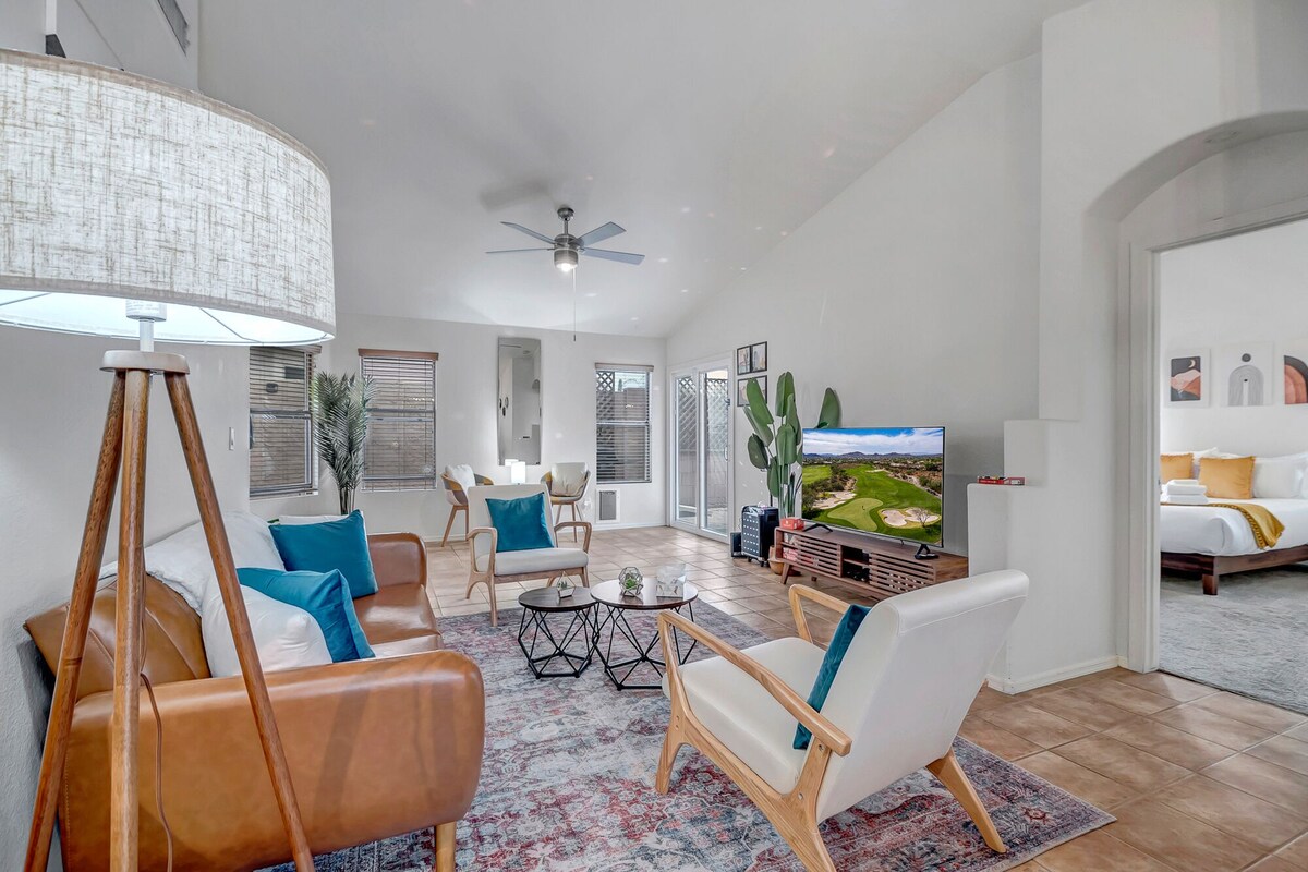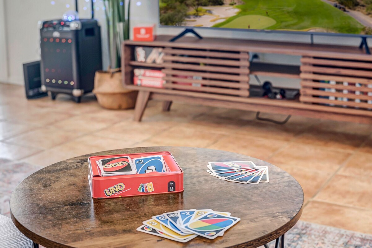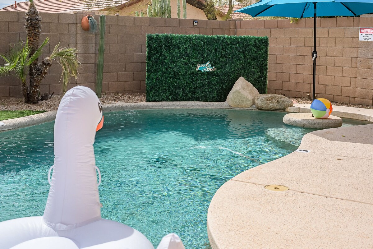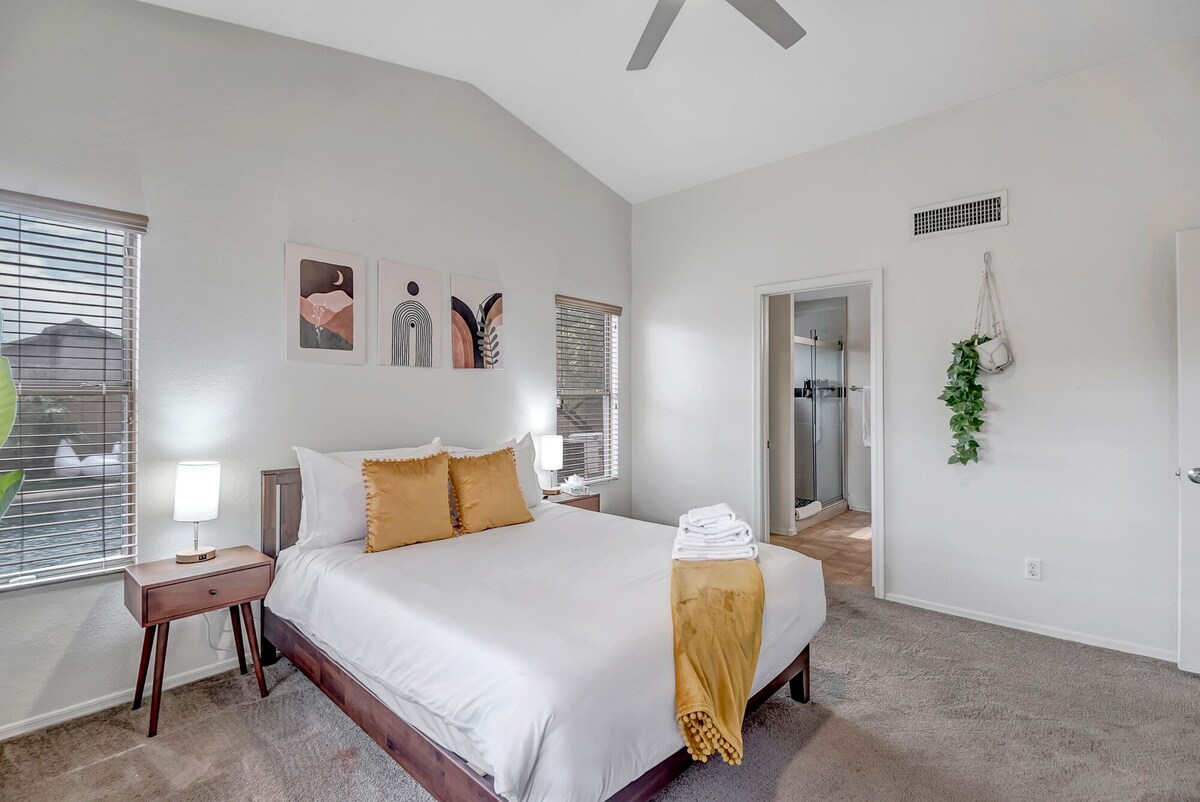 Desert View’s beautiful four-bedroom getaway is right here in Phoenix! Nestled just a short walk from the vibrant Desert Ridge Marketplace, this property offers the perfect blend of convenience and relaxation. As you step inside, you'll be greeted by a fully stocked kitchen, complete with a stove, oven, refrigerator, grill, and all the essential appliances you need to whip up delicious meals. Gather around the dining table and enjoy quality time with your loved ones, or step outside and fire up the grill for an alfresco feast. When it's time to unwind, you can take a refreshing dip in the outdoor pool, catch up on your favorite shows on the smart TV, or challenge your family to a game night with the selection of games and toys provided. And with the convenience of a washing machine and dryer, you can pack light and enjoy your vacation without the hassle of laundry. Just a short drive away, you'll find the Talking Stick Resort Casino and the upscale Kierland Commons, offering endless opportunities for entertainment, dining, and shopping. Whether you're seeking a relaxing getaway or an action-packed adventure, this vacation home has it all. Book your stay today and experience the best of Phoenix! Our prices include all fees. No hidden fees.