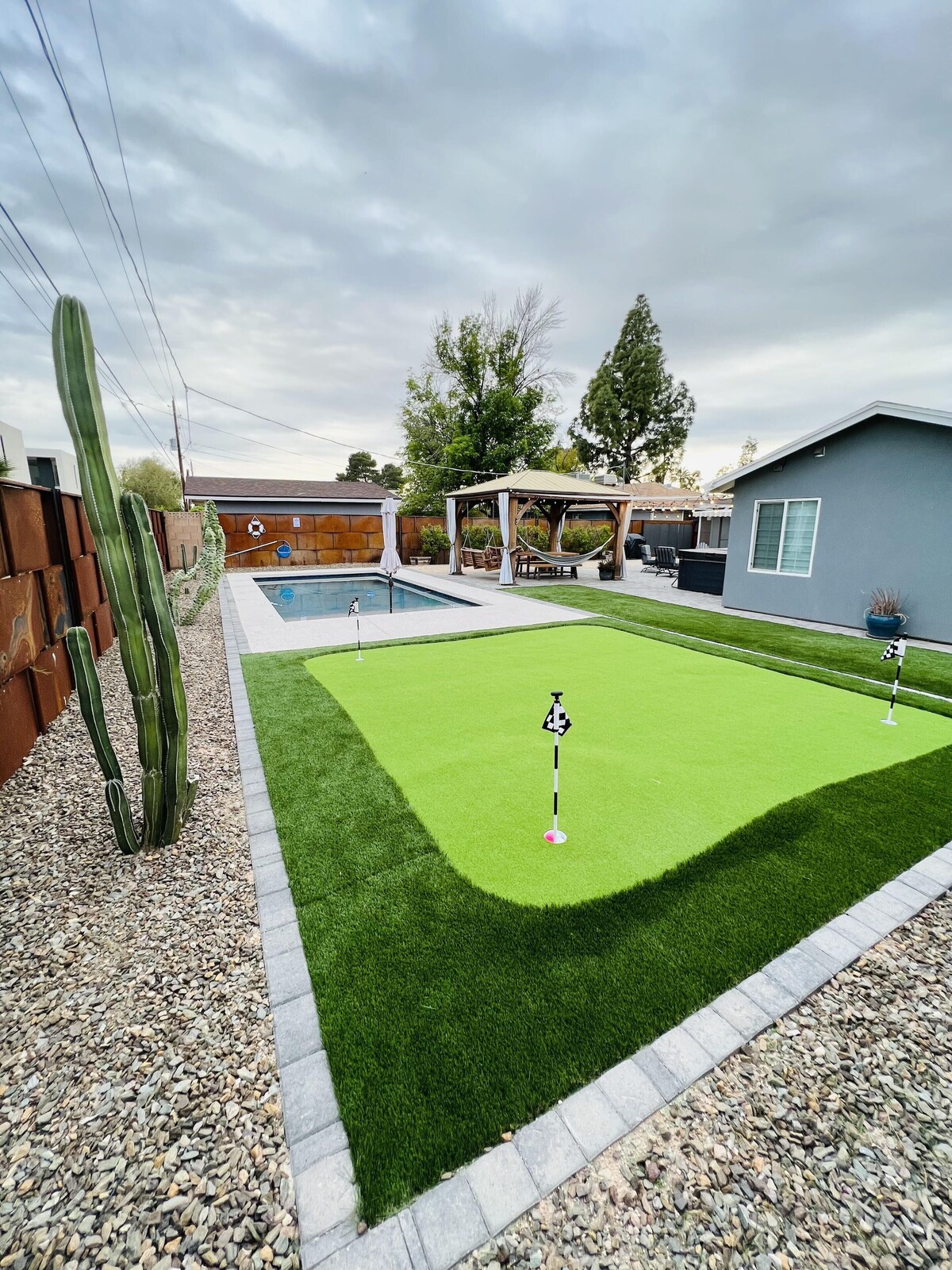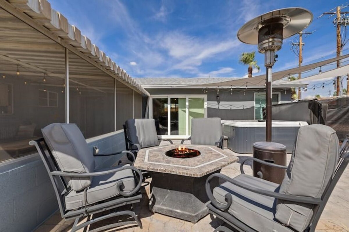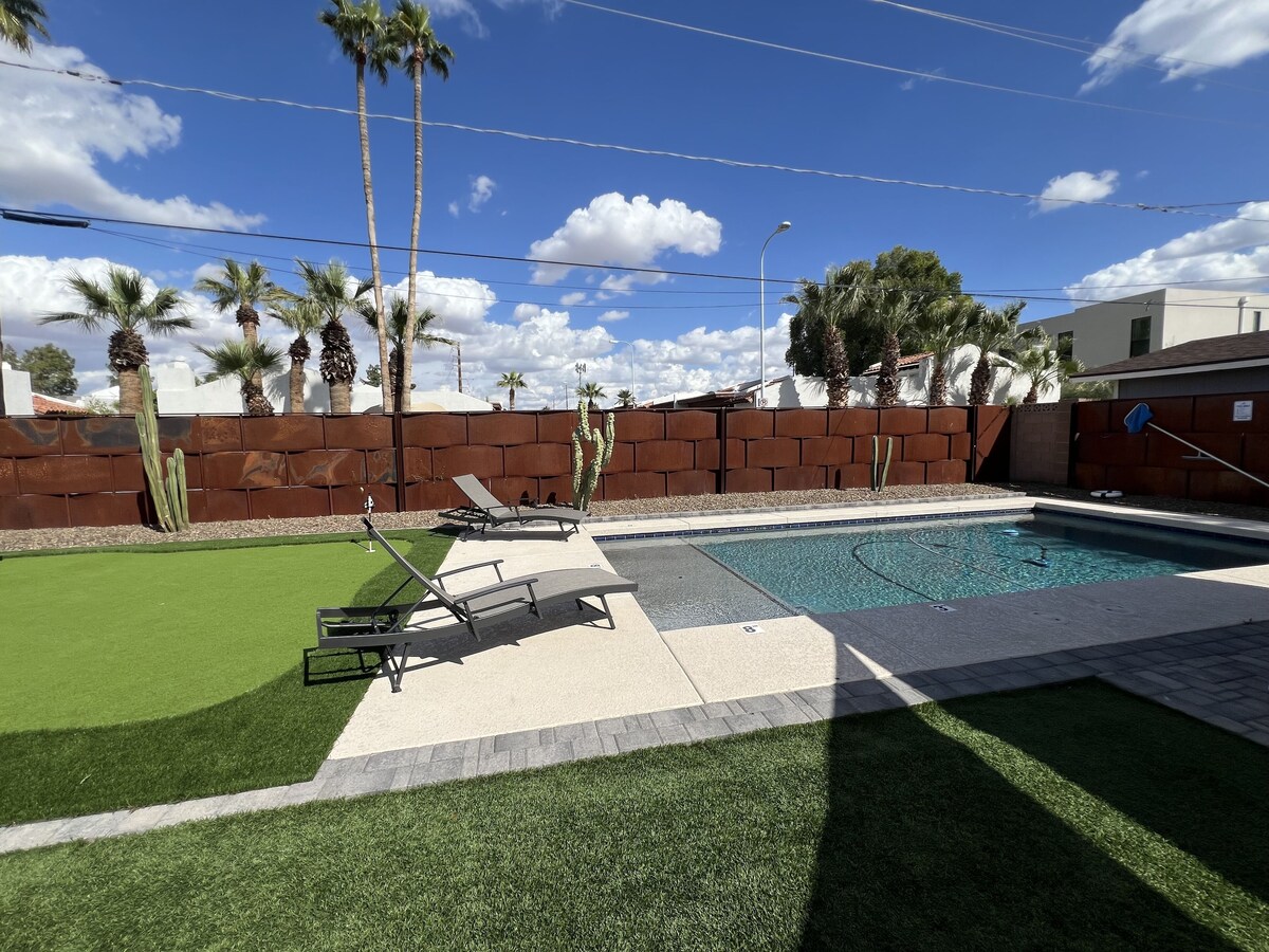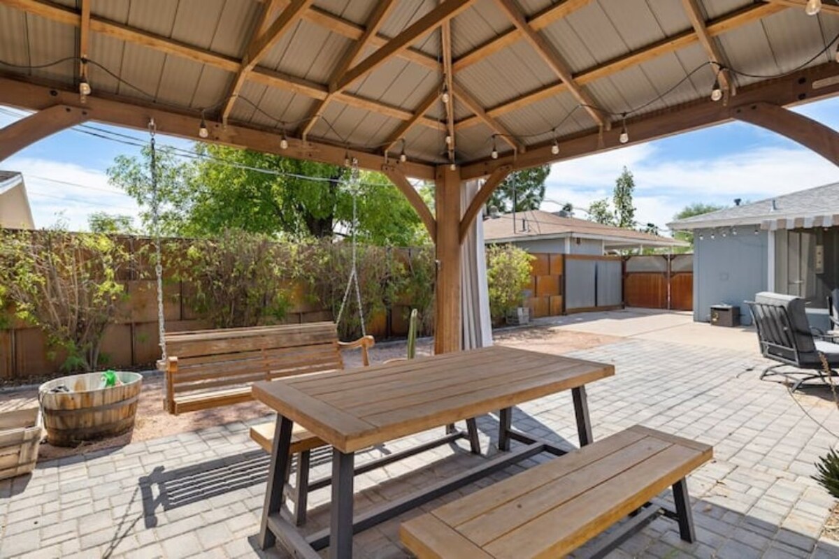 Enjoy a stylish 4-bedroom retreat centrally located just 9 minutes from Old Town Scottsdale & Camelback Mountain, 5 minutes to Arcadia/Biltmore restaurants & shopping, 7 minutes from Phoenix Skyharbor Airport. Custom backyard with screened-in Arizona room, putting green, pool (heating optional), hot tub, firepit, pergola & hammock. Spacious Master-suite with bathtub, dual rain walk-in shower, and electric fireplace. Outfitted with R/O drinking water system, barn door window shades throughout! The space The Arcadia retreat has been thoughtfully designed for those who truly appreciate the outdoor Arizona lifestyle. Inside you'll find a primary suite with luxurious primary bathroom king bed, high-end in-room fireplace and TV, 2 bedrooms with high end queen beds and 1 bedroom with two single beds (Note that this bedroom must be traversed in order to access the primary bedroom). For additional sleeping capacity there is also a queen sized pull-out sofa in the living room. The backyard is packed with comfy spaces to relax and enjoy the weather: -Sun room with outdoor sectional -4 person outdoor table -4-6 person heated spa -4 person table under a covered gazebo for the hotter days -putting green -pool with heating optional (please notify 1-week prior to reservation if you would like the pool to be heated at $30/day) Additionally, you're located in the heart of Arcadia which offers convenient access to all of your favorite Phoenix Neighborhoods: -5 minutes to Arcadia/Biltmore restaurants & shopping -7 minutes from Phoenix Skyharbor Airport -9 minutes from Old Town Scottsdale & Camelback Mountain -15 minute drive to downtown Phoenix -15 minute drive to the Tempe Riverwalk and business district Guest access Guests will be able to check in with a smart keypad for the door. Our prices include all fees. No hidden fees.