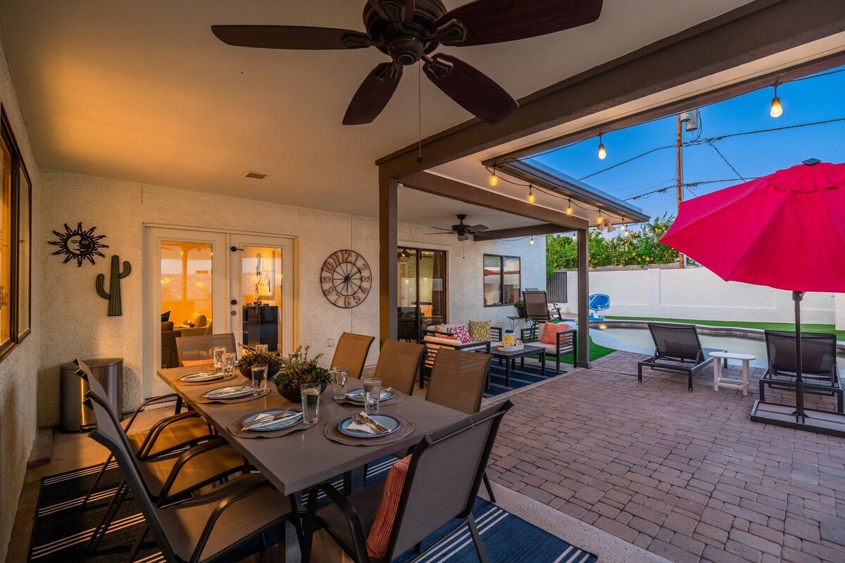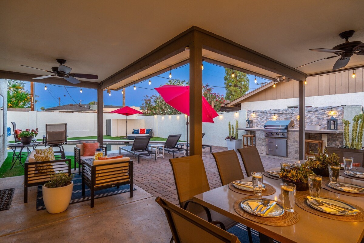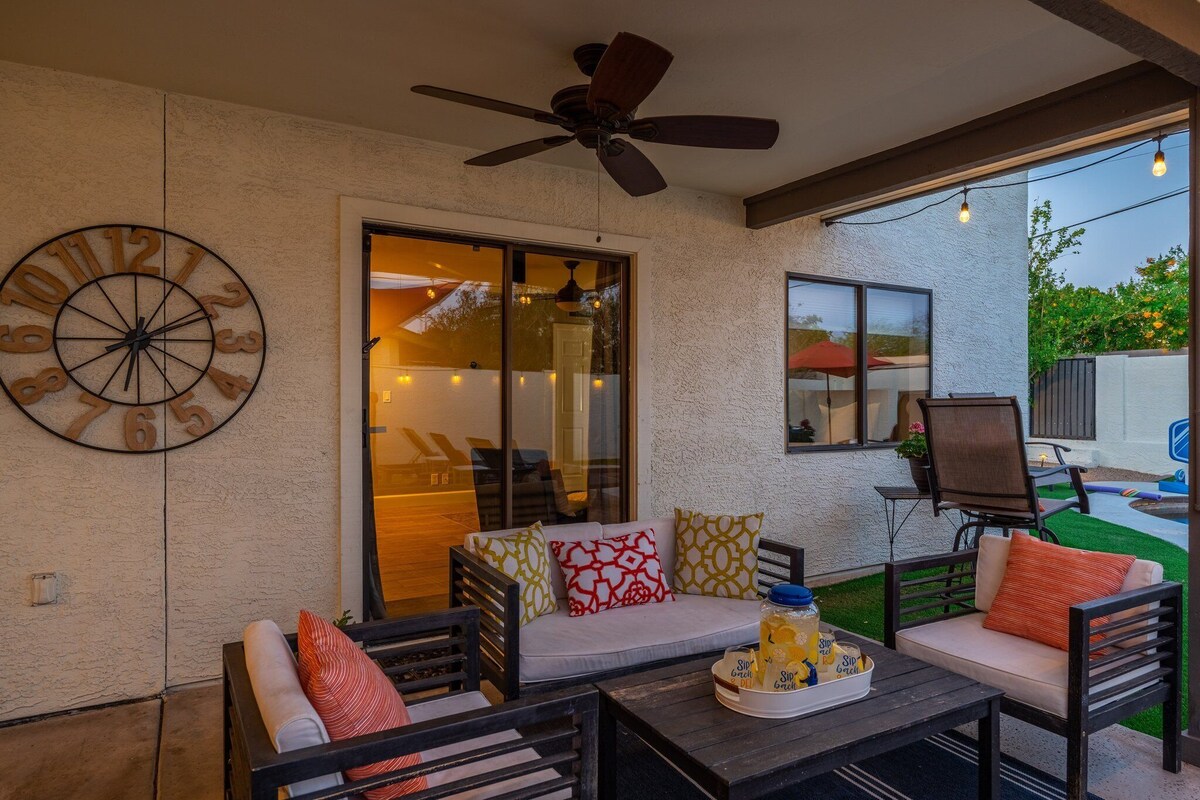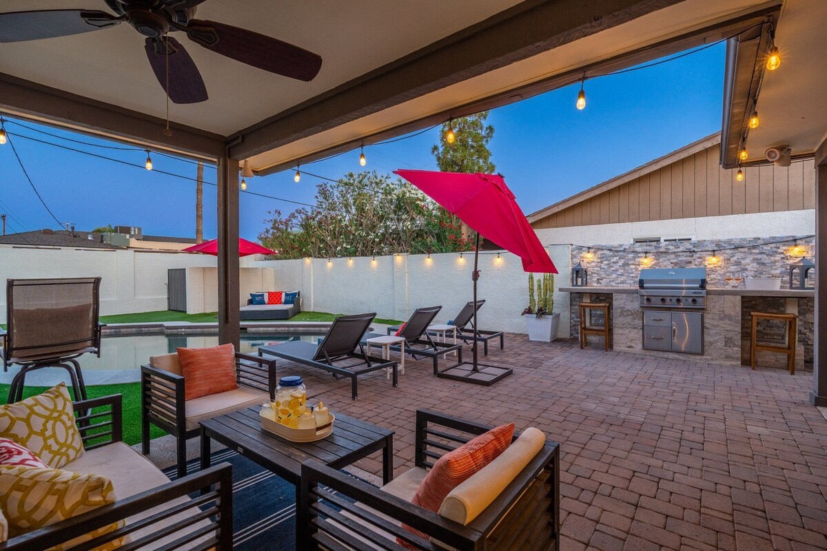 This Arcadia treasure promises you all your looking for when visiting Arizona! Spacious 5 bedroom (2 master suites!) 3.5 bathroom homes has a full chef's kitchen, fine finishes, a private pool (that can be heated for an additional fee), and plenty of out door space for everyone to enjoy! Be sure to pack your swimsuits, shopping shoes, and best outfit! It is located just minutes from Old Town Scottsdale's Entertainers District, Fashion Square Mall and much more! (Inquire about special events) The space Inviting modern home with all the comforts and MORE!! Guest access Guests will have access to entire home, garage, front and back yards, pool, and 3 patios - all to themselves! Other things to note Please enjoy the home without disturbing our friends and neighbors. We charge an additional $75 pet fee per dog. There is a strict 2 dog maximum. Our prices include all fees. No hidden fees.