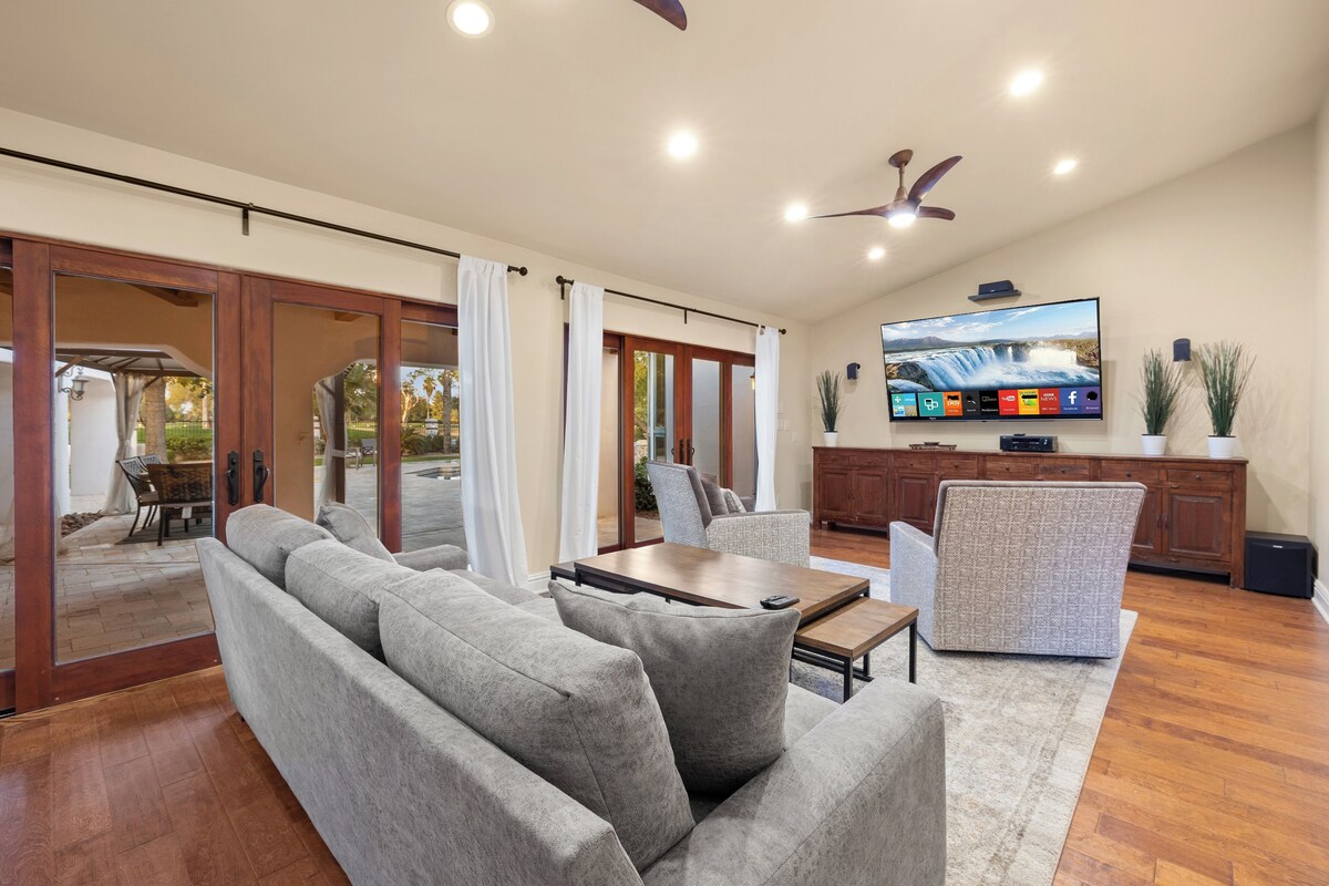 This resort-style home is located in the world-famous city of Phoenix and is perfect for all your vacation needs. It’s where style and sophistication meet entertainment and fun. Treat yourself to the perfect vacation rental at the Orange Tree Golf Club. The 19th Hole is a stunning 6-bedroom, private pool and spa offering 6,990 square feet of luxury living. Featuring two separate living rooms, you will experience the perfect area for entertaining. Enjoy the putting green or sauna and impress your friends with your hidden talent in a game of pool in the attached casita or take in a roaring fire while creating new memories of your vacation. Outdoor: While the kids take a dip in the pool or play in the tree house, grill up some lunch on the built-in barbeque featuring additional side burners, a minifridge, and a sink. Dine al fresco at the table for four under an umbrella or at the shaded dining table with seating for six. Get some practice at the 3-hole putting green before booking your tee time with your friends at the golf course. Put the kids down for bed and enjoy a nice soak in the heated spa or grab a cocktail for some sparkling conversation under the cabana with seating for five or in front of the natural gas fireplace. Don't forget to get your lemons for your cocktails from the large lemon tree onsite. Traveling across the country in your RV? We have you covered with a full-sized RV garage. Indoor: This vacation home opens to a grand living room with a gourmet kitchen. There is plenty of room in both living rooms. The primary living room features seating for eight in front of the natural gas fireplace in comfort with a switch-controlled ceiling fan, and the secondary living room with seating for three in front of another natural gas fireplace with a switch-controlled ceiling fan. The formal dining room features a dining table with seating for eight and a bar, which includes a sink and mini fridge. The fully-equipped kitchen features stunning stainless steel appliances such as a Sub-Zero french door refrigerator with an ice dispenser. In addition, the kitchen has a walk-in pantry and breakfast nook with seating for five at the round table. It offers everything one needs to create a perfect meal, including marble countertops. Catch a movie in the dedicated theatre room with seating for five and an 86-inch Samsung Smart television. No spices, condiments, or oils are provided. Bedroom Descriptions: Master Suite 1 is located through the dining room next to the secondary living room, which features a King-sized Bed, 55-inch Sony Smart television, remote-controlled ceiling fan, and two walk-in closets with access to the back patio and a laptop-ready workstation. Relax and read a book in front of the natural gas fireplace in one of the two armchairs. The private en suite bathroom features a jacuzzi tub, tile shower, double vanity sinks and a private sauna. Casita Suite 2 is next to the pool table room and features a King-sized Bed, a 55-inch Sony Smart television, two remote-controlled ceiling fans, and a walk-in closet with access to the back patio. The private en suite bathroom features a tile shower and double vanity sinks. Bedroom 3 is next to the casita kitchen and features a Queen-sized Bed, remote-controlled ceiling fan, and reach-in closet. The pool table room in the casita is centrally located between the casita kitchen and both bedrooms and accessible from the main house. The casita kitchen features stainless steel appliances and a breakfast nook with seating for four. In addition, it has a separate entrance from the front of the house and additional clothes washer and dryer. Bedroom 4 is next to hallway bathroom 3 and features two Twin-sized Beds, 42-inch Vizio Smart television, a remote-controlled ceiling fan, and a reach-in closet. Bedroom 5 is next to Bedroom 3 and features a Queen-sized Bed, 42-inch Vizio Smart television, remote-controlled ceiling fan, and reach-in closet. Bedroom 6 is next to the secondary living room and features two Twin Over Twin Bunk Beds and a remote-controlled ceiling fan. Hallway bathroom 3 is just outside the casita pool room and features a combination shower, bathtub, and vanity sink. Powder room 4 is next to the secondary living which features a vanity sink. Bedroom Sleeping Arrangements: Master Suite 1: 1 King-sized Bed - Sleeping 2. Casita Suite 2: 1 King-sized Bed - Sleeping 2. Bedroom 3: 1 Queen-sized Bed - Sleeping 2. Bedroom 4: 2 Twin-sized Beds - Sleeping 2. Bedroom 5: 1 Queen-sized Bed - Sleeping 2. Bedroom 6: 2 Twin-sized over Twin-sized Bunk Beds - Sleeping 4. Bed and Sleeping Summary: 2 Kings, 2 Queens, 2 Twin Over Twin Bunk Beds, 2 Twins. Sleeps 14. Other Amenities: WiFi Wireless Internet. Each bathroom has high-quality linens, bath and pool towels, and a starter set of L'Occitane shampoo, conditioner, soaps, and toilet paper. The kitchen includes a starter set of paper towels, dish soap, individually wrapped sponges and dishwasher pods. Fully equipped laundry room with washer, dryer, iron, ironing board, and laundry pods. This property also includes eight parking spaces, including 4 in the garage, 1 RV in the garage, 4 in the driveway, and no street parking. We are committed to Rent Responsibly standards. This means we follow best-in-class guidelines to ensure you have a peaceful, safe and memorable stay with us. We use smart home technology to improve your experience. This Property has a security doorbell camera located on the front door. This video footage is not shared and is recorded for liability reasons in the cases of a break-in, death, injury, guests disregarding the maximum occupancy allowed, and in no way infringing upon the guests’ expectations of privacy in these public areas of the property. This property cannot be used for purposes identified in the City of Phoenix Ordinance Section 10-195(c). The City of Phoenix short-term registration number for this property is 2023-3158. State TPT License TPT-21460849 Our prices 