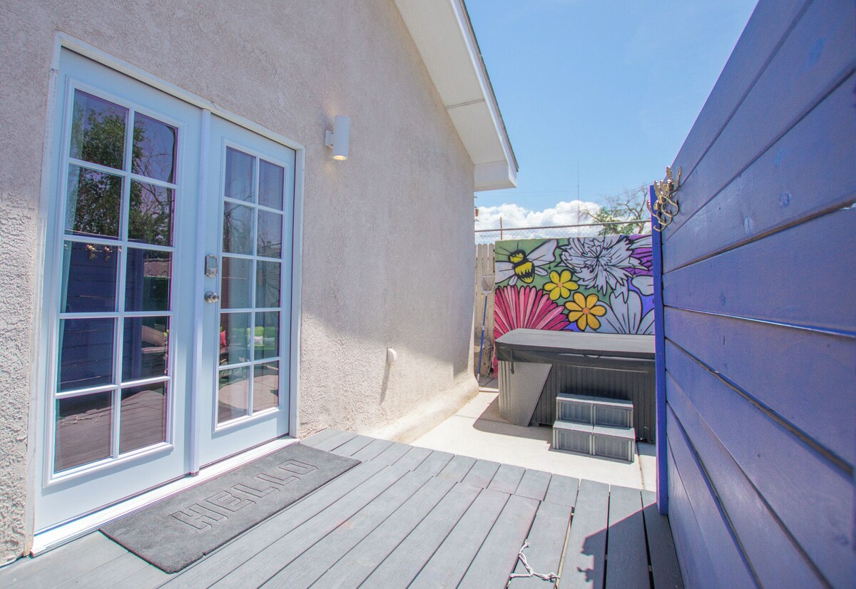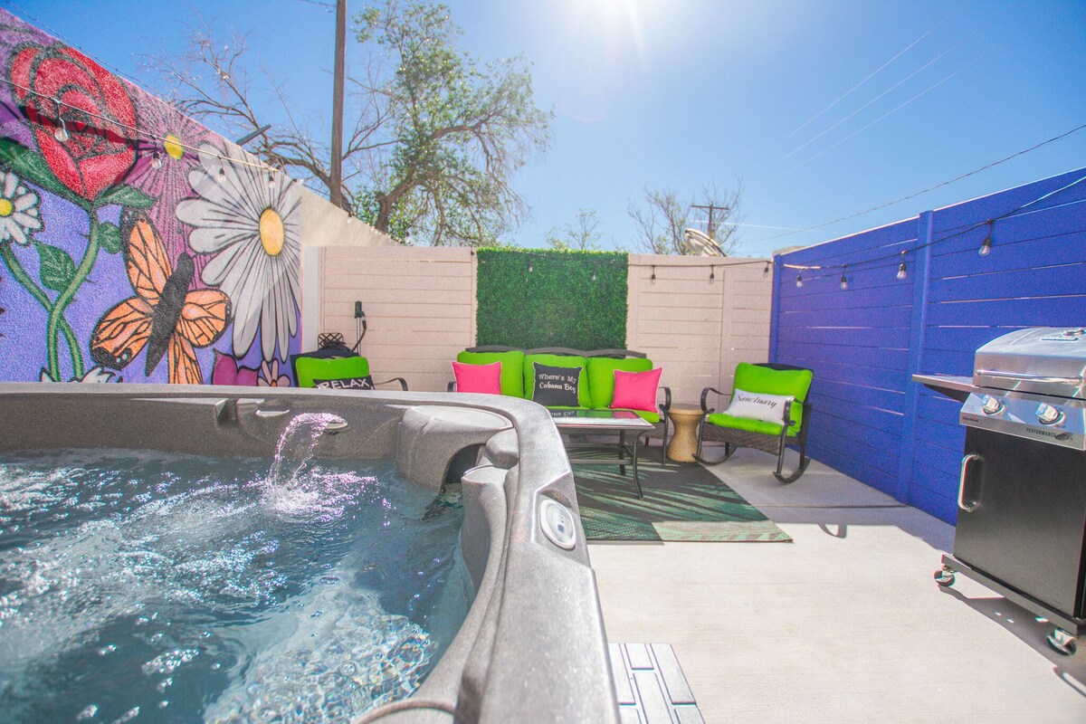 Welcome to our enchanting Bohemian oasis in the heart of Albuquerque, New Mexico! Nestled to the east of downtown, our charming 2-bedroom, 2-bathroom house is a true gem that beckons to the free spirits and wanderers seeking a unique and unforgettable stay. Once inside our Bohemian haven, you'll be instantly captivated by the eclectic blend of colors, patterns and textures that define the space and walls adorned with stylish art. The vibrant and cozy living room invites you to sink in and relax. Both bedrooms are a feast for the eyes, with Bohemian tapestries, richly colored bedding, and a sense of worldly charm. The master bedroom boasts a private en-suite bathroom, while the second bedroom is equally enchanting. One of the highlights of our Vrbo is a private outdoor space with a relaxing hot tub, perfect for unwinding after a day of exploring the city. The outdoor seating area is an ideal spot for sipping your morning coffee or enjoying evening cocktails under the New Mexico sky. Our prices include all fees. No hidden fees.