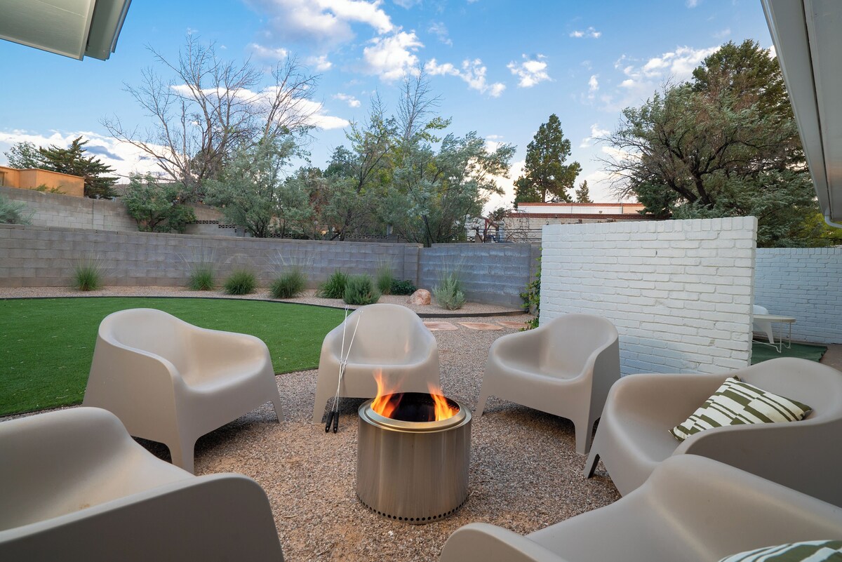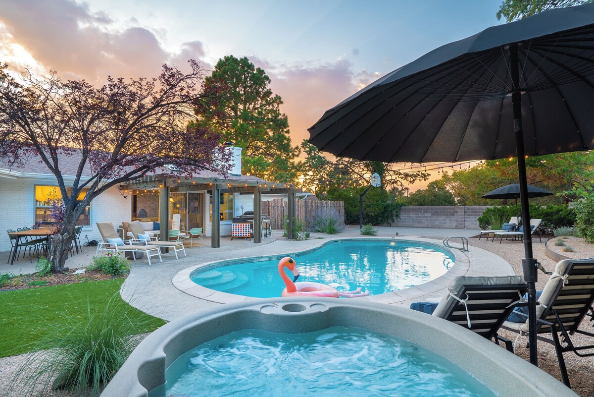 With a heated pool, hot tub, fire pit, outdoor dining & living room, and a half-court BB, this is an ideal retreat for families and groups wanting a luxurious stay. Our property includes 5 bedrooms, with 9 beds to sleep 14 guests. Two king size beds in master suits, one suite is the primary with an en suite bathroom. Another bedroom with two queen beds, a bunk room with two bunk beds and toys for kids, but a sophisticated design to make adults comfortable. And a 5th bedroom with a queen bed. All mattresses are Helix hybrid mattresses, and all bedrooms include ceiling fans with remotes. We also include and fully stocked kitchen suitable for a chef with induction range, secondary fridge in the garage, ice maker, air fryer, blender, hand mixer and assortment of baking tools. Lastly we also have two washer/dryer combos. Located just 10 minutes from downtown Albuquerque, 5 minutes from the Sandia Mountains, 15 minutes from the airport, and nearby superb hiking and biking trails, our location combines convenience and scenic beauty. Book now for an unforgettable experience in the prestigious Four Hills area! Our prices include all fees. No hidden fees.