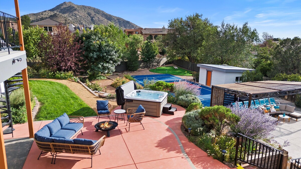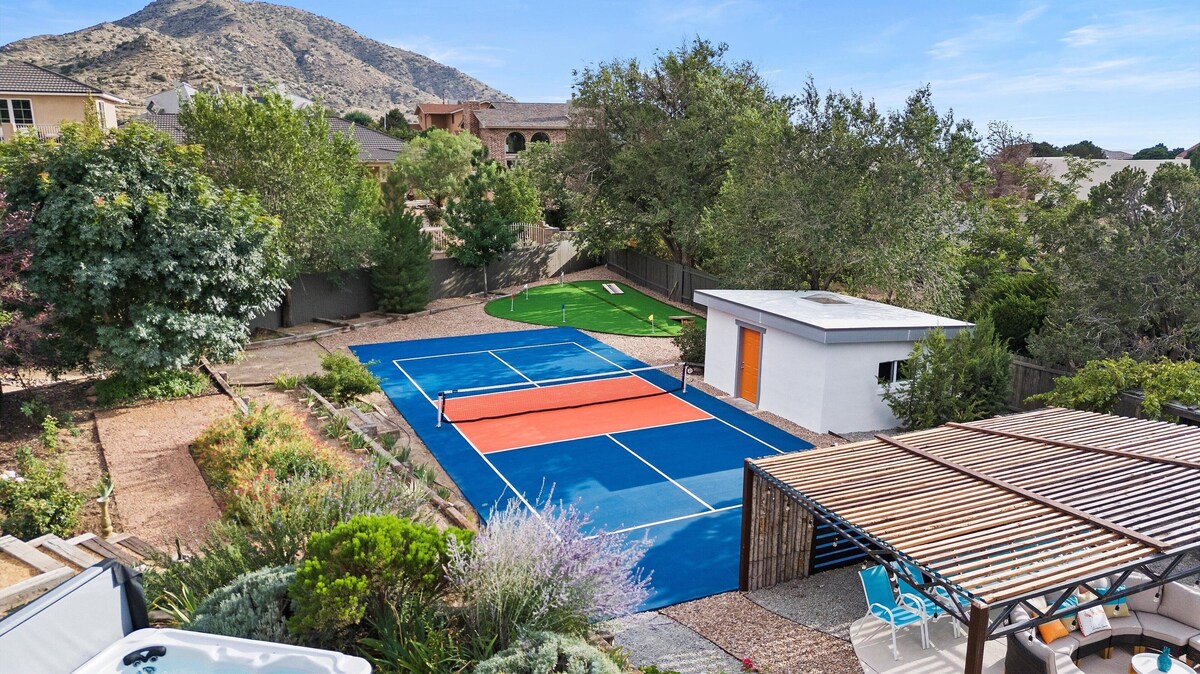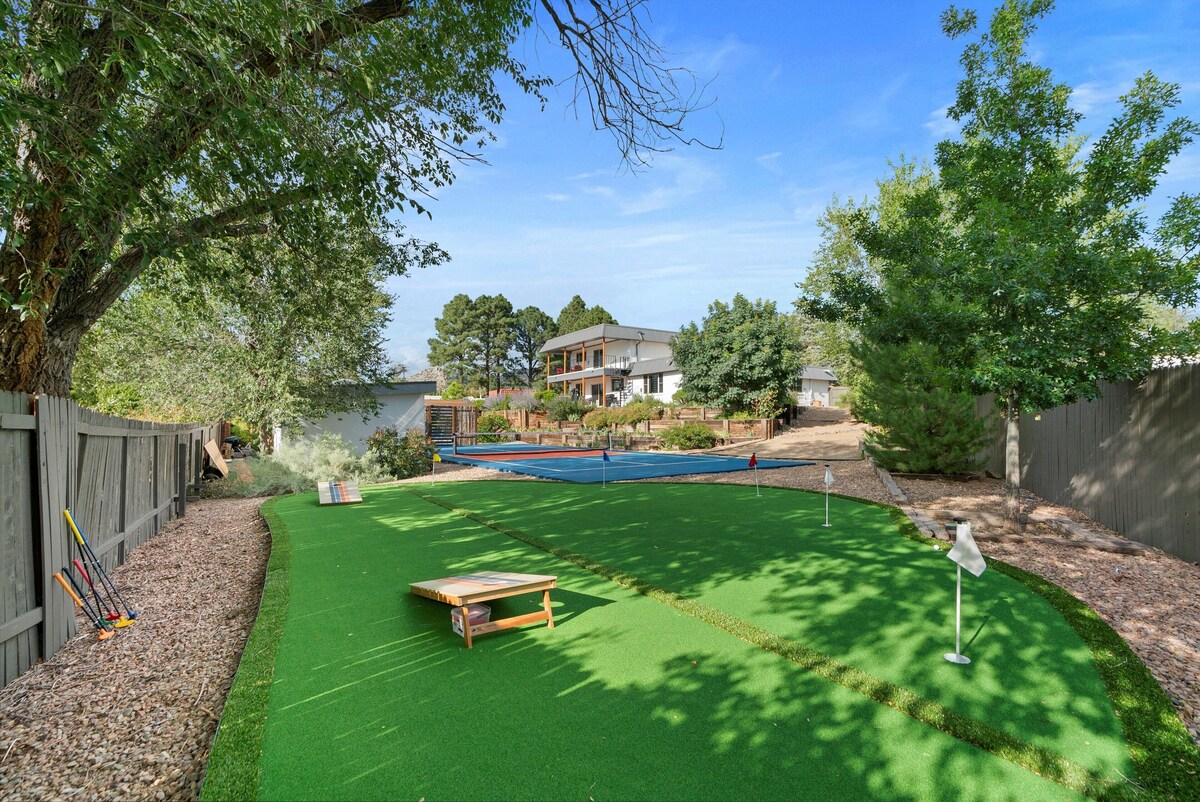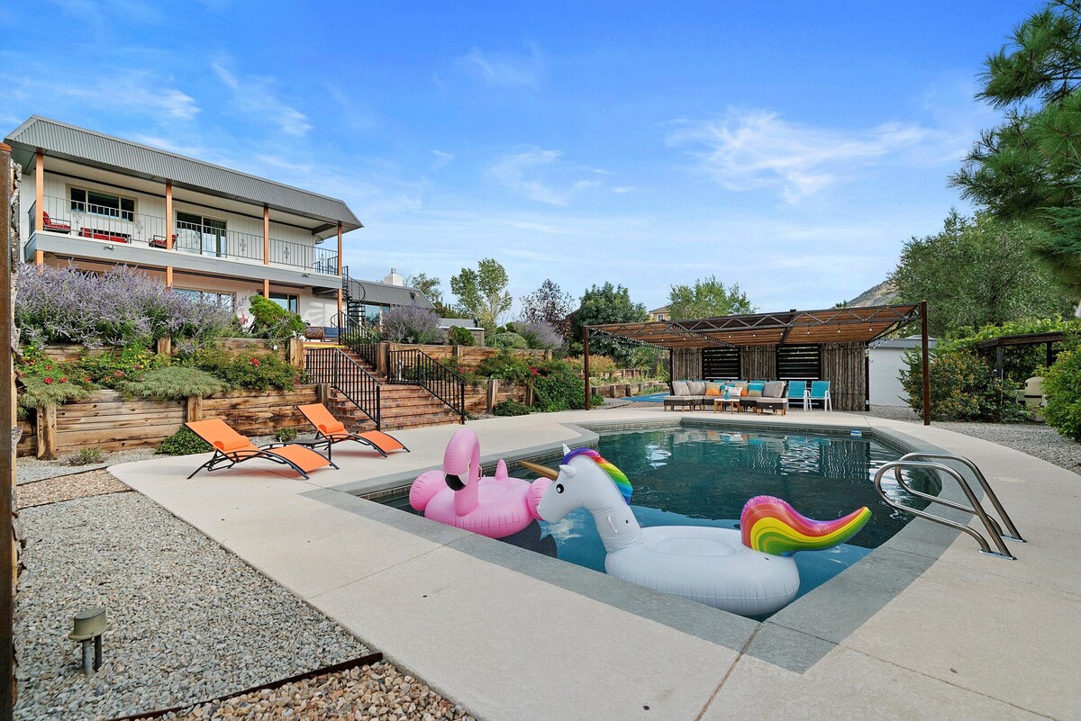 Welcome to High Desert Oasis, where Mid-century modern luxury meets natural serenity. With Five bedrooms and three bathrooms, ample space and comfort await you and your guests. Experience the ultimate outdoor getaway at High Desert Oasis, where every amenity is designed with you in mind. Amenities include: *Pool *Hot tub *Pickleball court *Gym *Putting green *Game room *Fire pit Please note that bedroom 4 is the only bedroom upstairs, and has a twin XL foldaway bed in the closet if needed. Please note the garage is not available for use. The pool can be heated for a fee of $50 per day, and it must be heated the entire stay. The pool is open from April 1 - Nov 1. Our prices include all fees. No hidden fees.