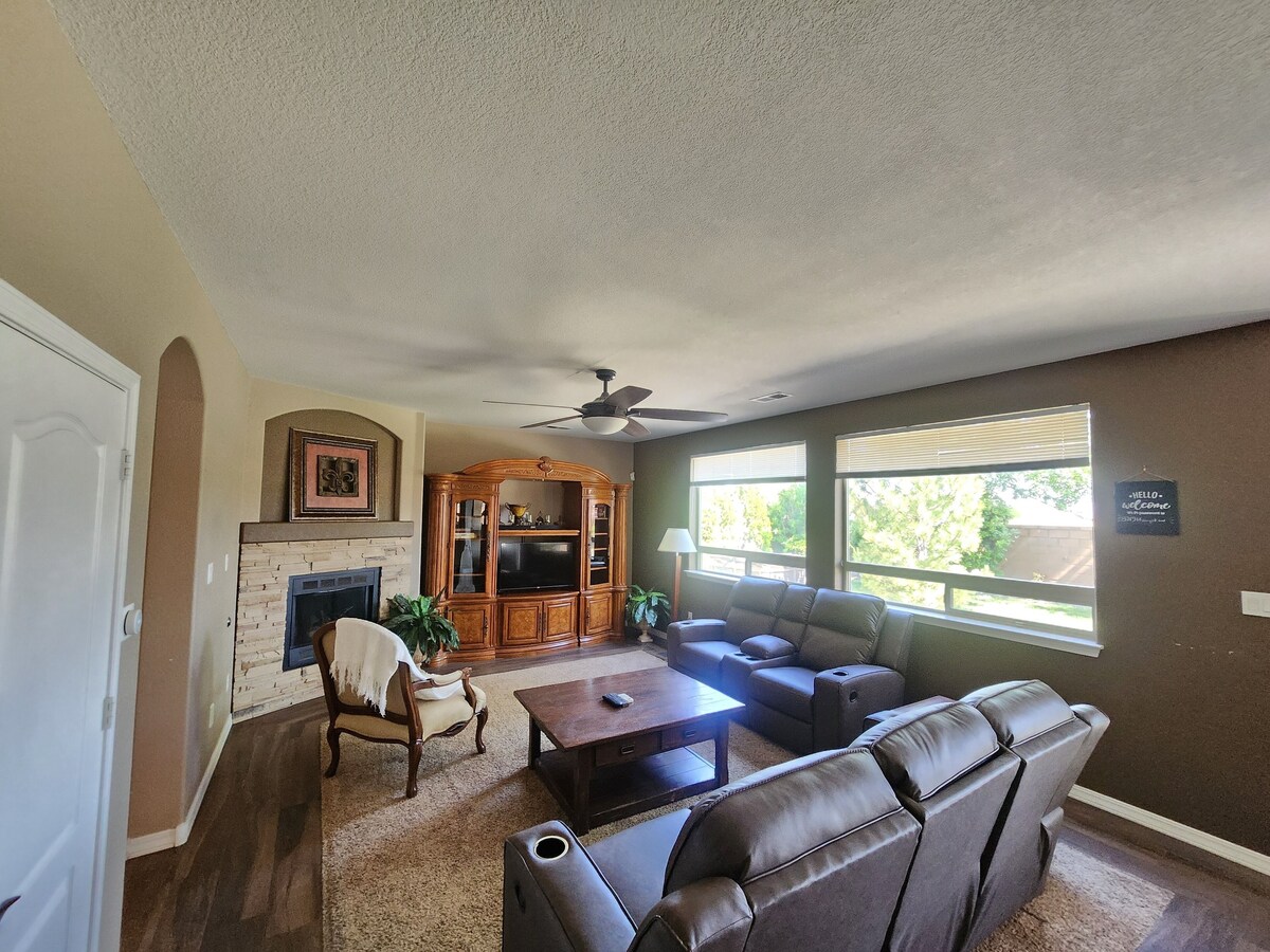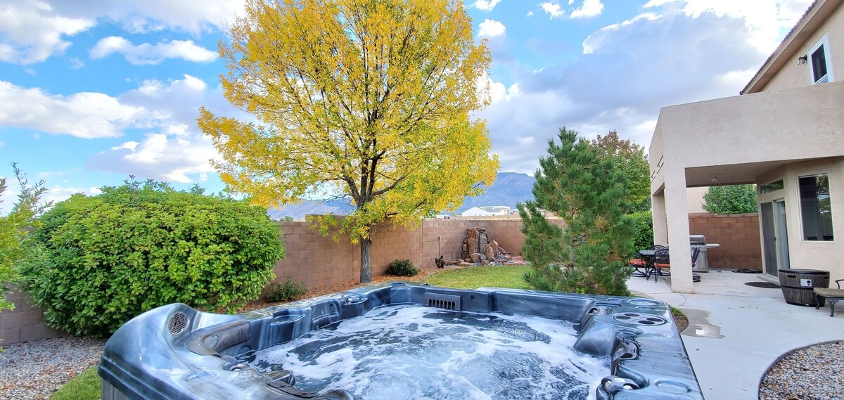 What a great home in a highly sought after area of Paseo Del Norte. Great New Home with Granite Counters, Wood tile Floors, Custom Cabinets, Fresh Paint, New Carpet and Wonderful Landscaping. Home Features an Open Floor Plan with plenty of Seating. 4 Bedrooms with 3 Queen Beds a Full Futon Couch and a Primary Bedroom with a King bed. Back yard is fully landscaped with BBQ, Hottub, Water Fall Feature, Privacy and Mountain Views. 2 blocks from a great park, walk out to running trails, bike trails and sandia scenery. Trader Joes is .5 miles away and Balloon Fiesta Park is 2 miles away. Santa Fe is 40 Minutes away door to downtown :) **Military Discount available, email for details** **Because of local HOA special rules and time of stay apply please email for details** Thank you. ***No Parties, or non-authorized gatherings are allowed. Anyone having a party or gathering is subject to immediate eviction without refund. Our prices include all fees. No hidden fees.