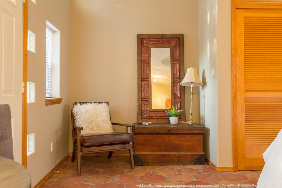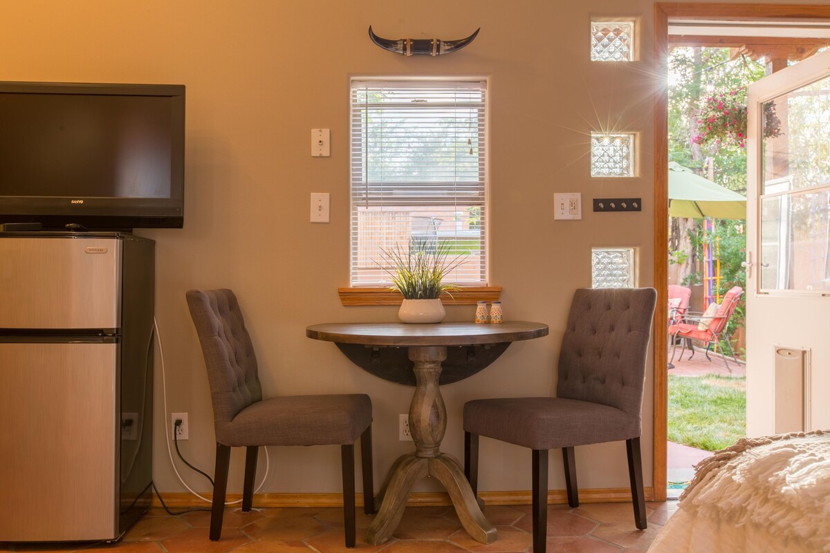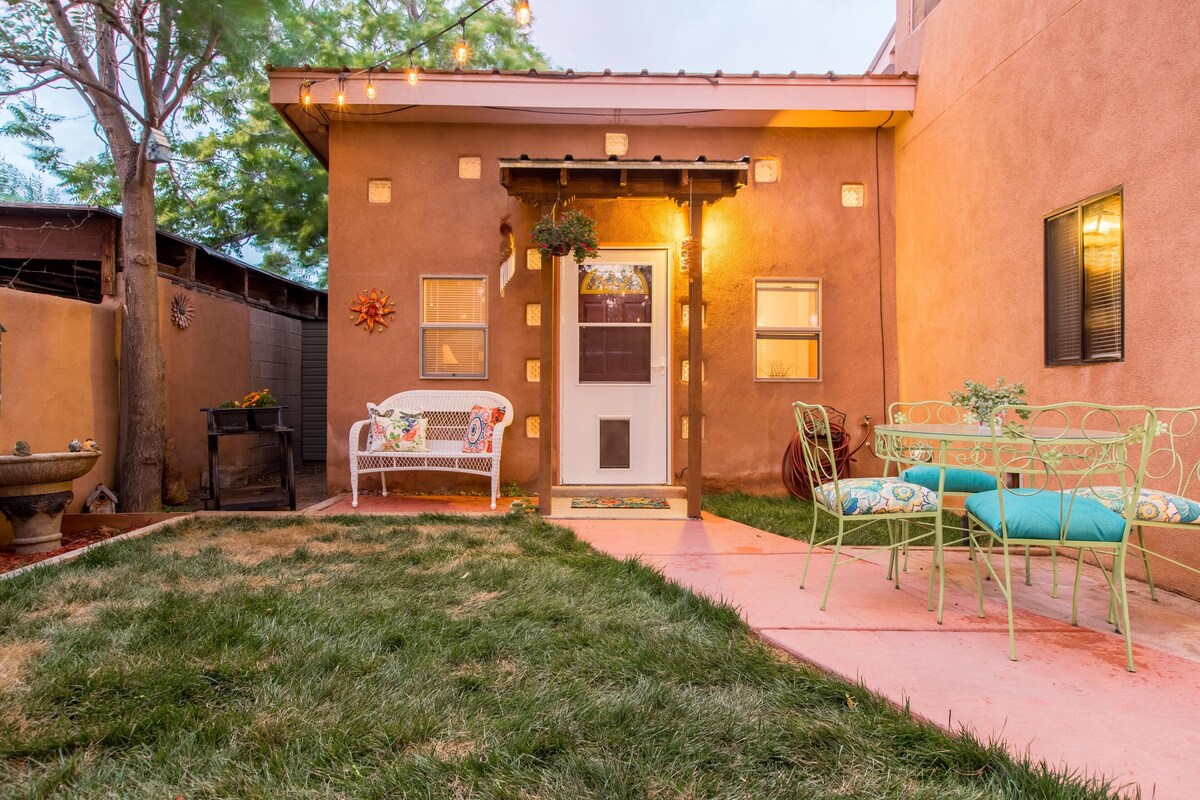 Charming Private Casita in the heart of Albuquerque's Historic Old Town, with all the charm and character you would expect in Old Town. Two minute walk to the central plaza galleries and shops. 20+ restaurants and cafes within a half mile, less than a 5 minute stroll to most. The following Albuquerque museums are all less than 400 yards away: Albuquerque Museum of Art, Museum of Natural History, and Explora Science Center (which is interactive and AMAZING for kiddos too)! The location of this comfy cozy romantic casita is perfect for any visit to Albuquerque, especially if you prefer not to drive everywhere. Enjoy evening/weekend events and concerts all year round, but especially summer, Balloon Fiesta, and Christmas. Christmas in Old Town is an experience everyone should have at least once in their lives! Bike to the Zoo or the Rio Grande River Bosque Trail, where you can ride along the river without ever crossing traffic for 20+ miles. Your host Lily, who lives in the main house, will make you feel totally welcome and at home, but also give you privacy, as if you have your own little resort retreat, right in the middle of old town. This separate private Casita is a 400 sqft studio with a queen bed, cable tv and internet, kitchenette with microwave and fridge, and a private bathroom with a pristine, beautiful new shower. There is a cute yard and patio with string lights and firepit to enjoy our wonderful year round climate! Book it now! Our prices include all fees. No hidden fees.