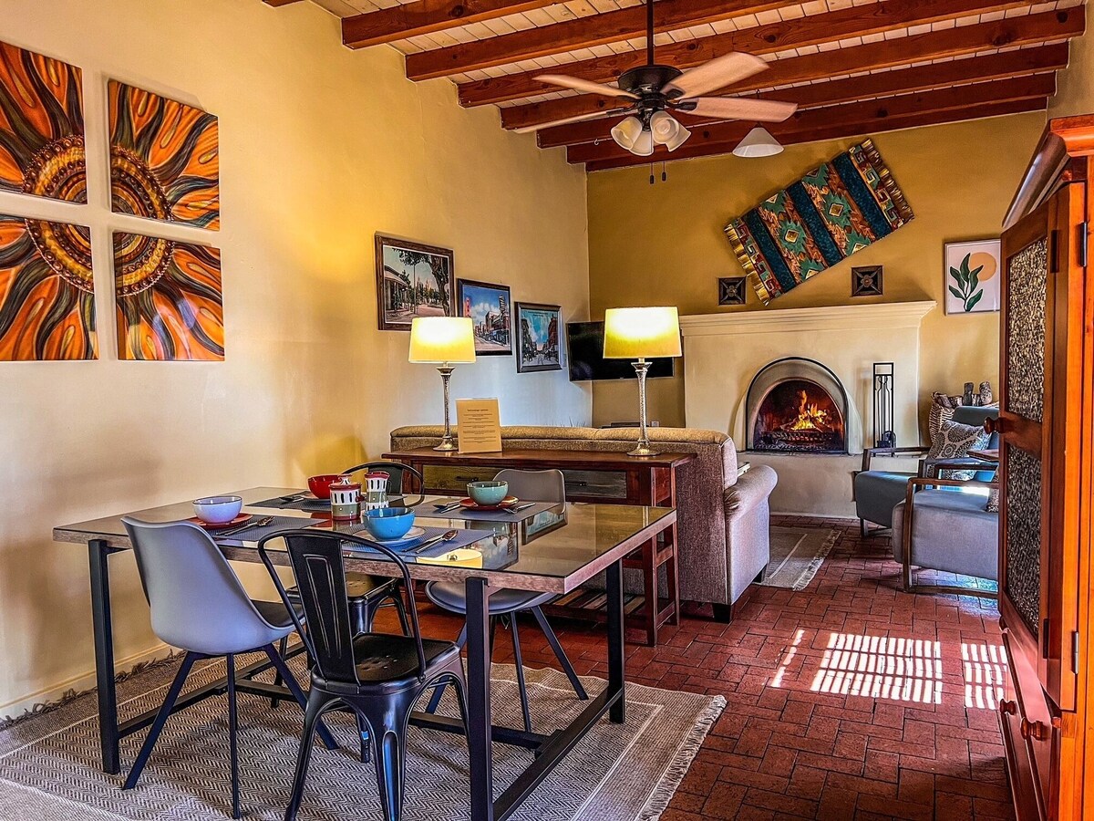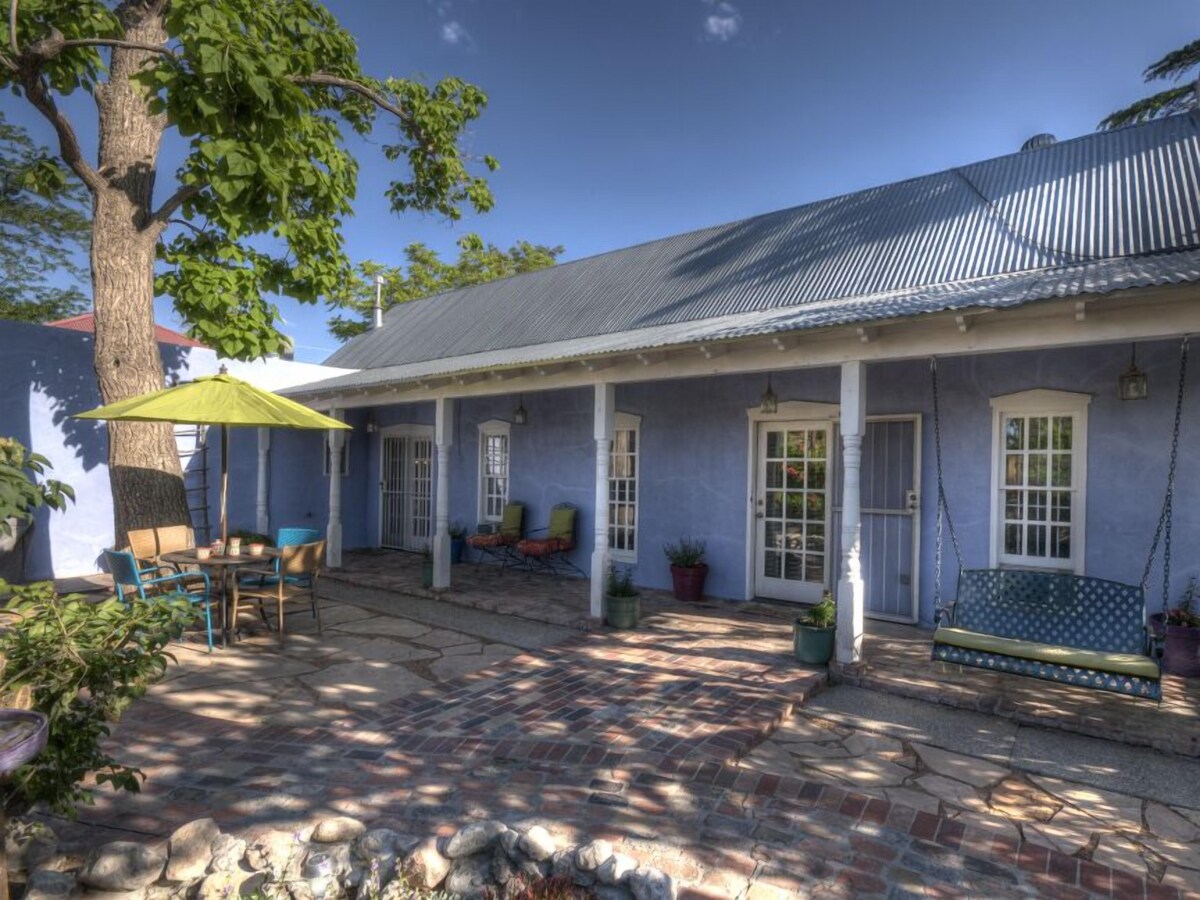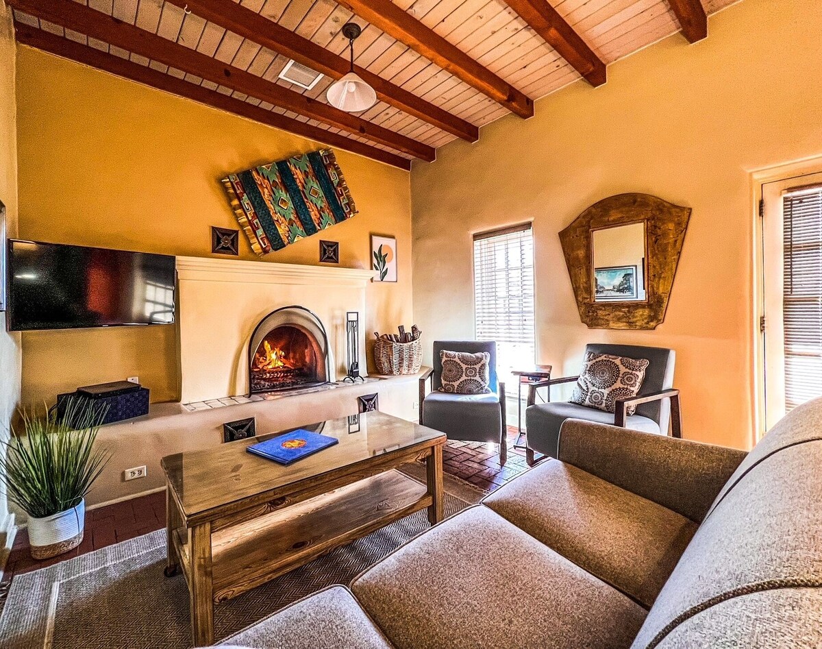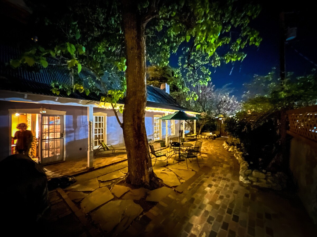 Casa Azul...Spend Your Vacation in Truly only Casita steps from Historic Old Town Plaza. Exquisitely appointed Northern New Mexico style Casita located in the heart of Old Town just steps away from the historic plaza. “CASA AZUL” is the perfect get away with over the top ammenities. An inviting private courtyard with mature trees and gardens awaits you. The spacious great room is graced with an inviting adobe fireplace, red brick flooring and a wood beamed ceiling. The kitchen decor features granite counter tops, authentic retro appliances, a washer/dryer unit and handcrafted Route 66 dining table. The bedroom suite includes a premium mattress draped with plush down comforter, custom duvet and cotton-rich linens. The bathroom is decorated in a warm pumpkin spice and accented with traditional Mexican tiles. It contains a full-sized tub and vanity. All rooms are tastefully decorated with contemporary southwest furnishings, art and accessories made by New Mexico artisans. Location: Albuquerque, New Mexico, USA (10 minutes from airport and within Old Town Historic Plaza and close to many attractions. Accommodations: Casita with full kitchen, bath, sleeper-sofa in great room and queen size bed. Sleeps 2 or 4 comfortably Amenities: High-speed Wireless internet Flat Screen TV Full sized tub and shower Microwave Coffeemaker Toaster Dinnerware Activities and Attractions: Old Town galleries, shops and 5-star restaurants located a few feet away Albuquerque and Natural History Museums with 1 block. Albuquerque Aquarium and Botanical Gardens less than 1 mile. Indian Pueblo Cultural Center 2 miles. Albuquerque Downtown and Convention Center 2 miles. Rio Grande Zoo 2 miles. Keywords: Casita Our prices include all fees. No hidden fees.