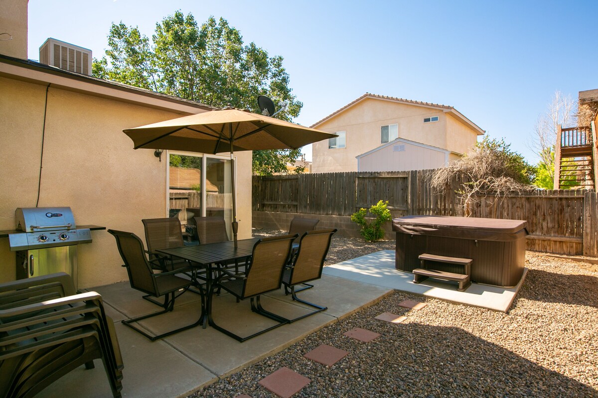 Northeast Heights home with a hot tub located in one of the safest neighborhoods in Albuquerque. Within a ten minute drive to some of the best Restaurants, Breweries, Entertainment, Hiking, Parks, and Grocery stores that Albuquerque has to offer! Twenty minute drive to Downtown attractions and the Airport. Tin Can Alley is walking distance from the home. (Restaurants, Breweries, climbing gym, Entertainment Venue) Starbucks, Flying Star coffee and desert shop, Trader Joe's, Kroger (Smith's), and Albertsons are all conveniently located within a 5-10 minute drive of the home. Don't forget to try the world-famous Dion's Pizza, Vintage Bar/Restaurant or La Reforma Distillery that are just a 5-minute drive. If you love to golf or gamble, Sandia Resort and Casino is a short 10-minute drive away. The city's best park, North Domingo Baca is within walking distance of the home. The park includes a large grassy area, play equipment, a dog park, tennis courts, handball courts, and a walking path. The majestic Sandia Mountains are just a 10 minute drive You can hike, bike, or take a ride on the world-famous Tramway. The home is also conveniently located next to I-25, making it easy to access the I-25 Movie Studios, Downtown, Balloon Fiesta Park, Sandia Casino, the Convention Center. This four bedroom 2.5 bath, 2 car garage home is located in a very established, safe, and quiet high-end neighborhood. Enter the living room and experience a smart TV and leather couches and plenty of seating for a large group. There is also a desk in the living room for any guests wishing to work from home. Fix dinner in the beautiful kitchen with beautiful modern and stylish cabinets, granite counter tops and all the supplies you would need to prepare a meal. Free \ coffee is provided for all guests. Relax in the downstairs primary suite that is equipped with a King sized Sleep Number bed with luxury linens for your enjoyment and comfort. Soak in the full bath in the master bedroom with a nice deep soaking tub for your enjoyment. This room has a smart TV. Extra guests can relax in the first upstairs bedroom that is equipped with a high quality queen sized bed. Luxury cozy linens are provided for your enjoyment and comfort. This room has a smart TV. More guests can relax in the third and fourth upstairs bedroom which are carbon copies of each other with one full and one twin sized bed. One of these bedrooms have a smart TV. All Bathrooms are equipped with Spa quality invigorating shampoo, conditioner, and body wash and soft and thick towels for your comfort. Gather on the patio that is equipped with shaded seating, a relaxing hot tub, and a BBQ grill to grill up your favorite meal. Don't miss the opportunity to stay in this beautiful home! Our prices include all fees. No hidden fees.
