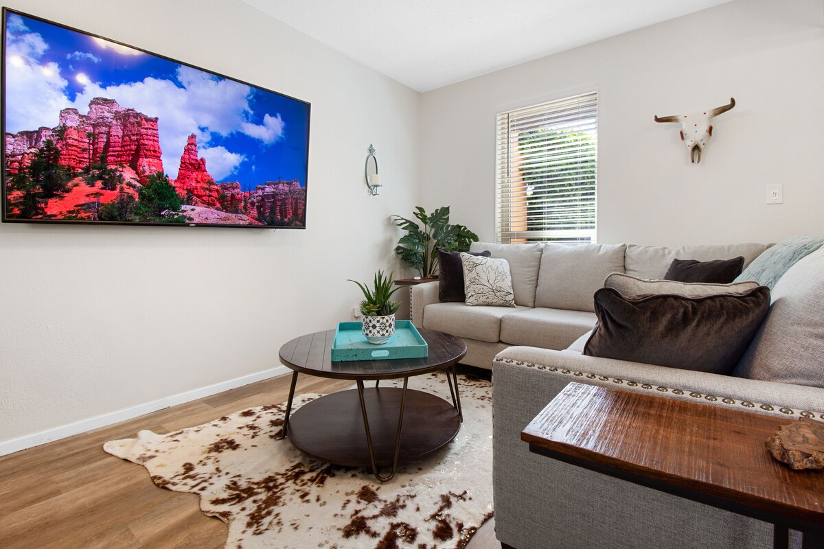 Summary: 2 Homes on 1 property. For large groups we can host up to 16 people. The 2 homes consist of The Plaza & El Altos properties. Each may be booked separately on their own listing, or your may book both together here. Every Room also gets its own large television with Netflix and an Amazon Echo for your personal digital Assistant. The pool is currently closed until further notice. The Space: The Space for The Plaza The Plaza was renovated with a modern theme in 2019 and offers great details and decor in every room. You will enjoy a great floorplan with kitchen, dining room, and living room adjoined. In the upstairs you will find 2 full baths and 3 bedrooms. Kitchen: Fully functional with oven, range, refrigerator, spices pots, pans, crook pot, & Microwave. It's stocked with the tools needed to make wonderful meals. Also, enjoy fresh Keurig Coffee every morning. Living room: Features a beautiful sitting area, highlighted with 70 inch Samsung Smart TV. Netflix, and Amazon Prime included. Couch is a sleeper sofa with a pull out Queen Bed. Primary Bedroom- Gorgeous barndoors leading to a beautiful king size bed with very comfortable mattress. Walk-in closet to store clothes and luggage. Ceiling fans to keep the room cool and fresh air moving through the room. Enjoy a connected master bathroom with shower, hair dryer, iron, and curling iron. 2nd bedroom: Queen size beds with comfortable mattresses overlooking 43 inch TVs. Ceiling fans to keep the room cool and fresh air moving through the room. Dresser to store clothes. Closet to store clothes an luggage. 3rd bedroom: Queen size beds with comfortable mattresses overlooking 43-inch TVs, Ceiling fans to keep the room cool and fresh air moving through the room. Dresser to store clothes. Closet to store clothes and luggage. Guest Bathroom: Bathtub shower combo. 3rd bathroom - located downstairs is a half bath. Garage: 2 Car garage. * Guests are welcome to use the designated parking spots at the end of the street, as well as the two parking spaces available in the garage. Please be advised not to park on the street and obstruct the traffic, as doing so may result in a fine from the HOA. Backyard: Enjoy a backyard with artificial grass that stays green year-round. Comfortable seating with patio furniture. The gate to that backyard is approximately 50 feet from the community pool. The Space for El Altos Spread across 2 levels, El Altos boasts 4 generous sized, tastefully decorated, luxurious bedrooms, each with a large TV. The spacious main living and dining area perfect for relaxing or entertaining. Comfort and warmth are delivered with attention to detail paramount. Tastefully decorated this ideal home away from home delivers THE KITCHEN The stylish galley kitchen has all the ingredients to make any occasion feel special. Its well-equipped, so all you need to do is bring your food! Plenty of bench space and storage, Full-size oven and electric cooktop, Full-size fridge, Full-size dishwasher, Keurig Coffee maker to enjoy fresh coffee every morning, Microwave. Comes completely stocked with all your cooking needs including a selection of pots, pans, toaster, serving dishes, cooking utensils and more. Included also are plates, cutlery, glasses, coffee cups and all the necessary essentials. Convenient breakfast nook with seating for 4 guests, with additional storage in the built-in buffet THE PRIMARY BEDROOM Elegantly decorated and generous in size featuring a luxurious King Bed and an occasional chair providing a perfect reading nook. Large 50-inch TV with Netflix – the ideal addition for escaping to your retreat. The airy and modern ensuite conveniently connects to the bedroom. Here you'll find all your bathroom necessities including towels, hairdryer, iron, curling iron, soap, shampoo, and conditioner. A large walk-in wardrobe with plenty of hangers allows you to unpack and enjoy the feeling of space and organization. Enjoy pool views from the bedroom window. Enjoy a connected master bathroom with shower, hair dryer, iron, and curling iron. SECOND BEDROOM Lavishly decorated featuring a luxurious memory foam King bed. Large walk-in wardrobe with ample storage space. Large smart TV for added indulgence. The guest bathroom, with all the necessities, conveniently located nearby. The dresser and nightstands offer additional storage. THIRD BEDROOM Luxury awaits with a comfortable Queen bed. Large Smart TV – perfect for a guest retreat. This bedroom does not have a wardrobe; however, a luggage rack is provided. FOURTH BEDROOM A convenient trundle bed provides two additional beds, perfect for extra guests or the kids. Large Smart TV makes this an ideal place for the kids to hang out. The dresser provides space for additional storage. Wardrobe with ample space to store clothes and luggage. Guest Bathroom: located upstairs is a bathtub shower combo. 3rd bathroom - located downstairs is a half bath. Guest Access: *Enjoy access to our entire home, as well as the community pool in summer months located roughly 30 yards from the backyard. The pool is currently closed until further notice. Each home has 2 storage closets in the garage that are for cleaning supplies for the cleaning team. * Guests are welcome to use the designated parking spots at the end of the street, as well as the two parking spaces available in the garage. Please be advised not to park on the street and obstruct the traffic, as doing so may result in a fine from the HOA. *Our home is pet-friendly, welcoming dogs only (up to 40 pounds each). We allow a maximum of 2 dogs per reservation, with a pet fee of $250 per pet. No other pet types are permitted. The Neighborhood: LOCATION In a much-loved location, nearby the neighborhood offers several grocery stores including Sprouts, Whole Foods, Smiths, and Walmart. There also are dozens of local restaurants that offer fantastic food at reasonable prices. Some of our favorite restaurants in the area include Casa Taco, Stripes Burritos & Biscui