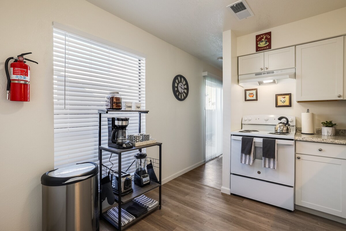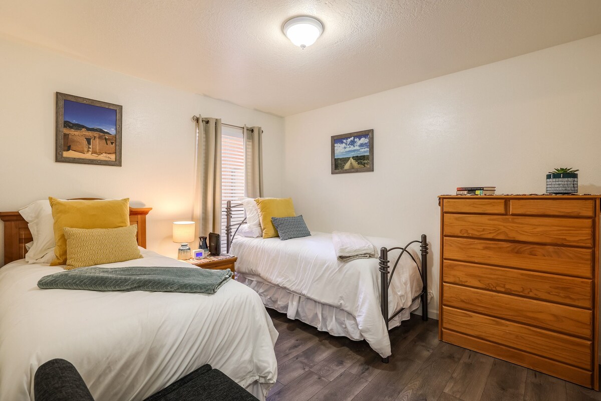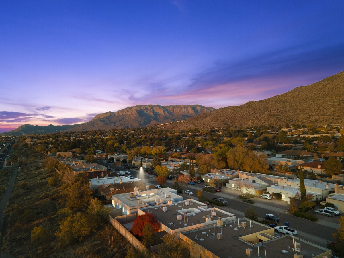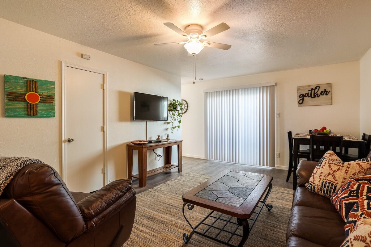 Enjoy this absolutely amazing two-bedroom, two bath apartment that is conveniently located right at the foothills of the Sandia Mountains. Walking distance from the best hiking, biking, running trails, brewery, and restaurants Albuquerque has to offer. If you love serenity, the outdoors and beautiful views, this apartment is perfect for you! This cozy apartment was thoughtfully updated and is perfect for the vacationing family, traveling retirees, Balloon Fiesta visitors, or professionals. The inviting living room has plenty of comfortable seating and a smart TV provided so you can watch any of your favorite streaming services. A blu-ray player with a library of over 100 Blu-Ray/DVD titles for adults and kids is also provided. A great selection of family board games is also available for your enjoyment. High speed internet is provided and will support work-from-home and multiple devices streaming at the same time. The beautifully updated kitchen is fully stocked with all the basic spices and everything you would need to fix an on-the-go meal or cook for your entire family. The coffee bar is always stocked with fresh ground high end Starbucks or New Mexico Piñon coffee for your enjoyment. The back patio is a serene place to enjoy an amazing view of the city and the most amazing and breathtaking sunsets that Albuquerque is known for. Lounge and table seating is provided along with your very own propane barbecue grill! Whether you wish to lounge with friends over cocktails, have coffee in the morning, or have dinner under the umbrella, the huge outdoor is the place to do just that. The luxurious master bedroom is equipped with a queen-sized high-end comfortable mattress, high quality bed linens, and comforters for a blissful nights sleep. A small reading library is provided along with a big screen TV equipped with a ROKU stick to stream all of your favorite subscriptions. More than enough closet space and luggage racks are provided for your convenience. The completely updated master bath has a shower and plenty of counter space. The cozy extra bedroom is equipped with two twin sized beds with high-end bedding and mattresses to provide a comfortable night's sleep. There is plenty of closet space in this room as well as a luggage rack provided for your convenience. The updated hall bathroom has a tub and a shower to soak all your worries away. This apartment was recently upgraded to ice cold Refrigerated Air Condition and Forced air heating. Most properties in Albuquerque are cooled by swamp coolers which can have troubles keeping spaces cool enough during high temps or high humidity. You can rest assured, you will be comfortable in our Apartment! The apartment is also equipped with an oversized washer, dryer and laundry soap for your convenience. The nearest Albertsons grocery store is located 1 mile from the house. Bridges on Tramway which contains Boxing Bear Brewery and Tako Ten eatery is a short 7 minute walk or from your front door. The best hiking, biking, running, and walking trails are all located out your front and back doors. The world-famous Sandia Peak Tramway is a short 10-minute drive from the apartment. Ride the tram to the top of Sandia Mountains to enjoy beautiful views of the city of Albuquerque below, access to Sandia Peak Ski Resort in the winter and mountain biking in the summer. Sandia Resort & Casino is only 15 minutes away, featuring an award-winning golf course open to the public, spa services, restaurants and concerts throughout the year. Take a quick drive via I-40 to historic Albuquerque Old Town where you can shop the Plaza for authentic hand-crafted turquoise and silver jewelry. Get your fill of red or green chile at many local New Mexican restaurants before heading over to the Albuquerque Museum of Art & History, New Mexico Museum of Natural History & Science, and Explora Science Museum for kids of all ages. You can also head north via I-25 for a short drive up to Santa Fe for a day trip. Or for a more leisurely and scenic drive up to Santa Fe, simply head south on Tramway Blvd. and around the Sandia Mountains to the Turquoise Trail. If you are visiting for the world-famous Albuquerque Balloon fiesta, the apartment is a short 15-minute drive from the front gate. Balloon pilots from all over the world to fly in this bucket list one-of-a-kind experience. Throughout the rest of the year, head to Balloon Fiesta Park to visit the Albuquerque International Balloon Museum to learn all about the \ . Don't miss the opportunity to stay in this amazing apartment! Our prices include all fees. No hidden fees.