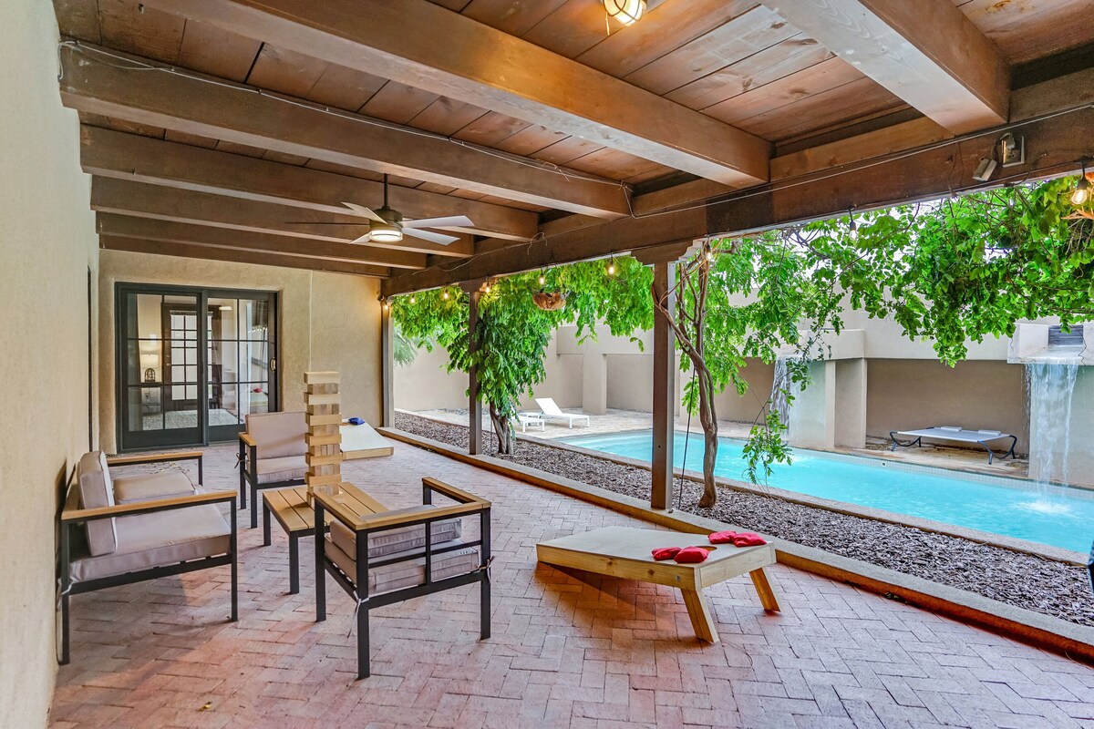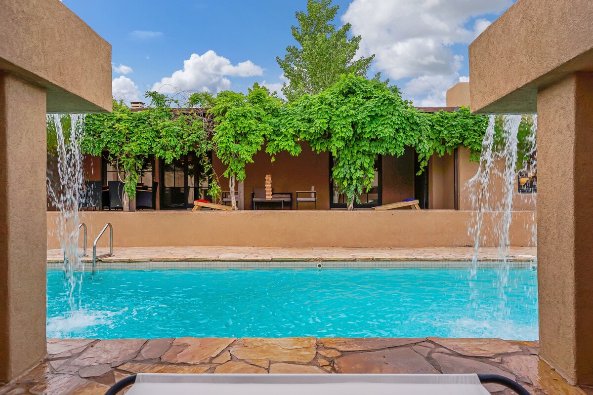 Welcome to Casa Cascada! This beautiful 6 bedroom, 6 bath, 4,200 sq. ft. home with 14 beds sleeps 21 comfortably, and leaves nothing to be desired. Enjoy the heated pool with cascading waterfalls, the pool house's ping-pong table, or cornhole on the back patio. The spacious home is nestled in the foothills of Albuquerque, just minutes from downtown with easy access to I-40. Casa Cascada is the perfect stay for those looking to enjoy a tastefully designed, New Mexican style home with friends and family. The adobe home has red brick floors, high wood beam ceilings, and Mexican style countertops throughout. Unique New Mexican details are found throughout each room of the house. *4,300 sq. ft. *6 bedrooms, 14 beds, sleeps 21+ *Heated pool with cascading waterfall features *Pool house with futon, ping pong table, and HDTV *Fast 300 Mbps WiFi *Smart HDTV's with Netflix, Disney+, Hulu, ESPN *Open-air interior courtyard *Kava fireplace *Dining room seating as well as kitchen seating *Linens, towels, shampoo, conditioner, body wash, and hand soap provided Bedroom 1 - The Sage Room - Urban daybed with trundle - Sleeps two Bedroom 2 - The Indigo Room - Two twin over twin bunk beds - Sleeps four Bedroom 3 - The Sun Room - Queen over queen bunk bed - Sleeps four Bedroom 4 - The Terracotta Room - Two full beds - Sleeps four - Open-air courtyard patio Bedroom 5 - The Prickly Pear Room - One king bed - Sleeps two Bedroom 6 - The Lavender Room - One king bed - Sleeps two - Private patio Living Room - Pull-out sectional sofa - Sleeps two Pool House - Pull-out futon - Sleeps one *Please note that the pool is closed from November - March. Pool can be heated for an additional $75 per day. COVID-19 NOTE: We look forward to having you at Casa Cascada. Please take comfort in knowing that the house is thoroughly cleaned and disinfected before and after each stay. If you have any questions or concerns regarding our sanitation process, please message me. Our prices include all fees. No hidden fees.