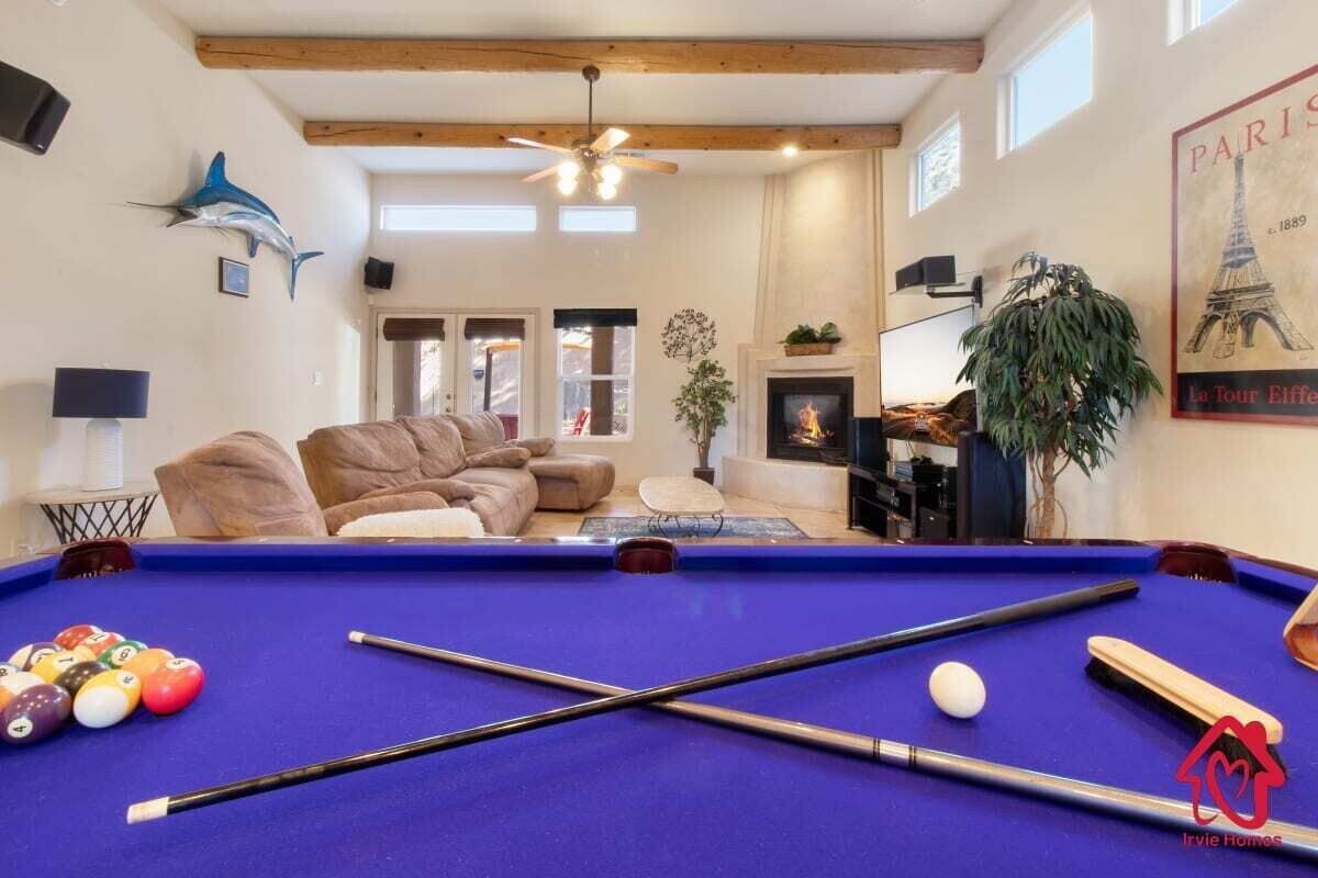 Summary: Architecturally impressive with a distinct southwestern vibe, this immaculate 3-bedroom home embraces the elements of traditional Pueblo style with a contemporary fusion. Nestled within the Desert Ridge Trails community, this beautiful retreat is conveniently located just one mile from the I-25 freeway and less than 2 miles from Balloon Fiesta Park. Every October, the Albuquerque skies are transformed by over 500 vibrant balloons, and The House of Desert Hills offers a front-row experience to this breathtaking spectacle. Featuring a luxurious hot tub, this home is perfect for relaxing under the starry desert skies! The Space: Highly sought after, this one-of-a-kind home is based in one of Albuquerque's most attractive and convenient locations. Set over 2 levels, Desert Hills, adorned with character, radiates class, comfort, and convenience. This family home caters for 8 guests, with 3 bathrooms, large open plan living, dining and kitchen area incorporating a billiard table, a designated office, a dream gourmet kitchen, plus a private, fully fenced yard with a grill and 2 cozy fire pits included. You may never want to leave! Located upstairs are 2 guest bedrooms, a full bathroom and a home office space set in the spacious loft area with bunkbeds. Exposed timber beams and a welcoming gas fireplace in the main living room exude warmth and comfort. The heart of the home is the beautifully appointed kitchen. Ideally located within the open plan living area, this space is ideal for gathering, preparing, and sharing family meals. The main living area is perfect for relaxing movie nights by the fire or enjoying endless hours of fun playing pool. Privacy is assured with the primary bedroom and ensuite located downstairs. The fully fenced backyard is ideal for outdoor dining, relaxing or entertaining with outdoor seating, a grill, plus a natural fire pit and a gas fire pit to enjoy during the chilly New Mexico nights. Tastefully decorated, the living area is spacious and delivers: - Lounges perfect for relaxing - Direct access to the backyard - High-speed Wi-Fi - Large Smart TV - Billiard Table for endless hours of fun plus plenty of family games including Jenga, dominos, checkers, chess, Taboo, and others - Gas fireplace - Central heating and air conditioning KITCHEN AND DINING AREA The stylish gourmet kitchen is truly a home cook’s delight. Beautifully appointed with granite benchtops and quality stainless appliances, it's well-equipped with everything you need. Just bring your food, and you'll be set! - Granite benchtops and a large breakfast bench with added seating - Dining table with seating for 6 - Full-size oven and gas cooktop - Full-size fridge with filtered water and icemaker - Microwave - Nespresso coffee maker - Toaster - Air fryer - Stand up rotisserie - Rice cooker - Crock pot - Waffle iron - Comes completely stocked with all your cooking needs, including a selection of pots, pans, toaster, blender, serving dishes, cooking utensils, spices and more - Included also are plates, cutlery, glasses, coffee cups and all the essentials. PRIMARY BEDROOM (Lower Level) - Comfortable California King Bed - Direct access to the backyard - Smart TV - Sitting area - Ensuite conveniently connects to the bedroom with double vanity, a separate walk-in shower, plus a bathtub. Included are all your bathroom necessities - towels, hairdryer, soap, shampoo, and conditioner. - Large walk-in closet - Ceiling fan SECOND BEDROOM (Upper Level) - Comfortable Queen bed - TV with local broadcast channels - Built-in wardrobe with ample storage space - A desk and chair convenient for study or work - Ceiling fan - The guest bathroom, with double vanity. THIRD BEDROOM (Upper Level) - Comfortable full-size bed - Smart TV - Built-in wardrobe with ample storage space - A lounge for relaxation - Ceiling fan - The guest bathroom, with double vanity. LOFT OFFICE - A large desk and chair are provided within the workspace - Comfortable bunk bed can sleep 2 - The Loft area does not have a door to close. BACKYARD The backyard is a private oasis designed for relaxation and enjoyment. It features a spacious patio perfect for outdoor dining and lounging, along with an open-air gazebo equipped with a cozy firepit surrounded by four comfortable sitting chairs—a perfect spot for intimate gatherings or stargazing. An additional in-ground firepit with two rustic stone benches provides another charming option for enjoying cool desert evenings. To top it all off, immerse yourself in the soothing waters of the hot tub, making this backyard a retreat you'll never want to leave. Guest Access: *Guests have access to the entire property except for 1 garage bay that is walled off, and 2 closets in the house which are locked. *To elevate your comfort and enjoyment, we offer the exclusive add-on features: Hot Tub Heating fee for $100 per stay. Our hot tub heating option ensures a perfect water temperature for an unforgettable relaxing experience. *Our home is pet-friendly, welcoming dogs only (up to 40 pounds each). We allow a maximum of 2 dogs per reservation, with a pet fee of $250 per pet. No more than 2 pets and no other pet types are permitted. The Neighborhood: Nestled in NE Albuquerque's Desert Ridge Trails community, this area boasts top-notch hiking, with 100+ trails like La Luz and Crest Trail in Cibola National Forest. Just a mile from the 125 freeway, you're 20 minutes from most of Albuquerque. The house is under 2 miles from the famous Balloon Fiesta, where 500+ balloons color the skies every October. Year-round, Balloon Fiesta Park hosts various events, and it's all close by. Enjoy mountain biking, hiking, Sandia Peak Tramway (13 minutes away), skiing (November to April), plus dining, shops, and cultural spots nearby. The Sandia Peak Tramway and Ski Area offer year-round fun, just 13 minutes away, allowing quick access to skiing within 30 minutes. Balloon Fiesta Park, only 8 minutes away, is situated north of the city.