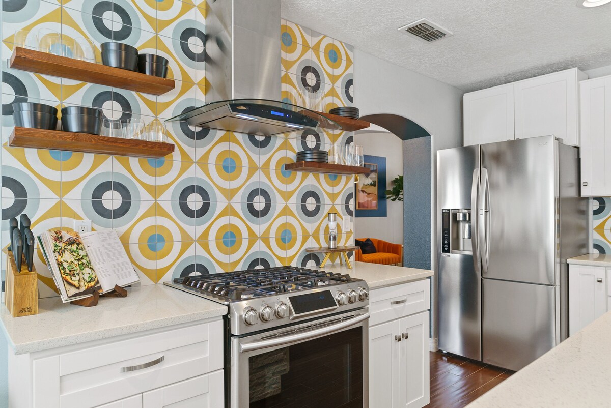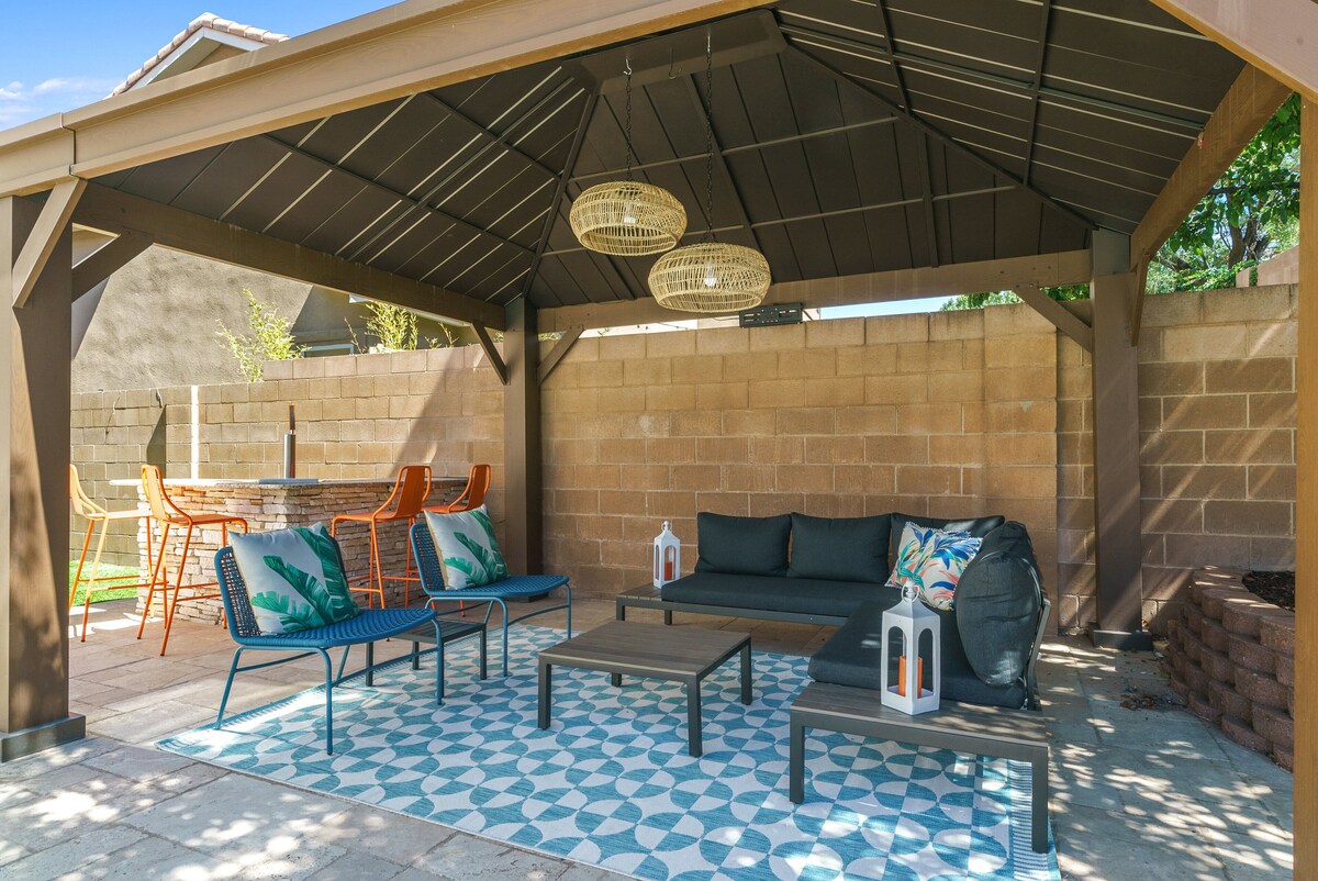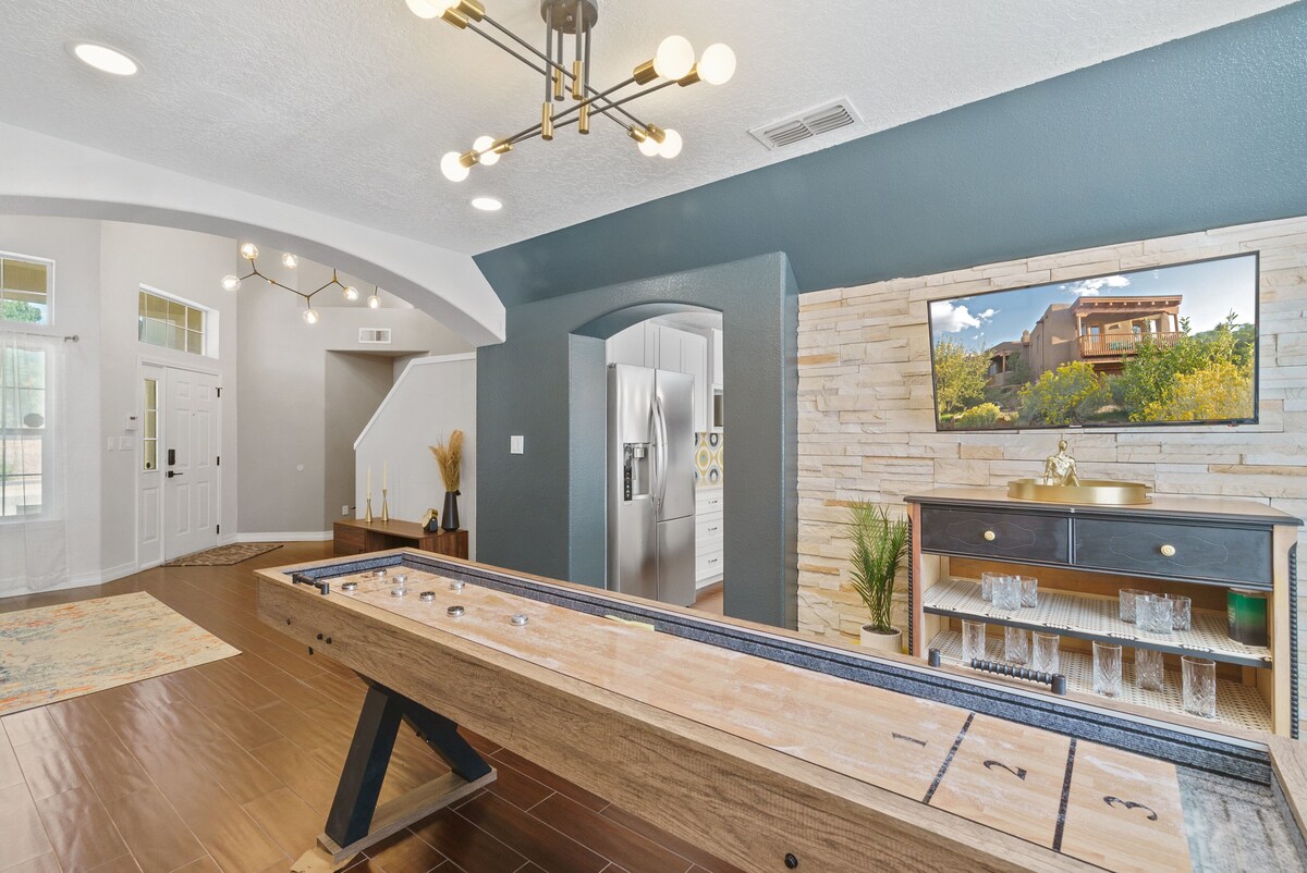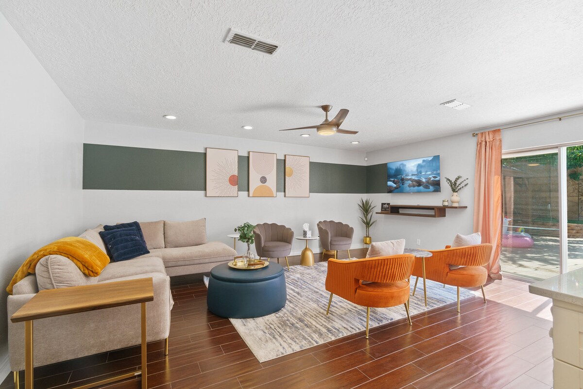 Come experience our mid-century modern oasis. Many guests comment on the peaceful energy of our space as it lends itself to total relaxation. Our home is expertly designed for our guests to experience total serenity paired with functionality. The hot tub is open year-round. The pool is open from April 1 - Oct 15. The pool can be heated to 85 degrees for a fee of $65 per day. The top features of our space include: • 5 bedrooms/6 beds/3 bath • Impeccably designed backyard space with pool/hot tub/lounge space/ putting green and much more • Recently renovated with high-end features and a mid-century modern design • Fully stocked kitchen (and if we don’t have it, we will get it for you) • Game room including Shuffleboard/arcade game/bar area • Office space Other amenities include: • High-speed Wi-Fi- • TV- with access to all major subscription services • Central heating and cooling • Ironing board and steamer • Washer and Dryer • Hair dryer • Basic toiletries provided (shampoo, conditioner, body wash) • The garage can be used for secure parking • Record player • Island Seating • 8-person dining table • Outdoor Grill House rules and info: PARTIES ARE NOT ALLOWED. It is also important that we let you know that we are located in a HOA residential neighborhood and PARTIES ARE NOT ALLOWED. Outdoor quiet hours start at 8 pm. This does not mean you can't be outside past 8 pm it just means that the sound level has to be minimal out of respect for our neighbors. Music is NOT allowed outside at any time. Only 4 cars are allowed onsite. If you do not follow these rules then the neighbors will call the cops and then I will be forced to have you evicted. Also, I have outdoor cameras on site so if I see these rules not being followed I will have you evicted. If for some reason you aren't able to follow these rules please let me know now and we will be glad to refund you in full. . The hot tub is open year-round. The pool is open from May 1 - Oct 15. The pool can be heated to 85 degrees for a fee of $65 per day. Please be aware our pool company will allow themselves into the backyard to service the pool at any time without prior warning or consent. Up to two dogs are allowed at our house for a 200 fee. Unauthorized dogs on the premises will be subject to a 500 fine. Pets must be trained and can't be left outside unattended. Pets are not allowed upstairs. Pets can absolutely not be barking in the backyards or cause a disturbance to our neighbors. Guest must pooper scoop before leaving. Check-out time at 10 am is strictly enforced to ensure we have enough time to prepare the home for our next guest. Our cleaners will arrive promptly at 10 am. Please be aware we do have a Ring Security flood light mounted in the front of the house for our safety and security and yours. This is also a vital tool for ensuring the home is prepared before you arrive. Our prices include all fees. No hidden fees.