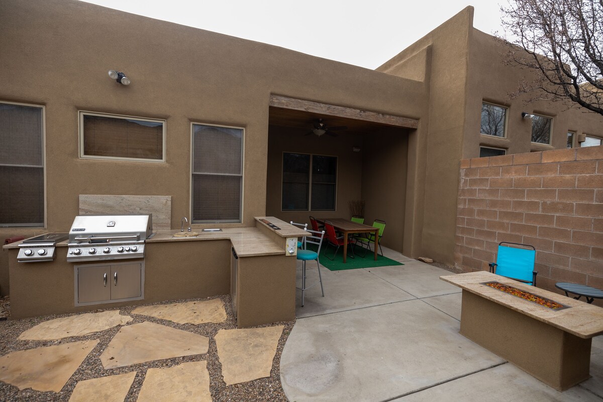 Bring family and friends to this 3 Bedroom, 2.5 bath updated home with a full outdoor kitchen and fire table. Everything you need including 3 HD TV's with antennas and 2 Apple TV's. NEW double ovens, frig, micro, & heating/cooling systems. Walking distance to running/hiking trails. Close to the Sandia Peak Tram, Sandia Casino, Balloon Fiesta Park and golf courses. Plenty of restaurants, wineries and breweries to choose from. Large upstairs balcony with great sunsets. 2 car garage access! 2 parking spots on the driveway. Additional street parking on quiet cul-de-sac. One dog 20 lbs. and under allowed for a fee.