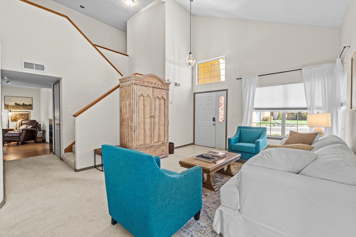 Book with confidence! Location,Location!! This family friendly, beautifully designed home is situated in the safest and most sought-after part of town in Northeast Albuquerque, New Mexico. located within a half mile from Paseo Del Norte, this home is in a gorgeous neighborhood that is not a through street- so it is very peaceful and truly a hidden gem close to everything you need! On Paseo you can find tons of restaurants, entertainment, shopping, grocery stores, etc. The homes location is also prime to traveling to Santa Fe, balloon fiesta park, hiking and biking trails, and nearby Sandia Resort and Casino with golf/spa/dining all within a very short drive This hidden gem neighborhood has its own park just steps from the front door. Every space was designed with you in mind! This home is within walking distance to great restaurants, bars, and entertainment. Conveniently located off Paseo Del Norte/ this home is easy access to freeway-close to tons of grocery stores, gyms, places to eat, and more! Trader Joes, whole foods, target, and a ton of restaurants under 2 miles away You will fall in love with this french country style home where no detail was left out. From name brand mattresses to baby gates- we want you to feel at home. Don’t miss out- book now while you can! The space As soon as you walk through the front door- you are greeted with a gorgeous French country style living room and dining table- the perfect place for conversation or sleeping on the queen size sofa sleeper watching television from opening the rustic armoire. With high ceilings and a light and bright feeling, you won’t want to leave! The den is the perfect place to relax and unwind with company- right off the kitchen with an open concept feel- everyone is together. Sit back and enjoy a glass of wine as this is the space to gather. The sunroom off the den doubles as extra sleeping with a comfortable trundle bed pull out and whimsical feel that anyone can curl up and read a book in. Upstairs each bedroom has been specifically designed for both comfort and function. **please note** one bedroom is a sunroom located off the den- it has its own private doors and is a trundle bed pull out** with black out curtains! The master bedroom has a temperpedic mattress, and comfortable bedding as well as blackout curtains. With high ceilings, and lots of space this is truly a retreat. The closets have ample storage for all your belongings. There is a private balcony off the master and full size bathroom. Smart tv as well! The two guest bedrooms are comfortable and cozy! The first guest bedroom has two twin beds- great for kids or adults alike! As well as black out curtains and a Smart TV for entertainment. The other bedroom has a queen size bed with temperpedic mattress and black out curtains, beautifully designed for you to enjoy. The fourth room is located downstairs off the den. The sunroom has a daybed pull out, with its own privacy doors -trundle pullout is two twin beds.** If you have kiddos- don’t forget the kids closet! Under stair closet allows your kids their own little area with glow in the dark painted stars, kids books, puzzles and more! We have thought of all your needs- the garage has a brand new pack n play, stroller, and baby gates. Your kiddos will love this home and the short walk to the park! If you have pets- we also provide dog bowls, a leash and a small dog bed if needed:) The outdoor area transports you immediately to a relaxed state with gorgeous landscaping, rose bushes, and a one of kind mural that you can really enjoy. Come enjoy the BBQ grill and outdoor firepit seating under a covered patio! Just a short walk from the front door- is an amazing park/playground- and walking trails attached-great for kids and pets alike This location cannot be beat!!Conviently located right off Paseo- you will be short distance to many family friendly restaurants and great attractions. Guest access the home has its own check in- PIN code front door. No key needed! Garage can also be used for parking Other things to note One bedroom is a sunroom located off den with twin trundle pull out! The other sleeping option is a queen pull out sofa in living room besides the designated 3 bedrooms upstairs Conveniently located right off Paseo Del Norte- close to everything you need! This home is in a hidden gem neighborhood with its own park just steps from the front door. The perfect place for family and pets alike Our prices include all fees. No hidden fees.