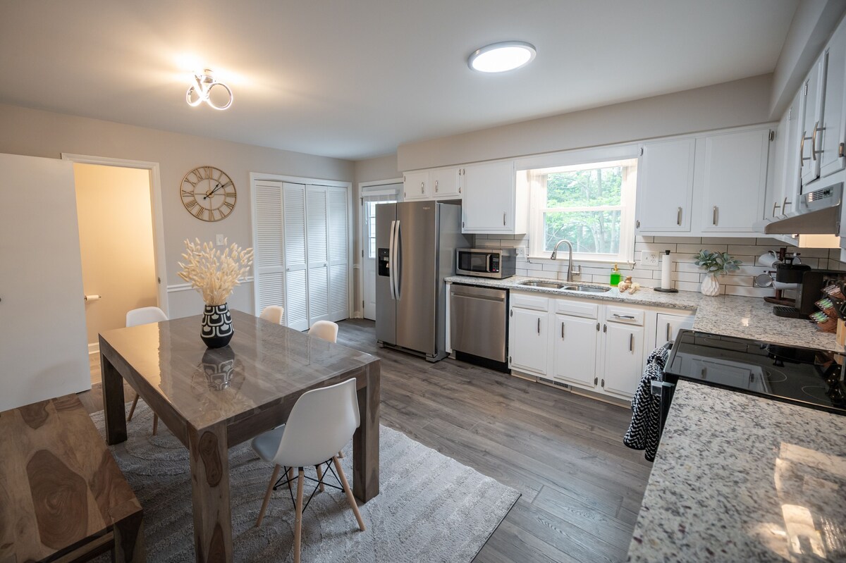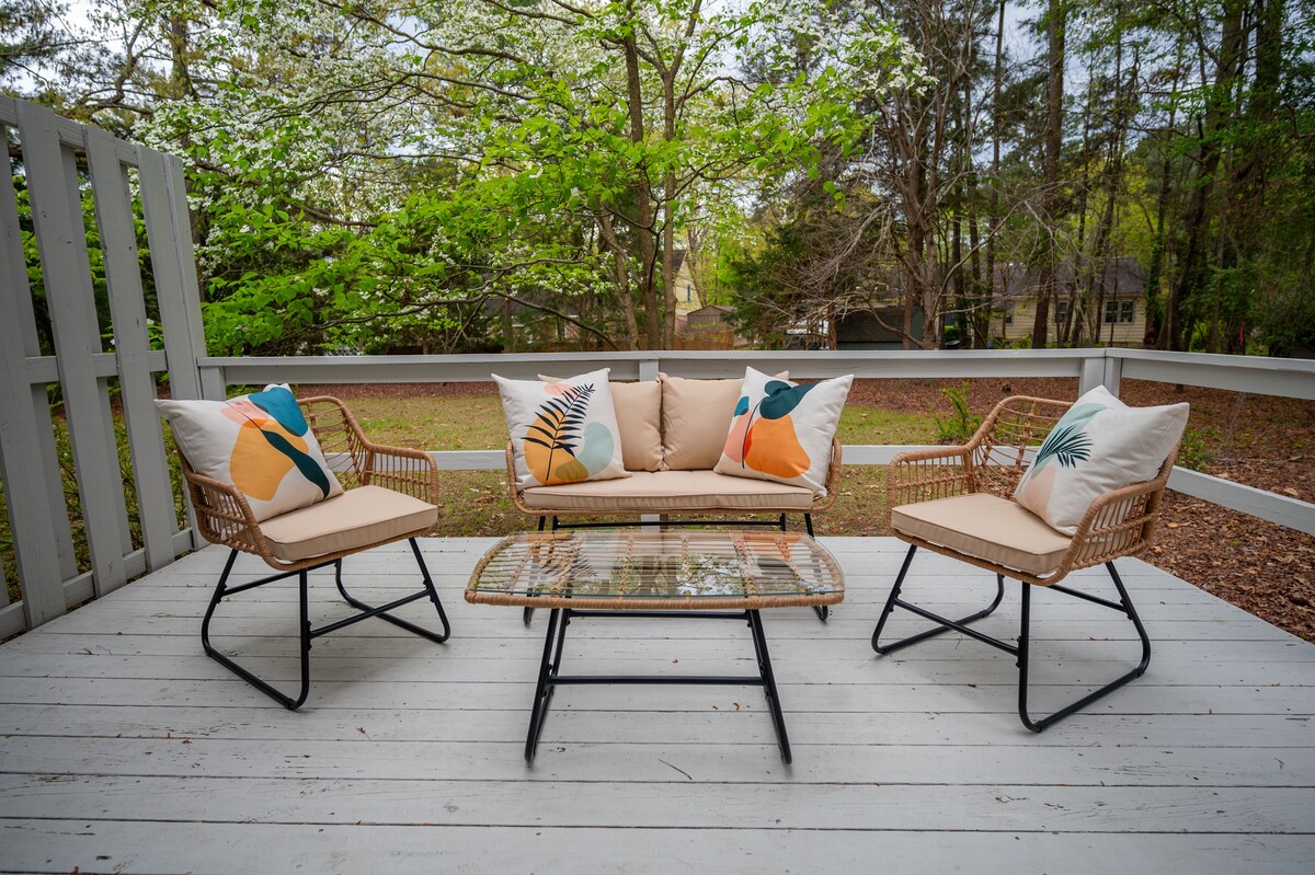Enjoy a stylish experience at this clean and quite 2-bedroom, 2.5-bathroom home 5 minutes from North Hills! Surrounded by Raleigh's best restaurants, shopping, and activities and minutes for HWY 540 and 440. Only 20 minutes from RDU Airport. Less than 15 minutes to downtown Raleigh, PNC arena, NC State University, and major hospitals. Extended Stay Monthly Leases/Or Longer Welcome. Our home is ideal for 4 guests, but we can accommodate up to 6 with the use of the fold down couches! Our place: Downstairs you will find a newly renovated kitchen with stainless steel appliances and a coffee maker as well as a cozy living room with a smart TV and two leather couches that convert to futons great for additional sleeping space for children. Board games, cards, and a puzzle can be found in the console table in the living room. Also downstairs is a half bathroom and laundry closet with a full-size washer and dryer. Off the kitchen is a large deck with outdoor seating and a lovely backyard great for yard games, pets, and children. Cornhole and Ladder Ball can be found in the outdoor storage room for your enjoyment. Upstairs you have a spacious king-sized bed with a large smart TV in one bedroom and a comfortable queen-sized bed in the other bedroom each with an ensuite bathroom. Pet Fee: The pet fee covers up to 2 pets! Please make sure your reservation is updated properly. If you are traveling with more than 2 pets, please reach out - sometimes we can accommodate an additional pet on a case-by-case basis for an additional fee. Thanks! Our prices include all fees. No hidden fees.